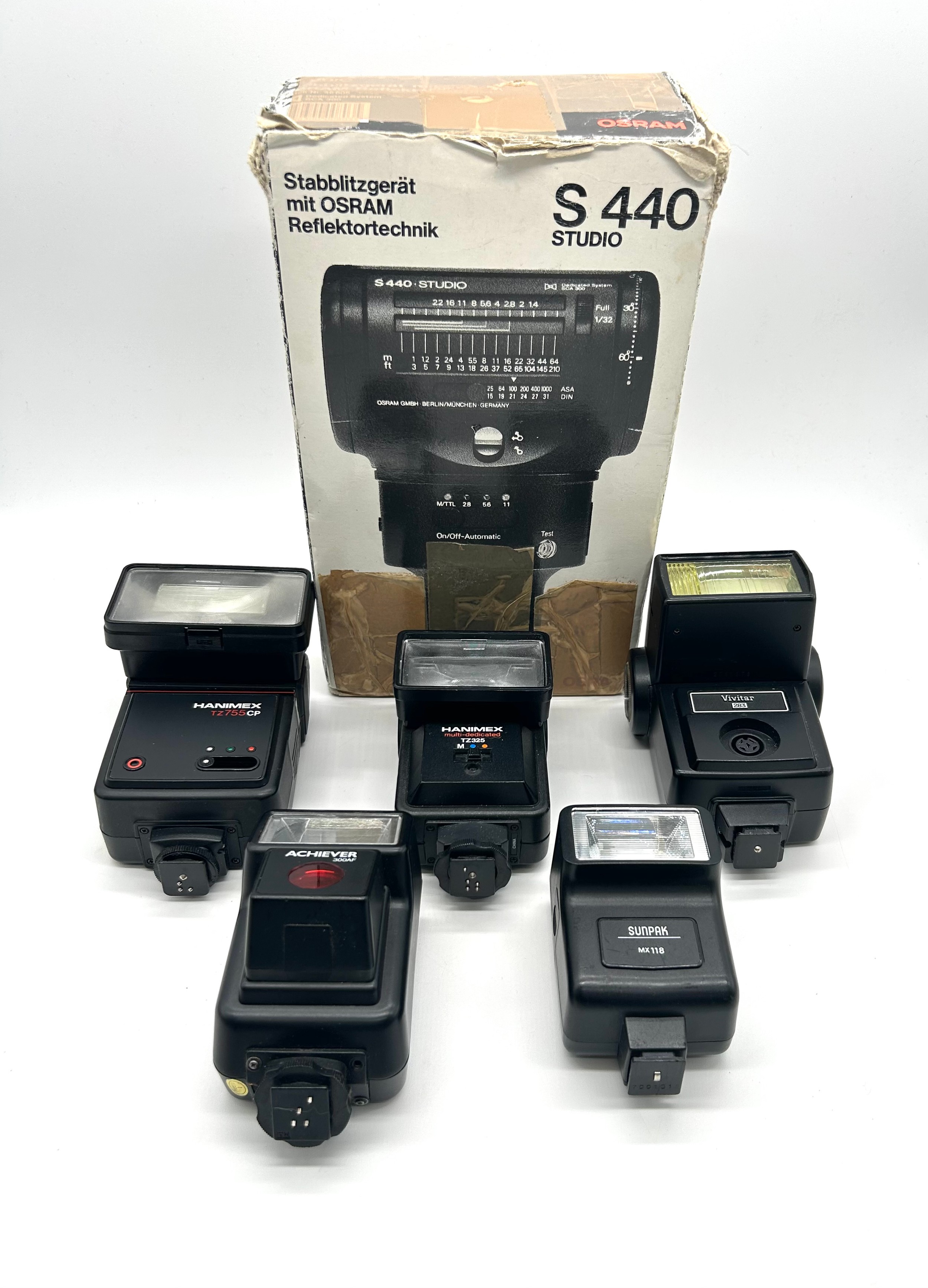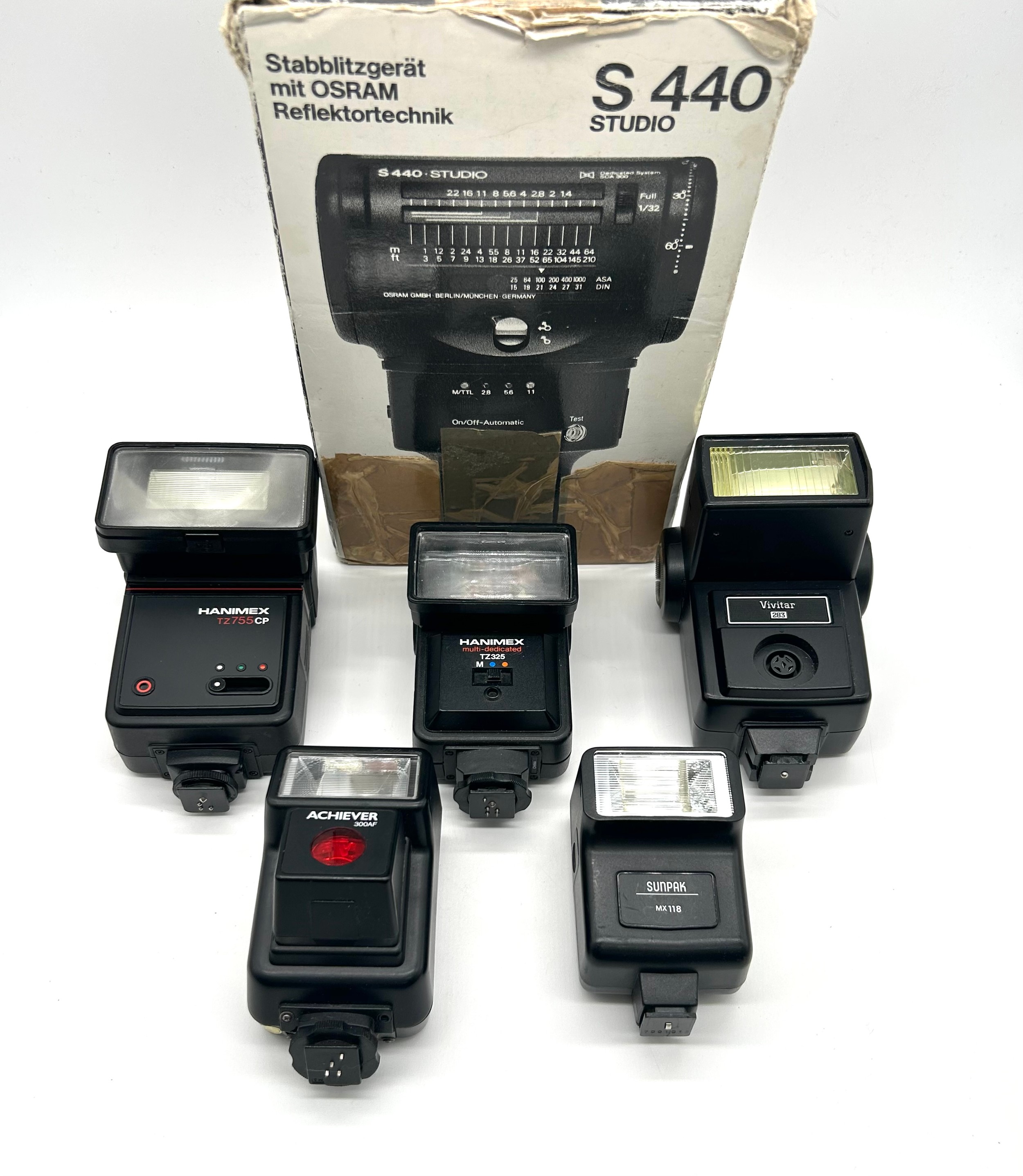 Boxed Osram S440 Studio Bounce Flash Unit, Sunpak MX118 Flash, Achiever 300AF Flash, Hanimex TZ755CP Flash Unit, Hanimex TZ325 Flash and Vivitar 283 Auto Thyristor Flash Unit. Minolta 5000 Camera with AF Lens 35-105 and Cobra Case, Minolta 500si Camera and Sigma Auto Focus Aspherical 18-35mm Lens