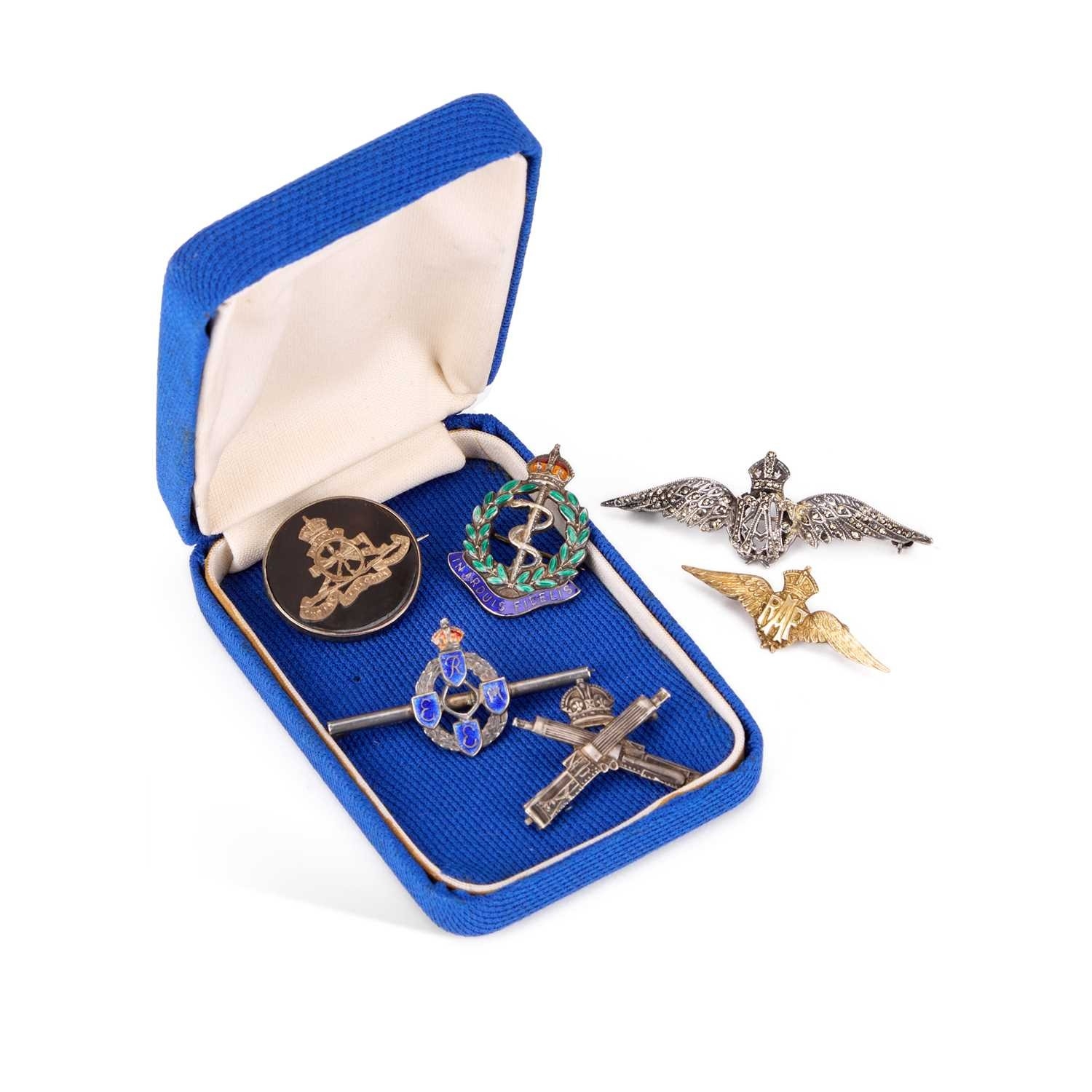 including a 9ct gold fronted RAF example, Machine Gun Corps, Royal Electrical and Mechanical Engineers, etc. (6) Largest 6cm wide, weighable silver 21.6 grams gross