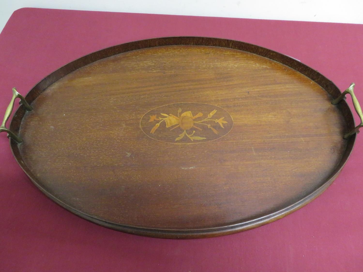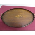 Edwardian oval mahogany tea tray with shell inlaid oval panel