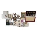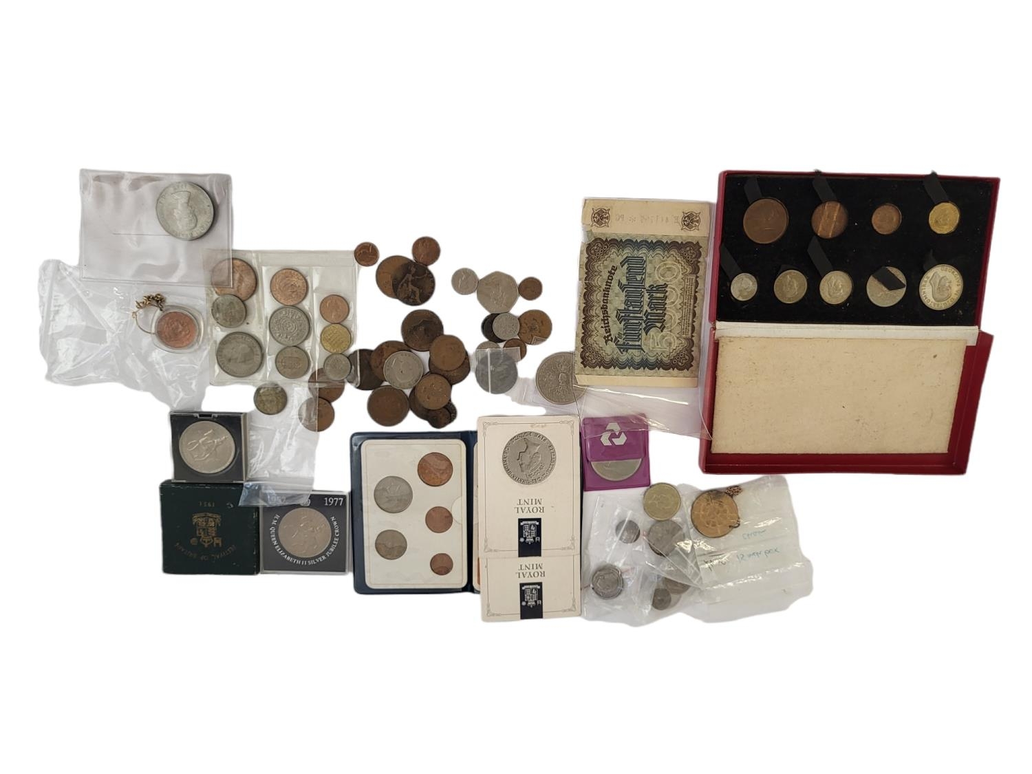 From half crown coin to one pence coin, in a fitted velvet lined box, together with a 1953 proof set, a 1990 five pound piece and a collection of crown coins including 1951 Festival of Britain and Silver Jubilee, together with a 5000 Mark German banknote.