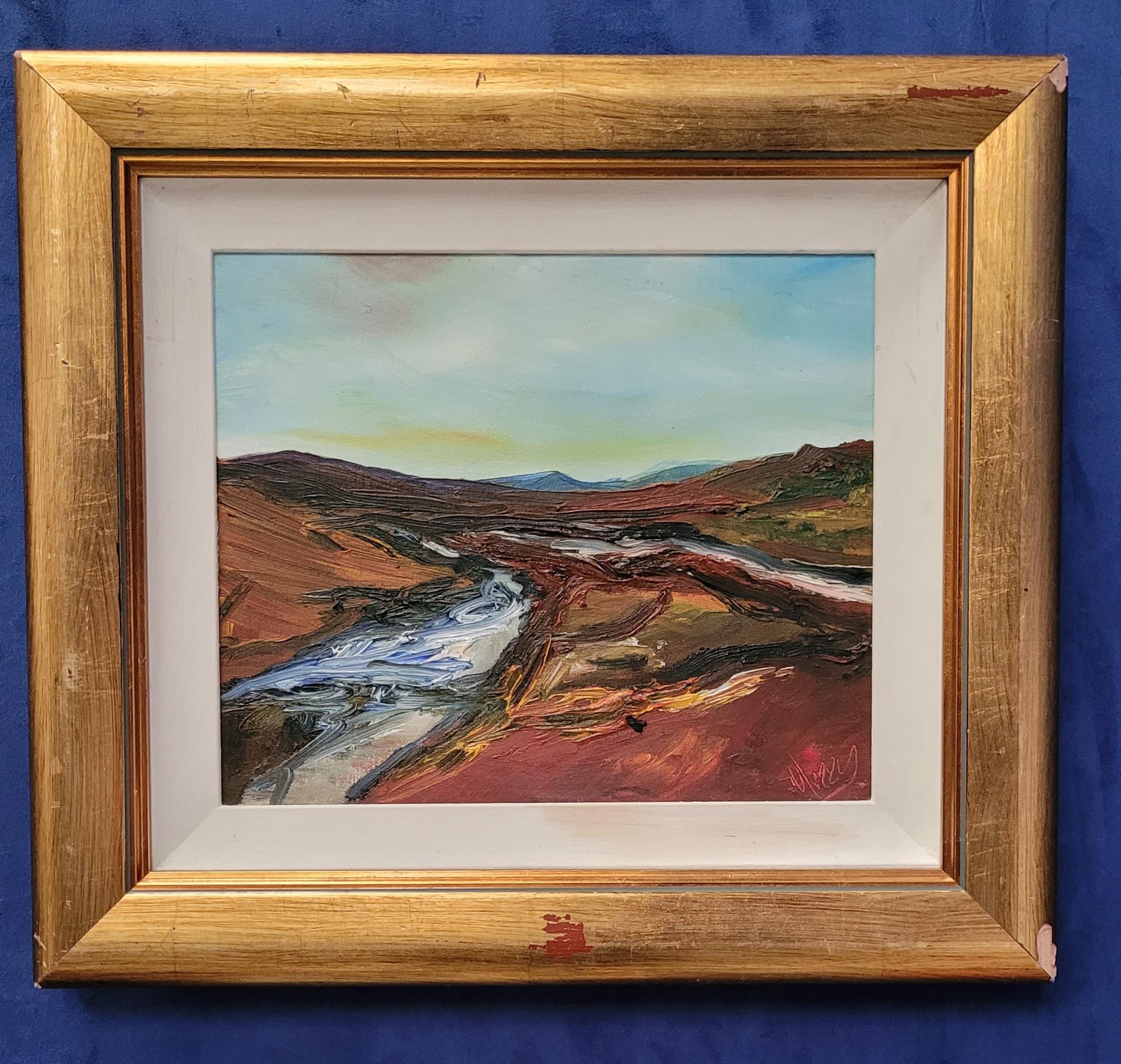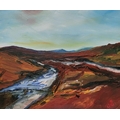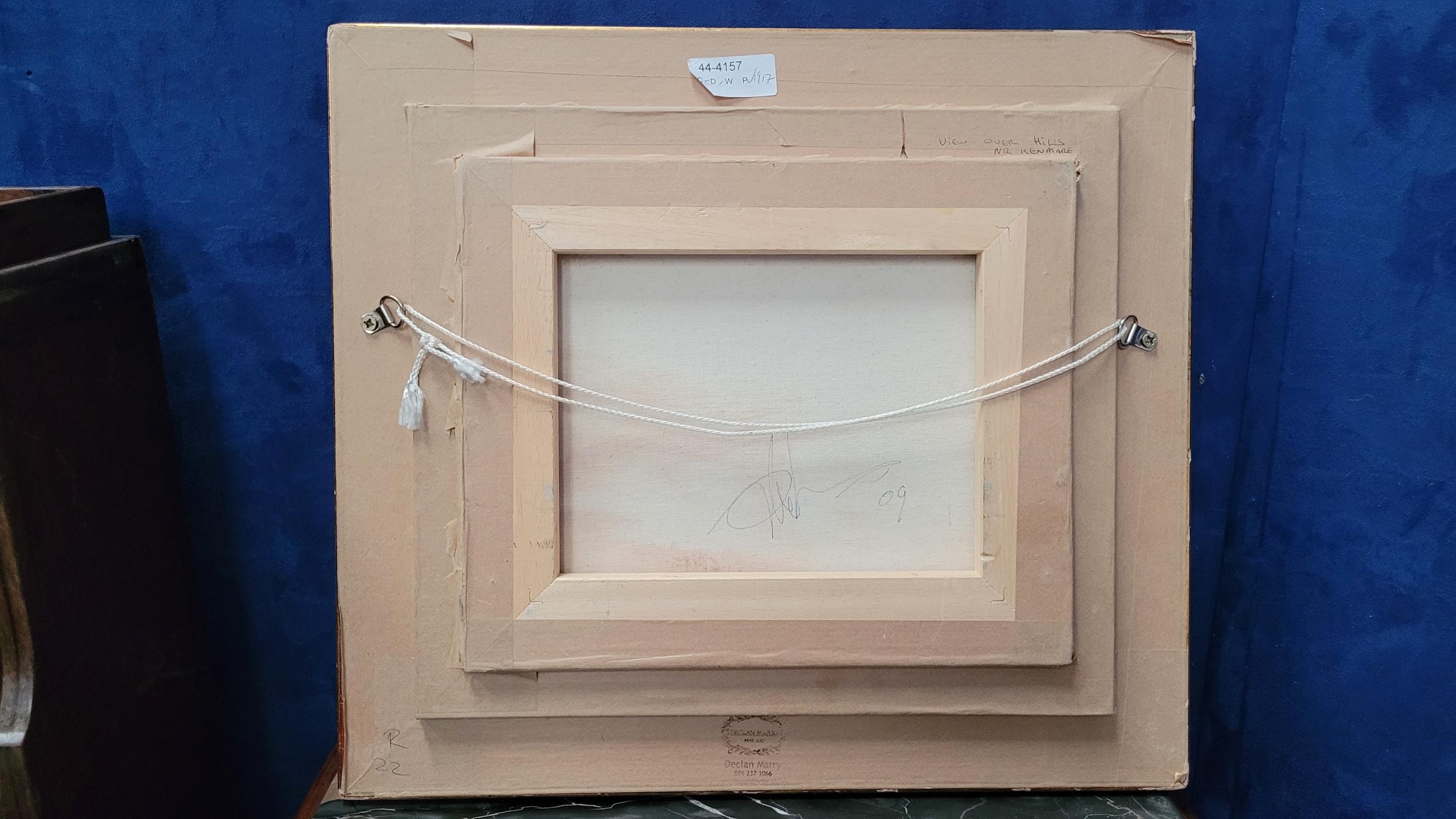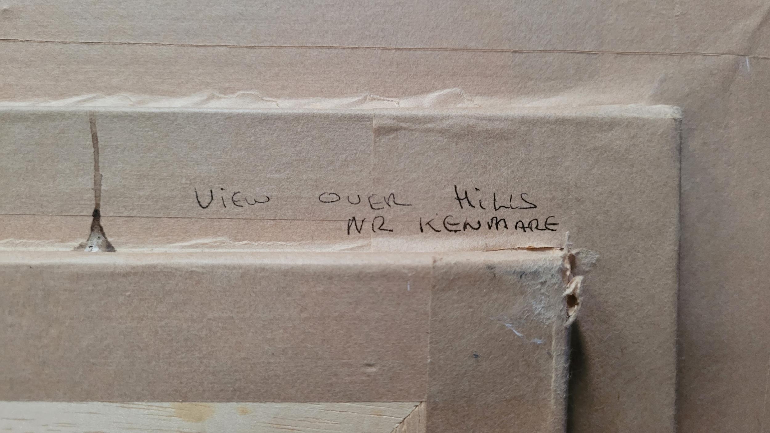 DECLAN MARRY, (20TH CENTURY, IRISH), VIEW OVER THE HILLS, near Kenmare. Oil on board, signed with inscribed signature lower right. Frame: 45 x 42cm, painting: 31 x 26cm.