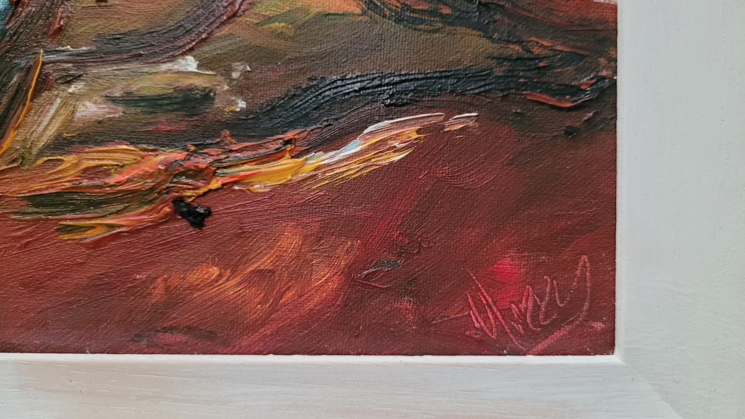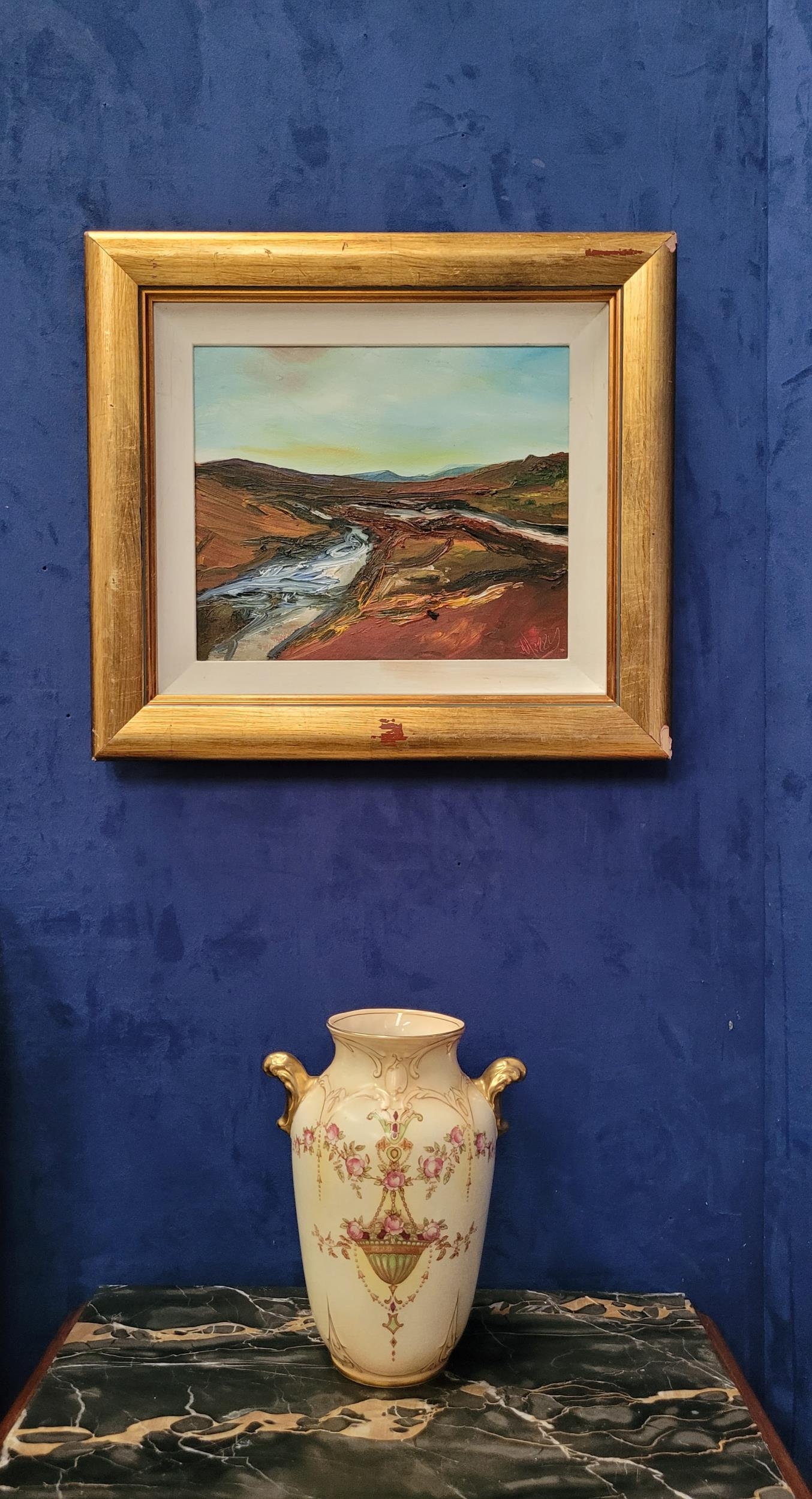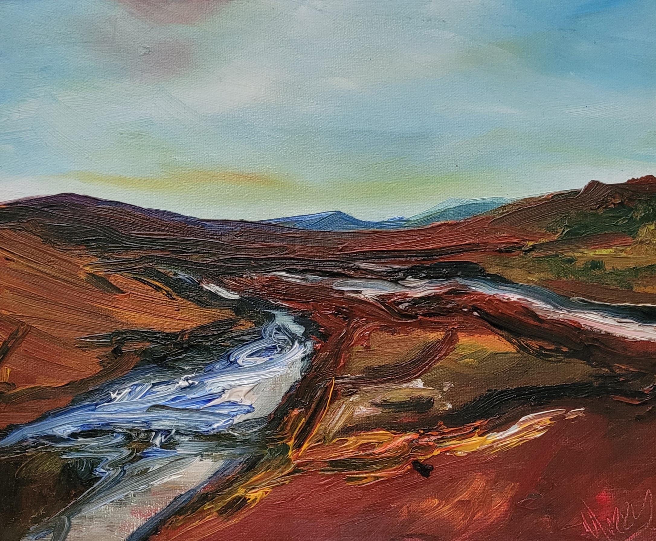 DECLAN MARRY, (20TH CENTURY, IRISH), VIEW OVER THE HILLS, near Kenmare. Oil on board, signed with inscribed signature lower right. Frame: 45 x 42cm, painting: 31 x 26cm.