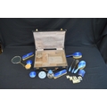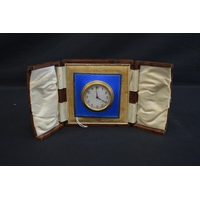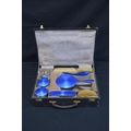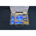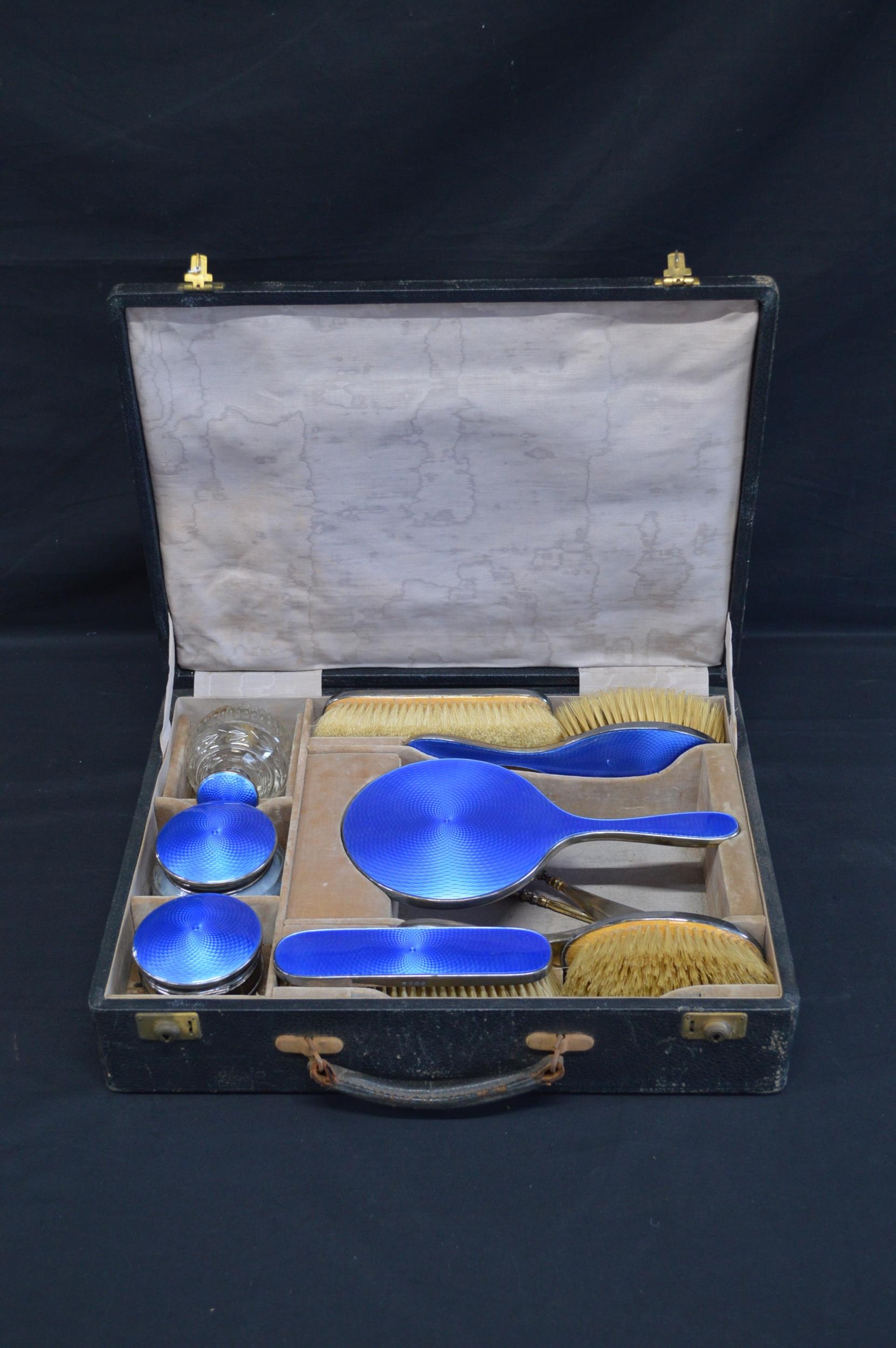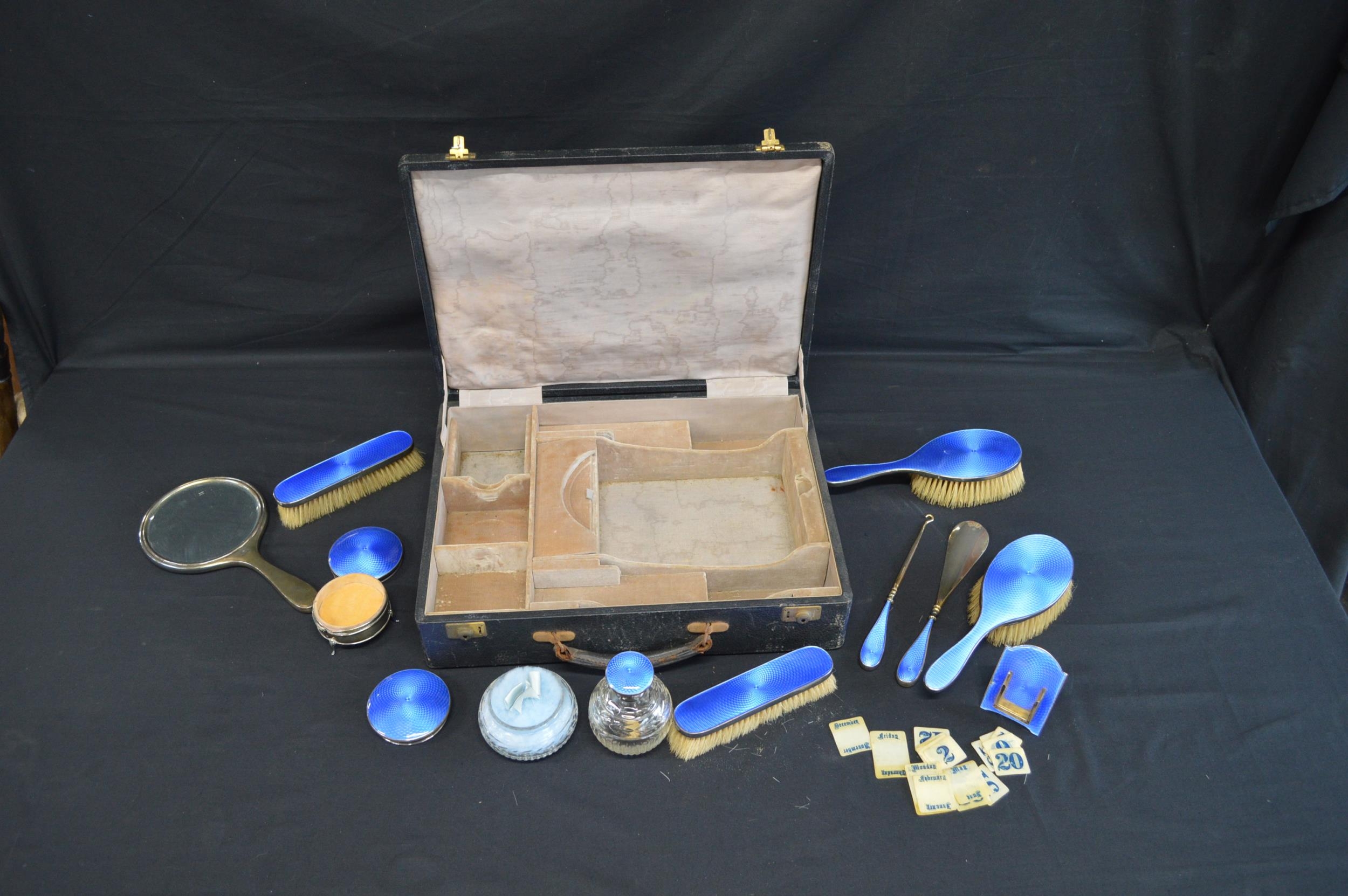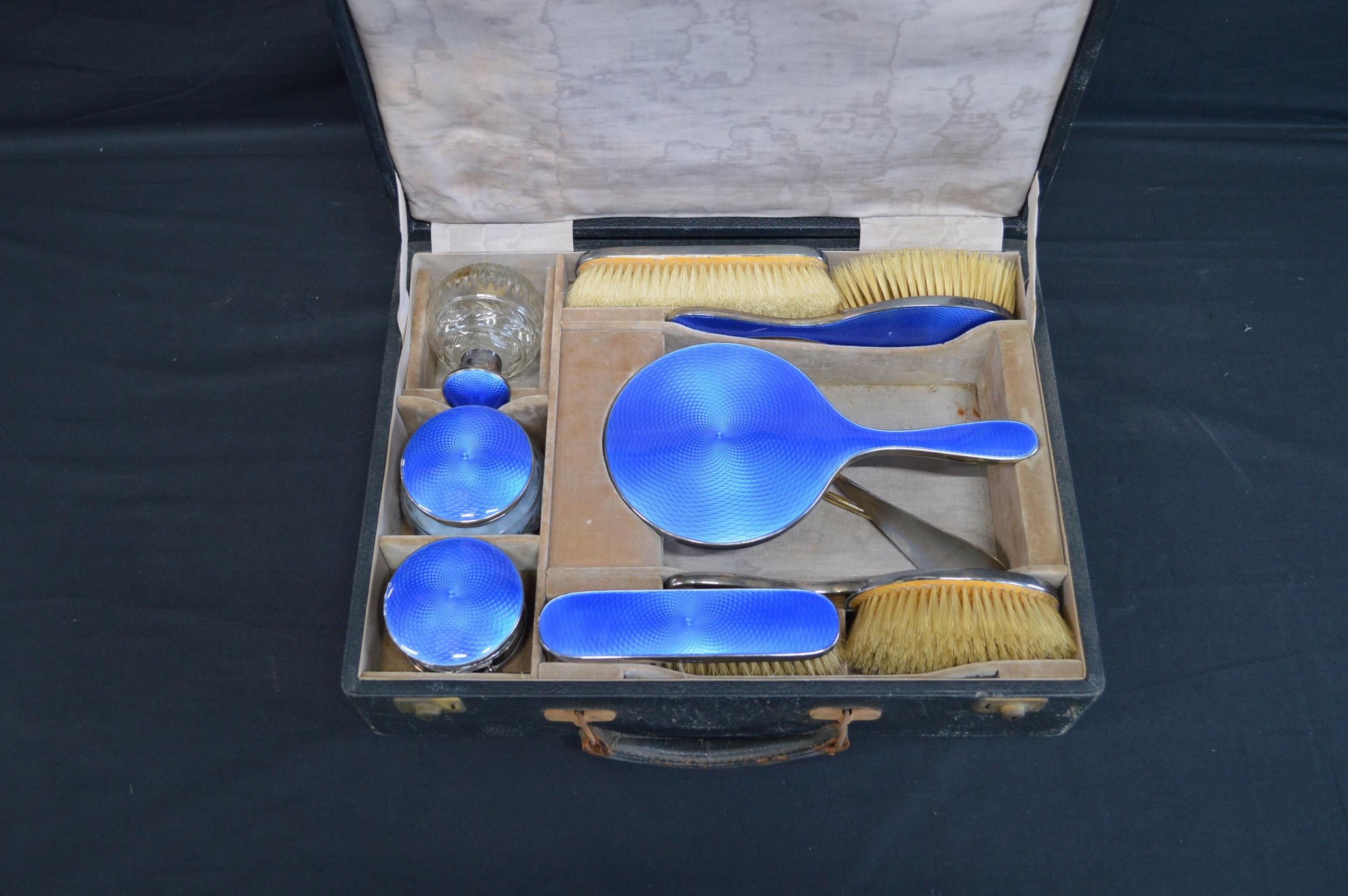 Cased silver and blue enamel dressing table set to comprise: hand mirror, two hair brushes, two clothes brushes, scent bottle (broken hinge), powder bowl, circular jewellery box (broken hinge), button hook and shoe horn, hallmarked for Birmingham 1925, Albert Carter