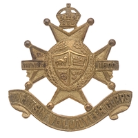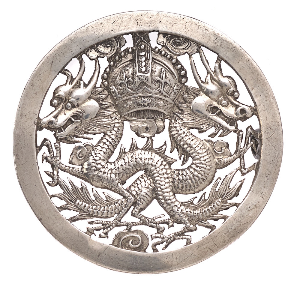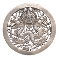 Hong Kong Volunteer Corps Scottish Company head-dress badge c. 1920-42. Good scarce die-cast local silver crowned crossed outward facing dragons within plain circlet. Chinese character to reverse of circlet. Loops. VGC
