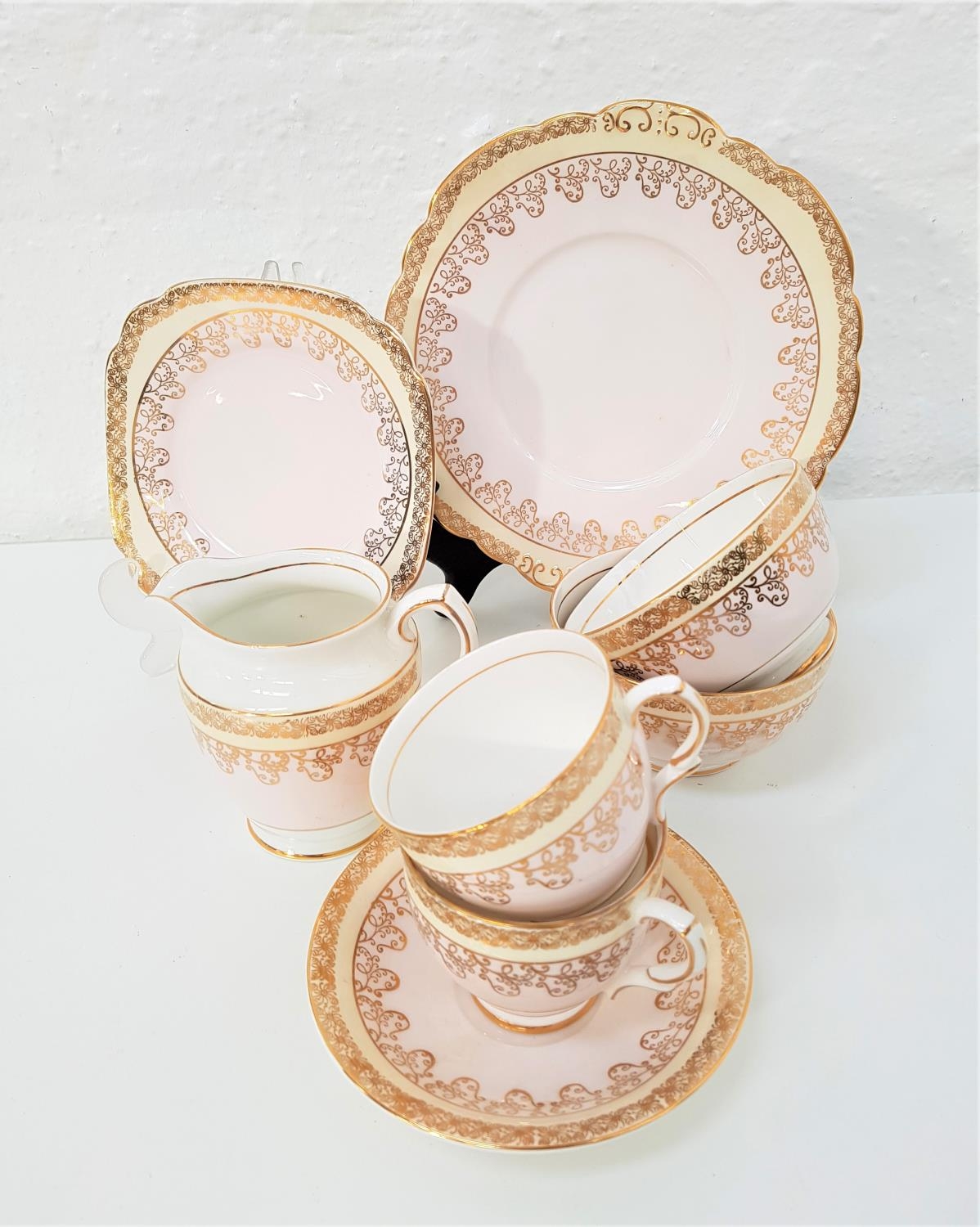 with a white and pale pink ground with gilt highlights, comprising twelve cups and eleven saucers, twelve side plates, two sandwich plates, two sugar bowls and a milk jug (40)