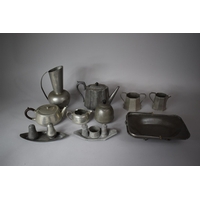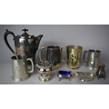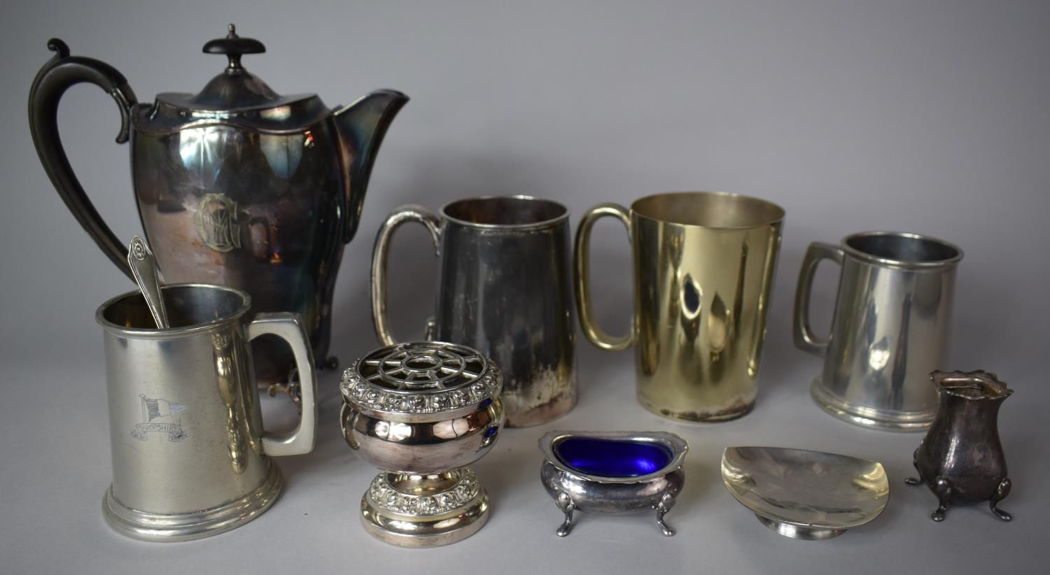 A Collection of Various Metalwares to Include Silver Plated Coffee Pot With Engraved Monogram, Stainless Steel Danish Pin Dish, Tankards etc