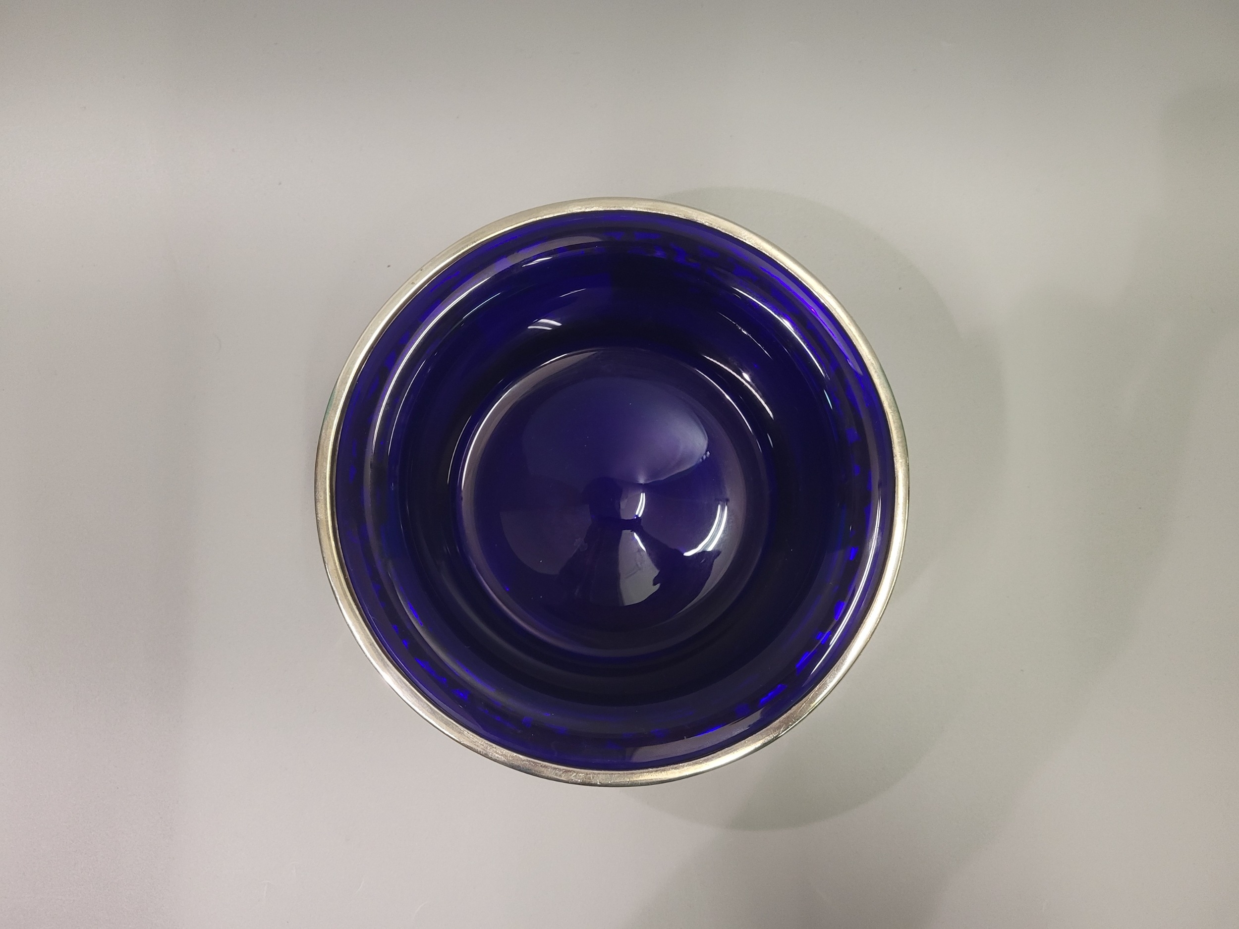 A VICTORIAN ENGLISH ANTIQUE STERLING SILVER (.925) CIRCULAR DISH/POTATO RING, London 1896, ca 8" diameter, with Bristol blue glass liner, 434 g.