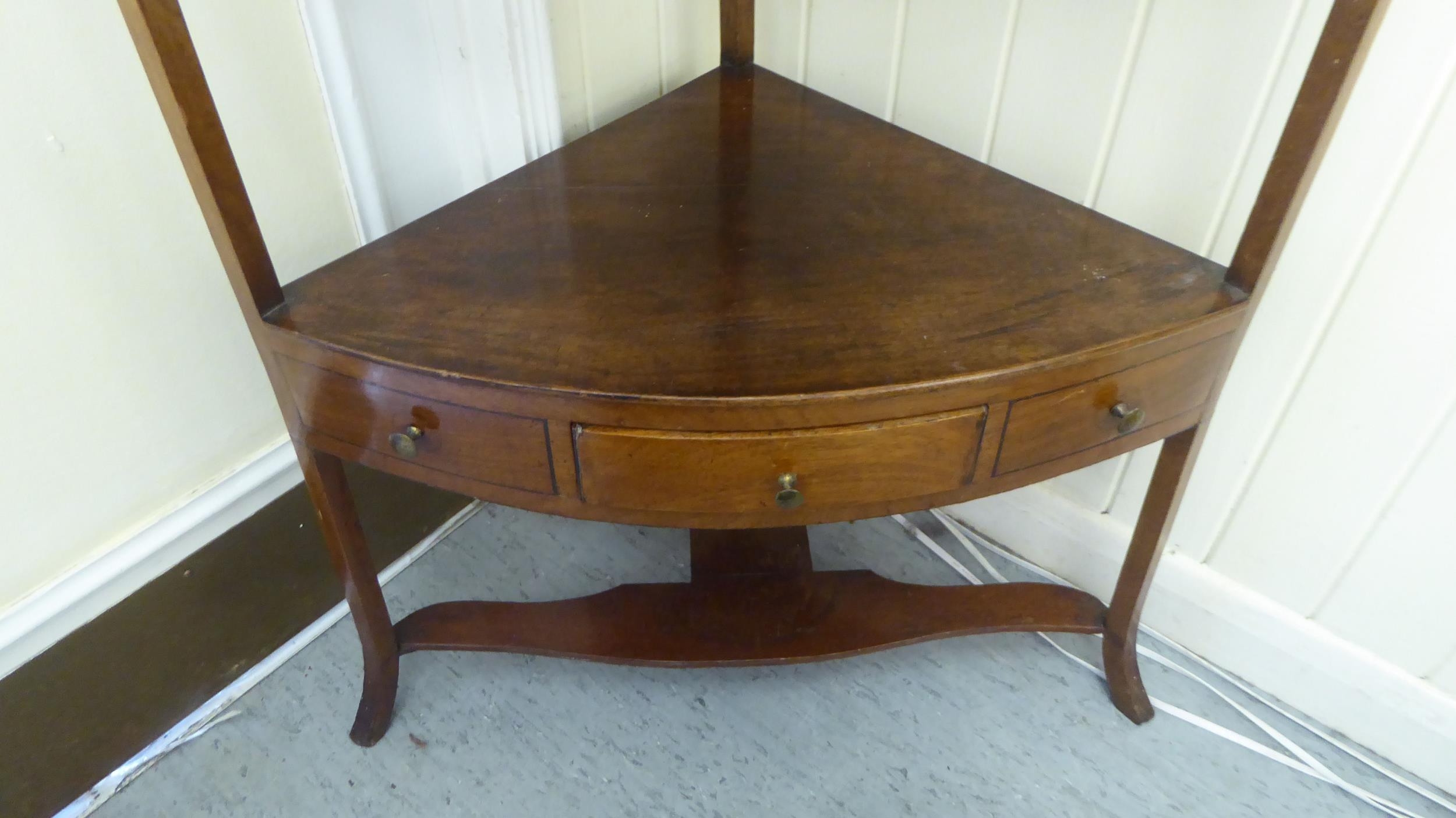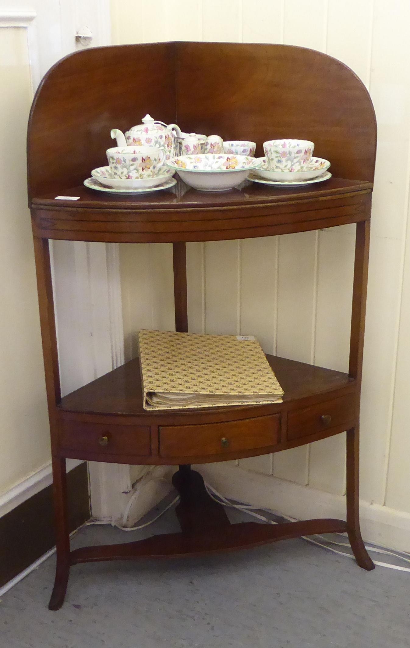 A George III mahogany two tier quadrant washstand, raised on splayed legs 40"h 23"dia
