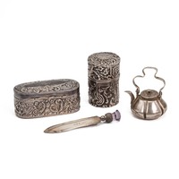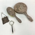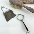 A silver vanity mirror decorated with winged Cherubs hallmarked Birmingham 1905, a silver hair brush, a white metal chainmail purse and Art Deco spring folding glasses.