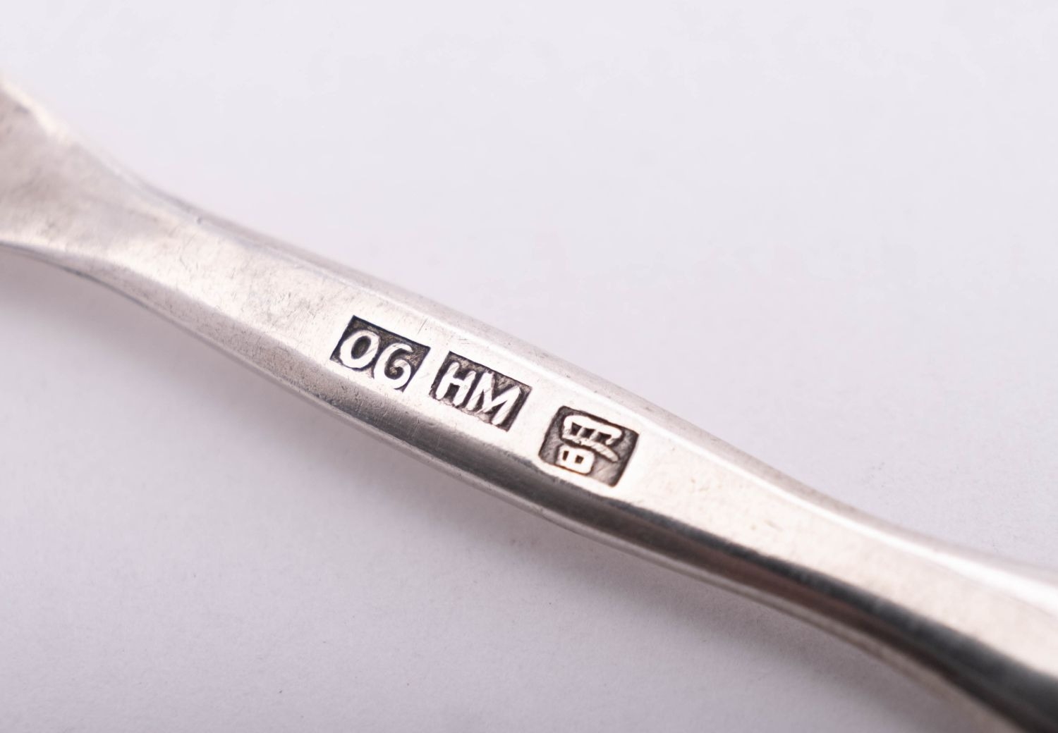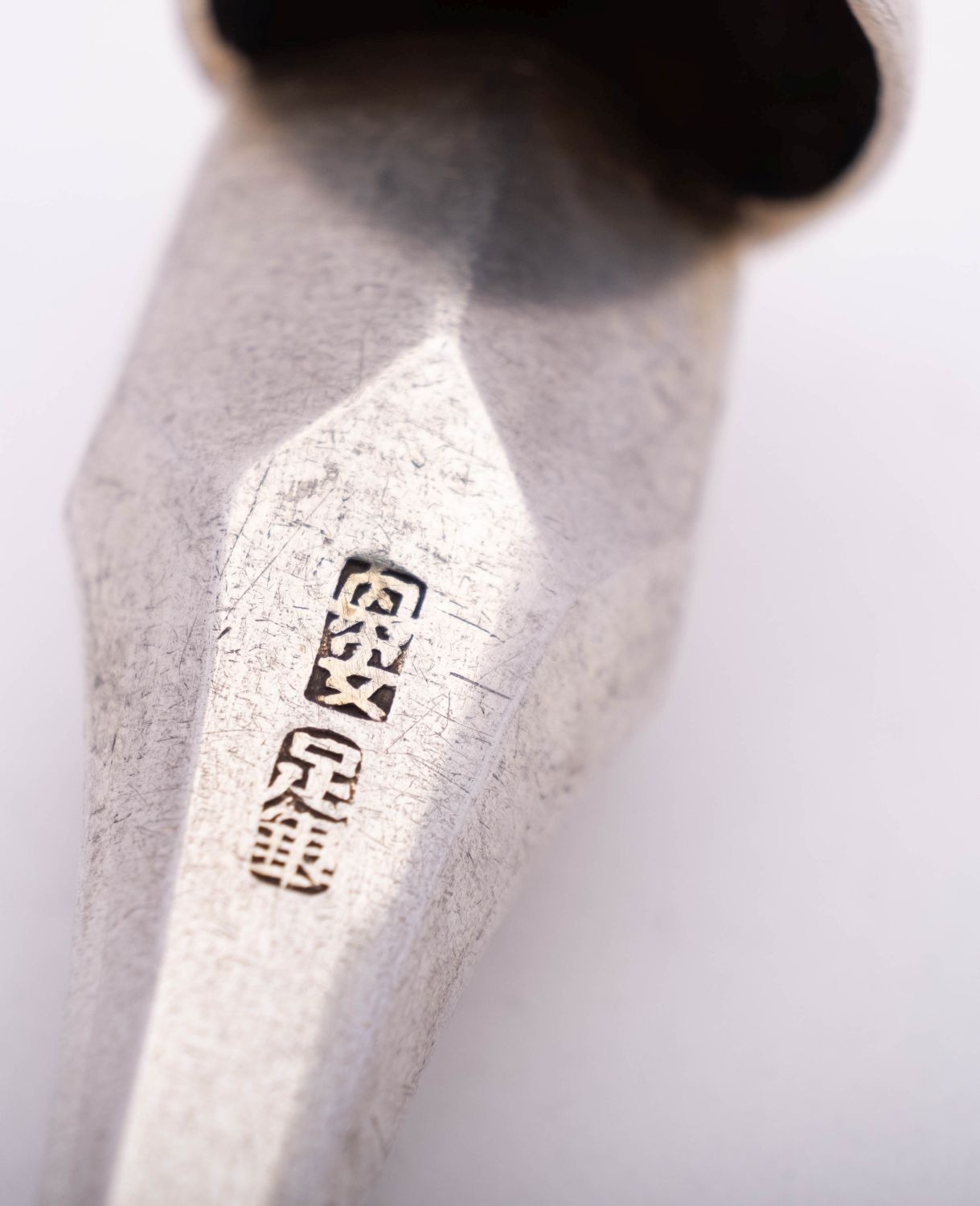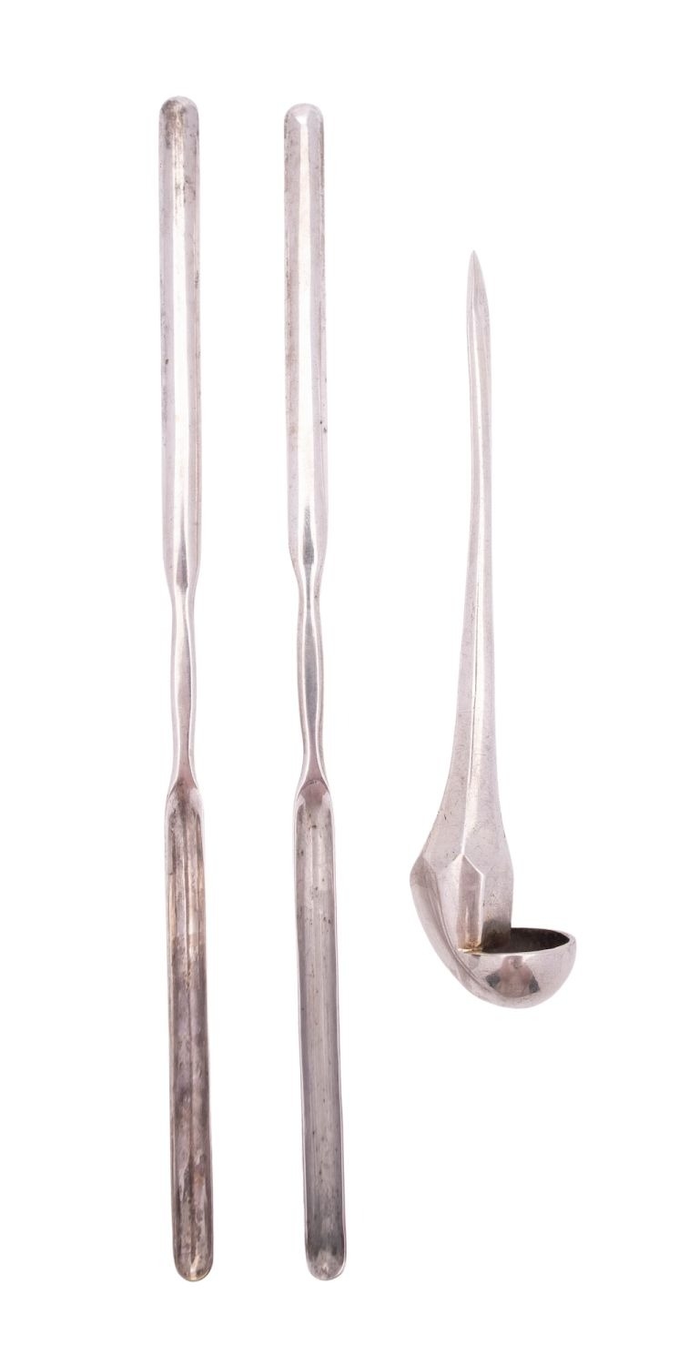 A pair of late 19th/ early 20th century Chinese silver marrow scoops, each with makers mark ''HM'' c.1900, together with a Chinese silver opium scoop, struck with two character marks, c.1800; the marrow scoops 8.3'' (21.2cm) long; 2.1ozt (3)