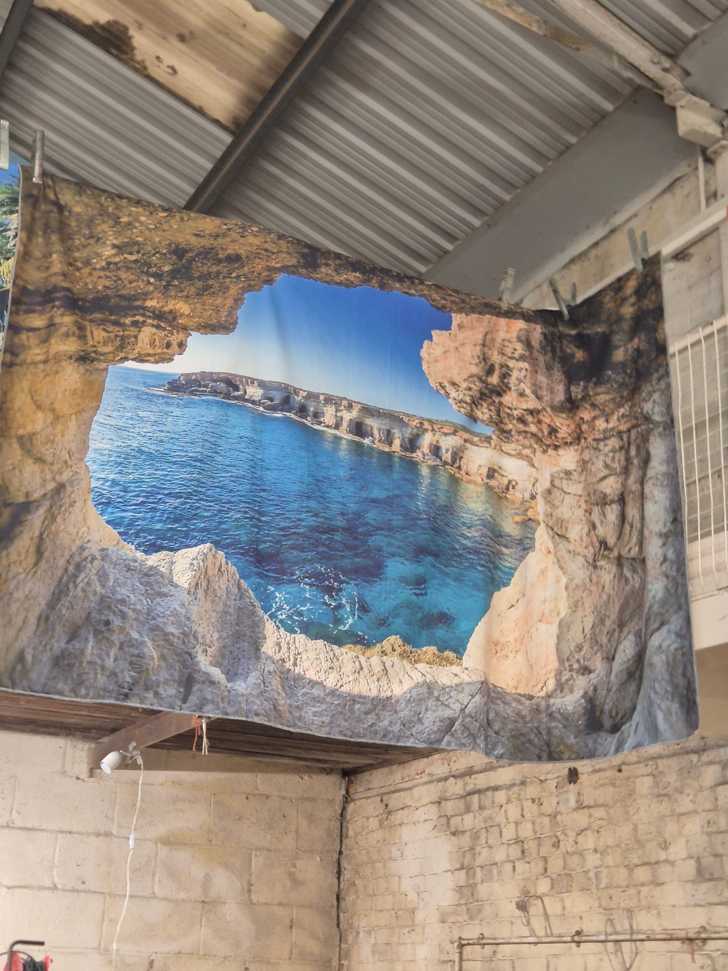 Large fabric photo backdrop of tropical cove scene
