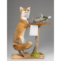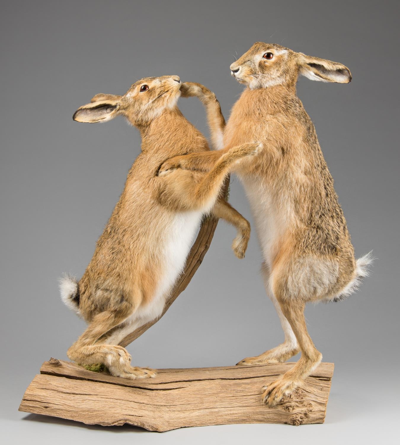 A PAIR OF MODERN TAXIDERMY BOXING HARES UPON A NATURALISTIC BASE. (h 74cm x w 70cm x d 25cm)
