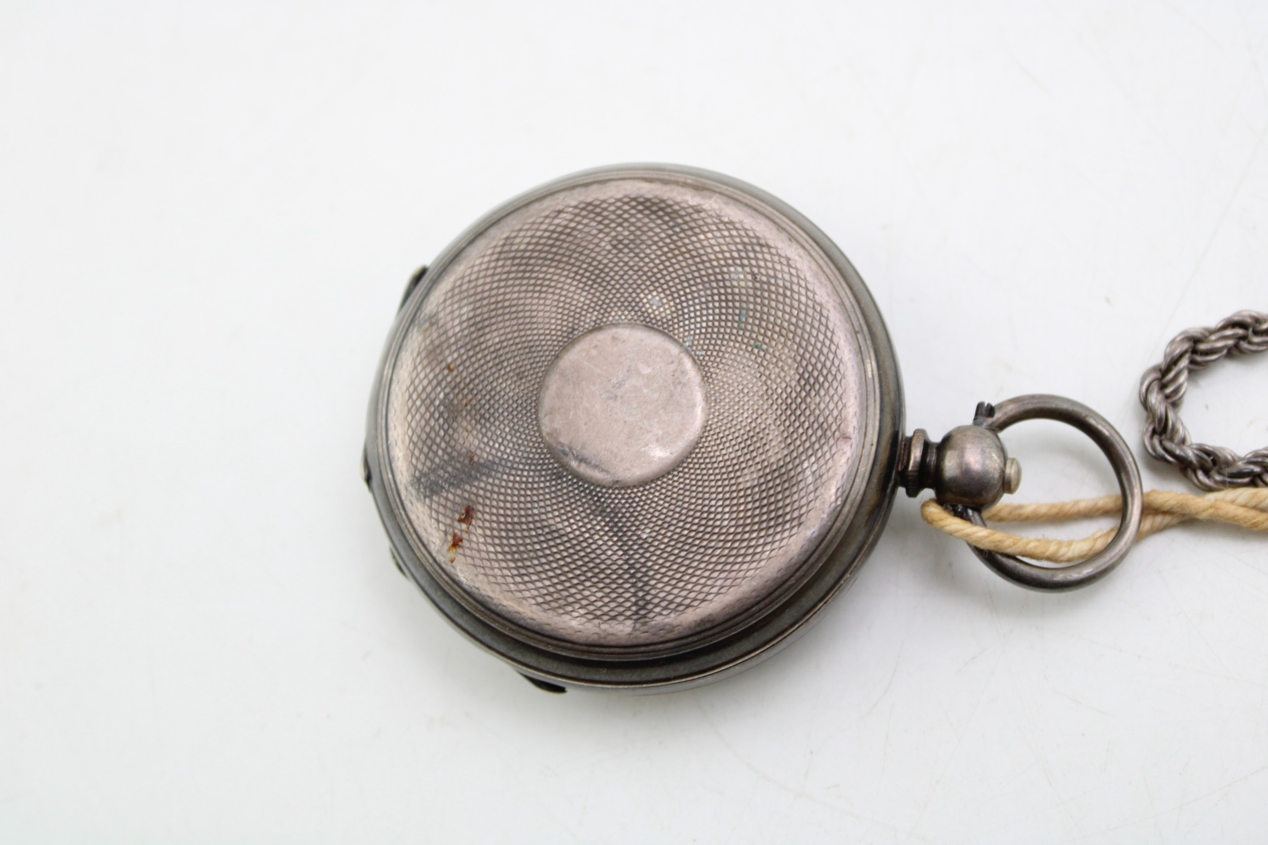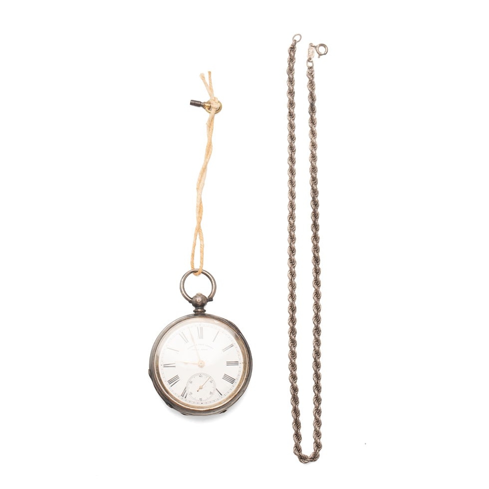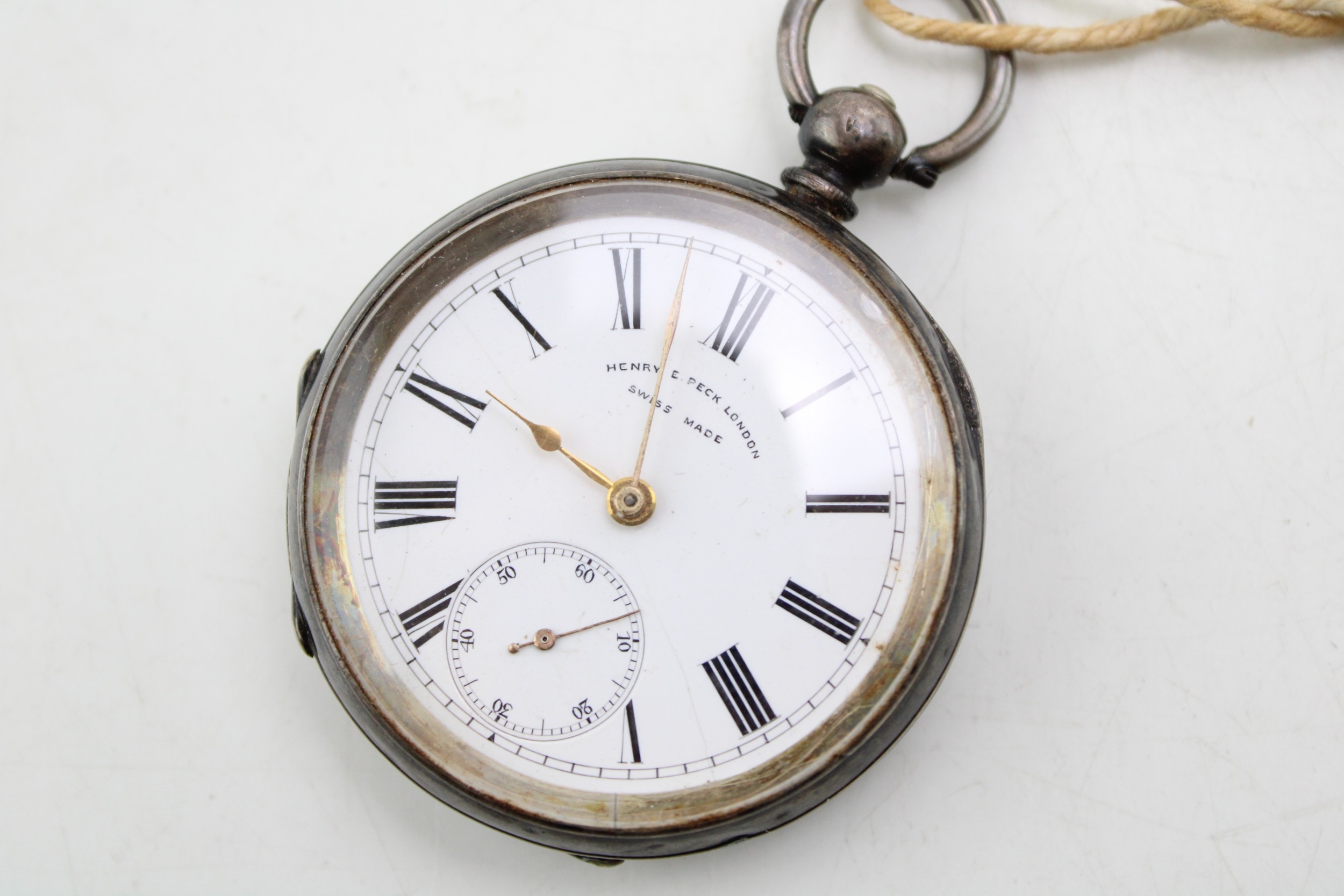 A silver 0.935 pocket watch, Henry Peck London to dial, gross 82g, with a silver rope chain, 8.5g, 42cm long.