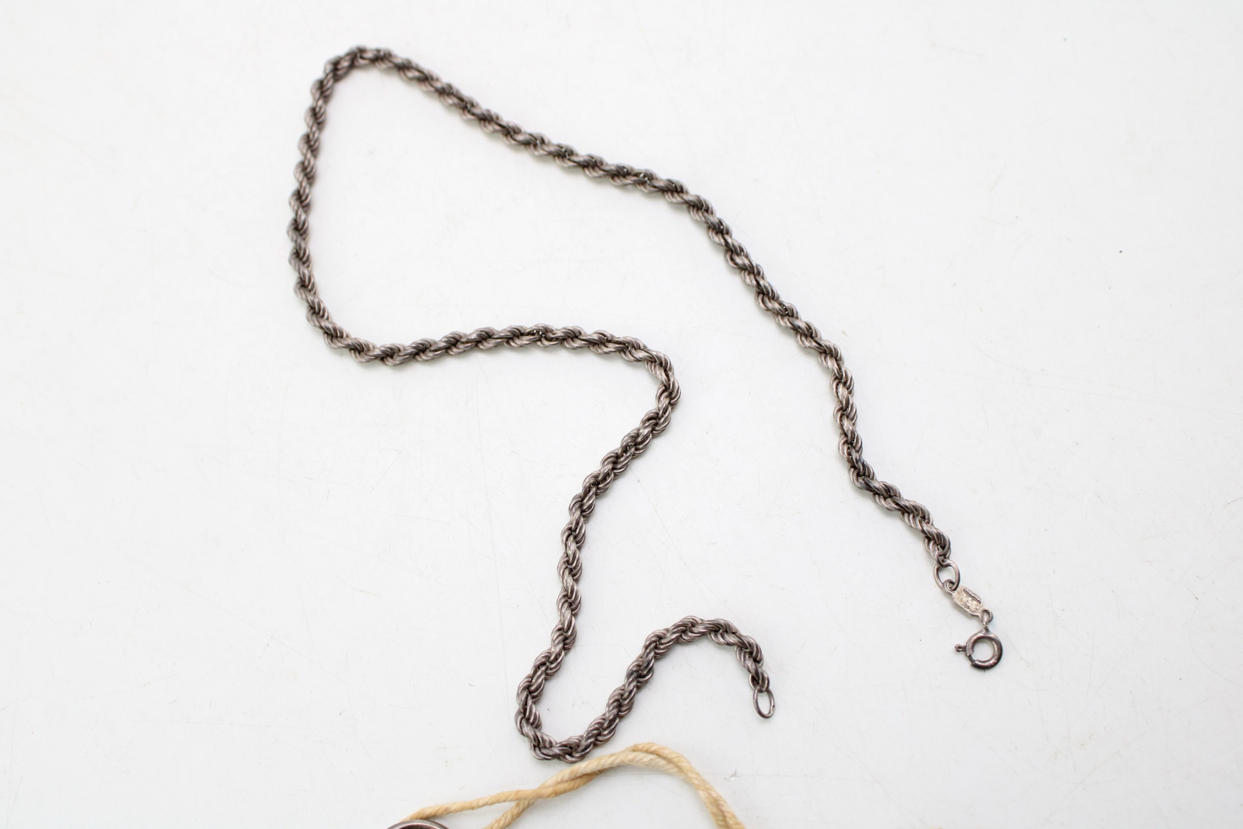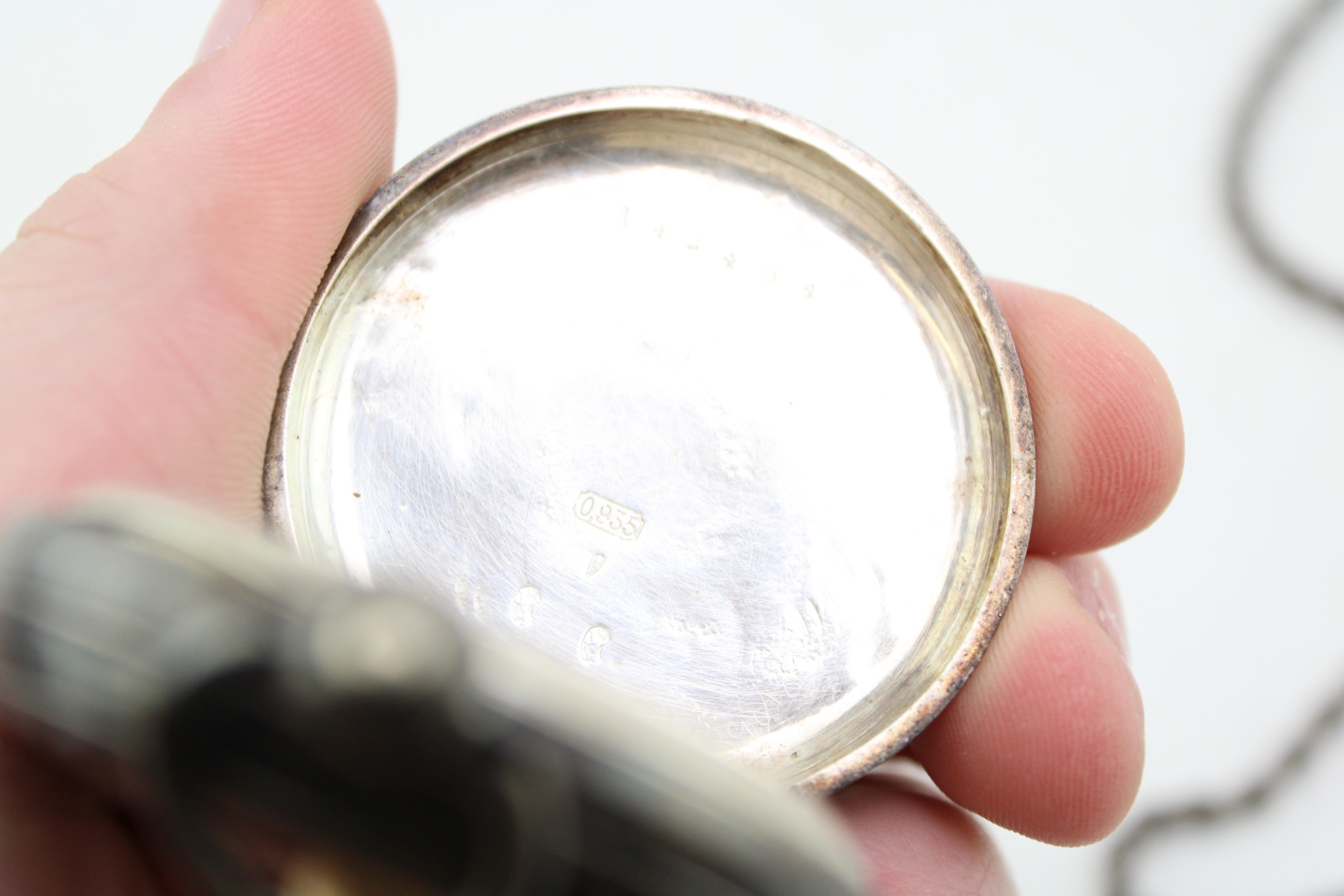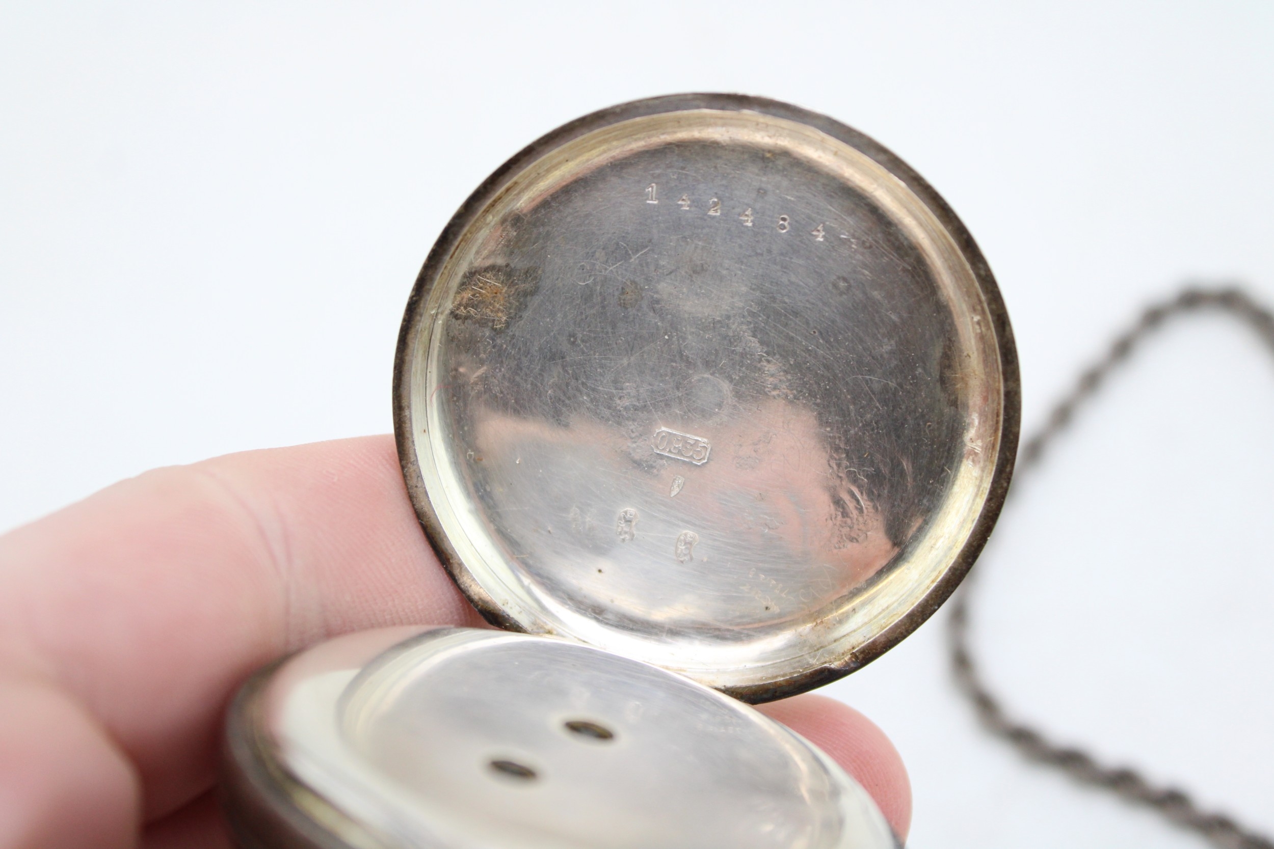 A silver 0.935 pocket watch, Henry Peck London to dial, gross 82g, with a silver rope chain, 8.5g, 42cm long.