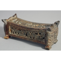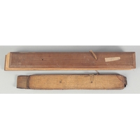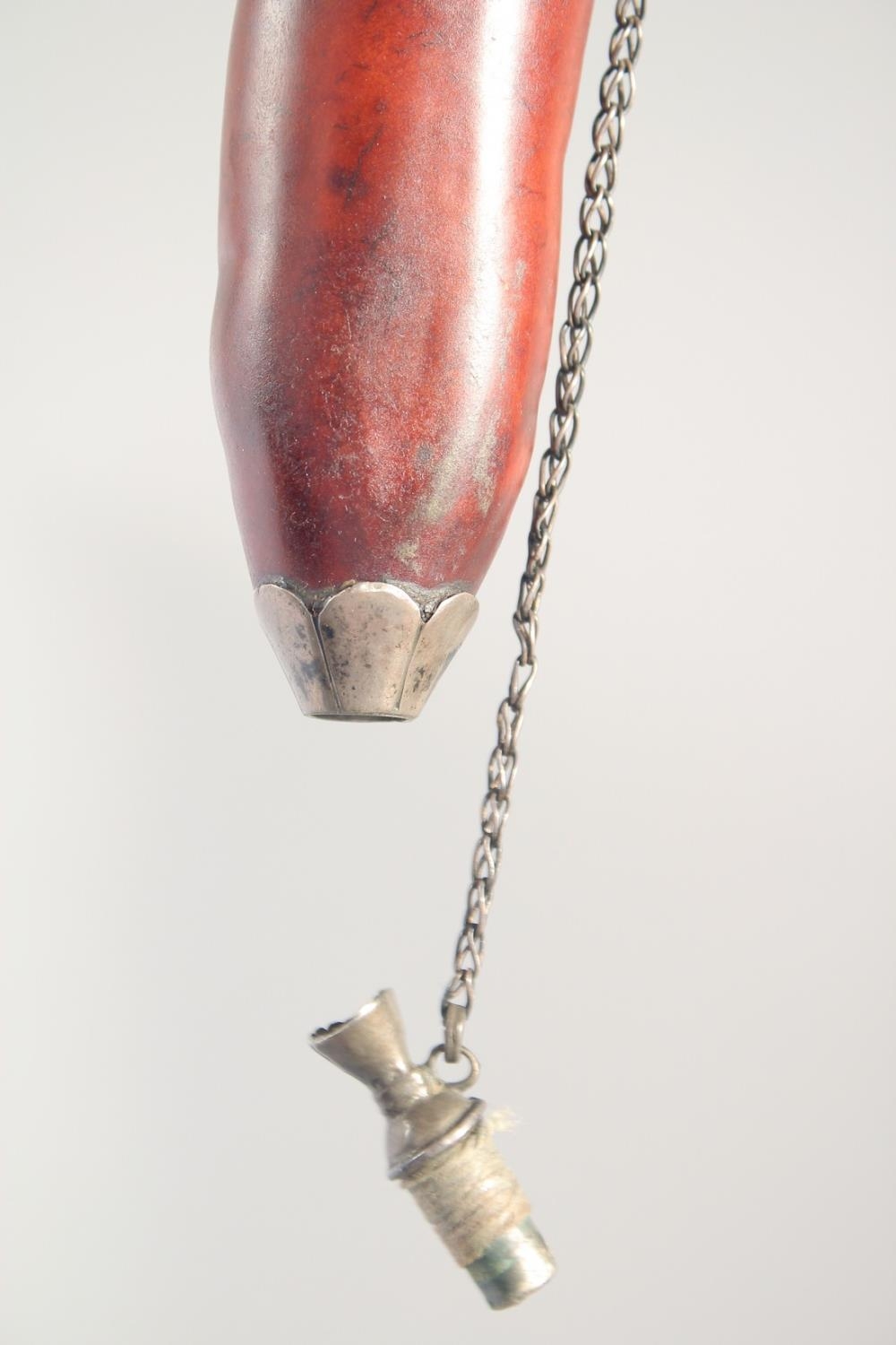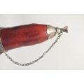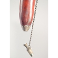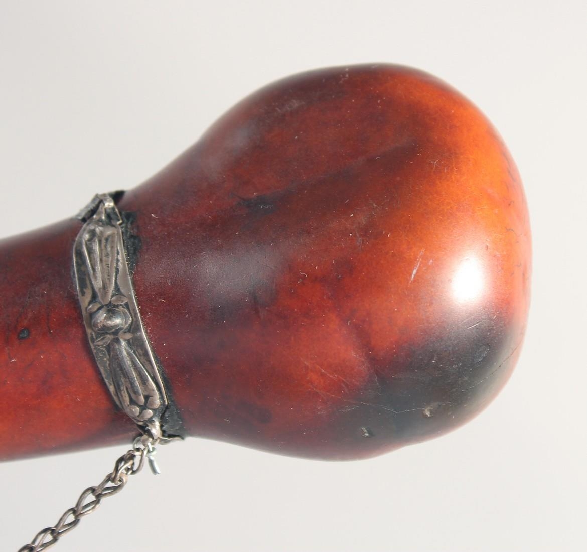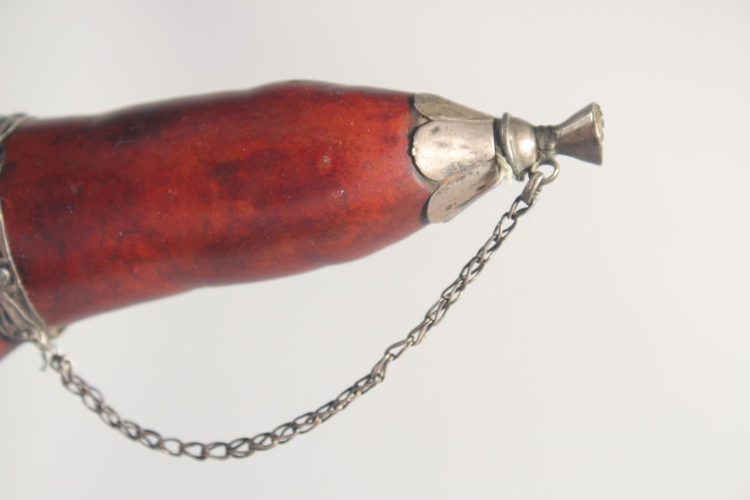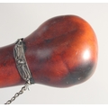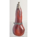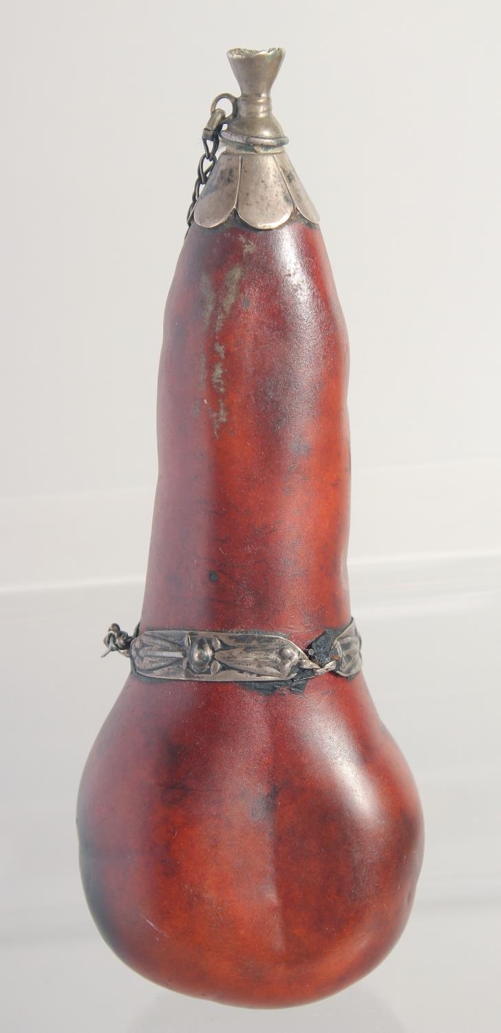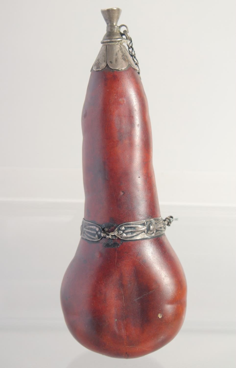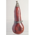 A SMALL POWDER FLASK, with metal mounts, possibly a type of nut, 16cm long.