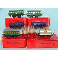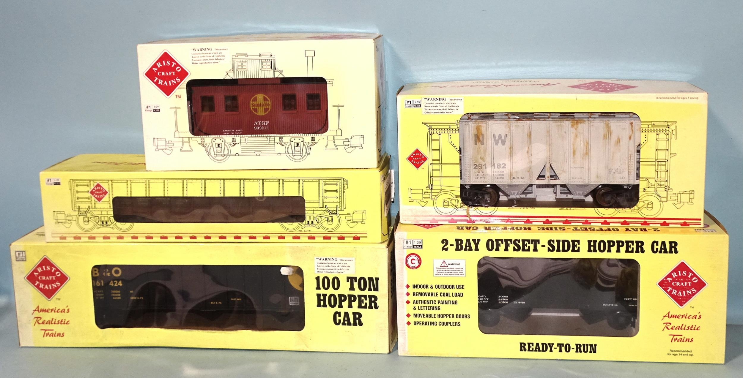 Aristo Craft Trains, 1/G gauge, a 100-ton hopper car, two 2-bay hopper cars, a bobber caboose and a gondola, (all boxed), (5).