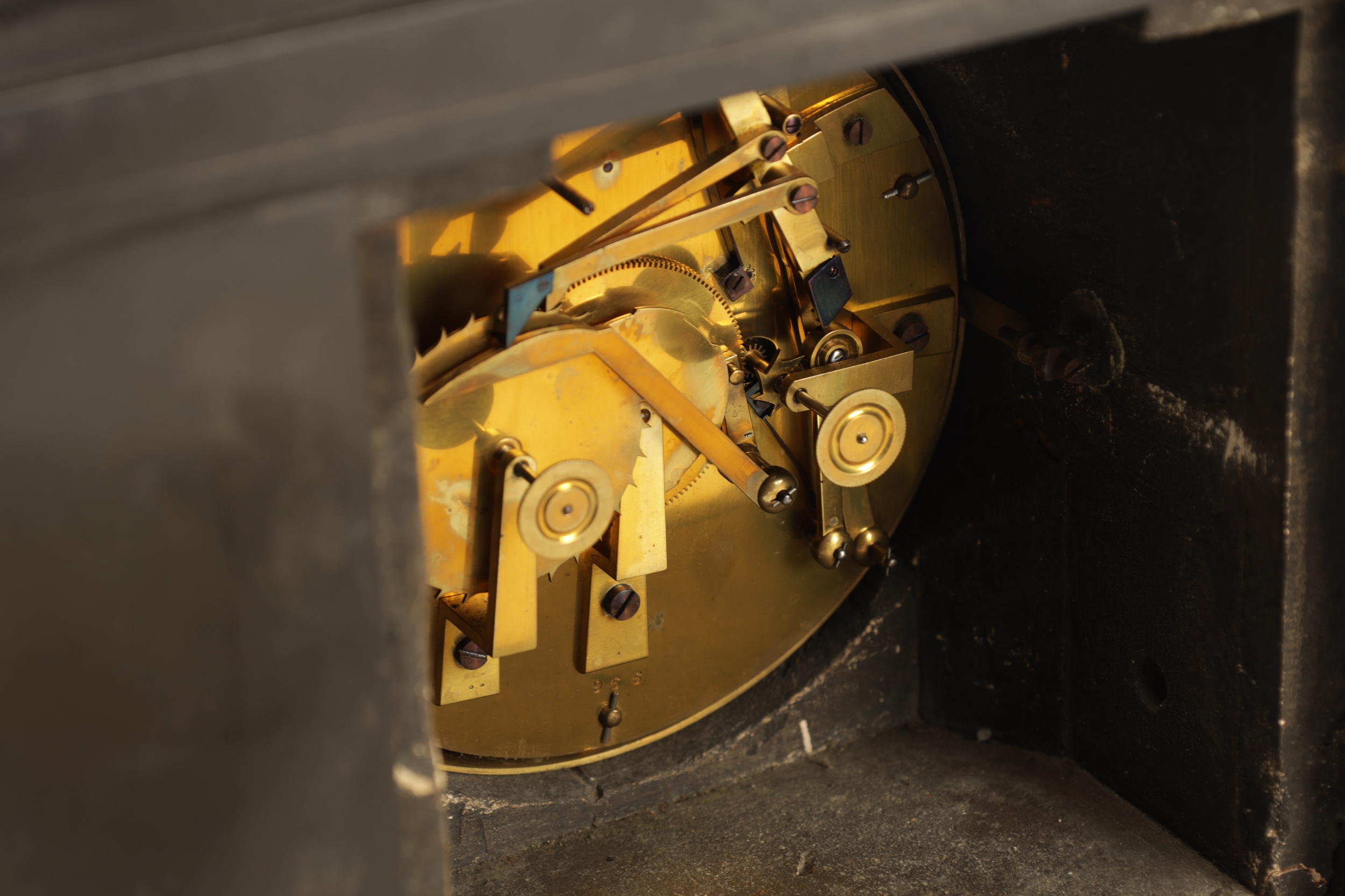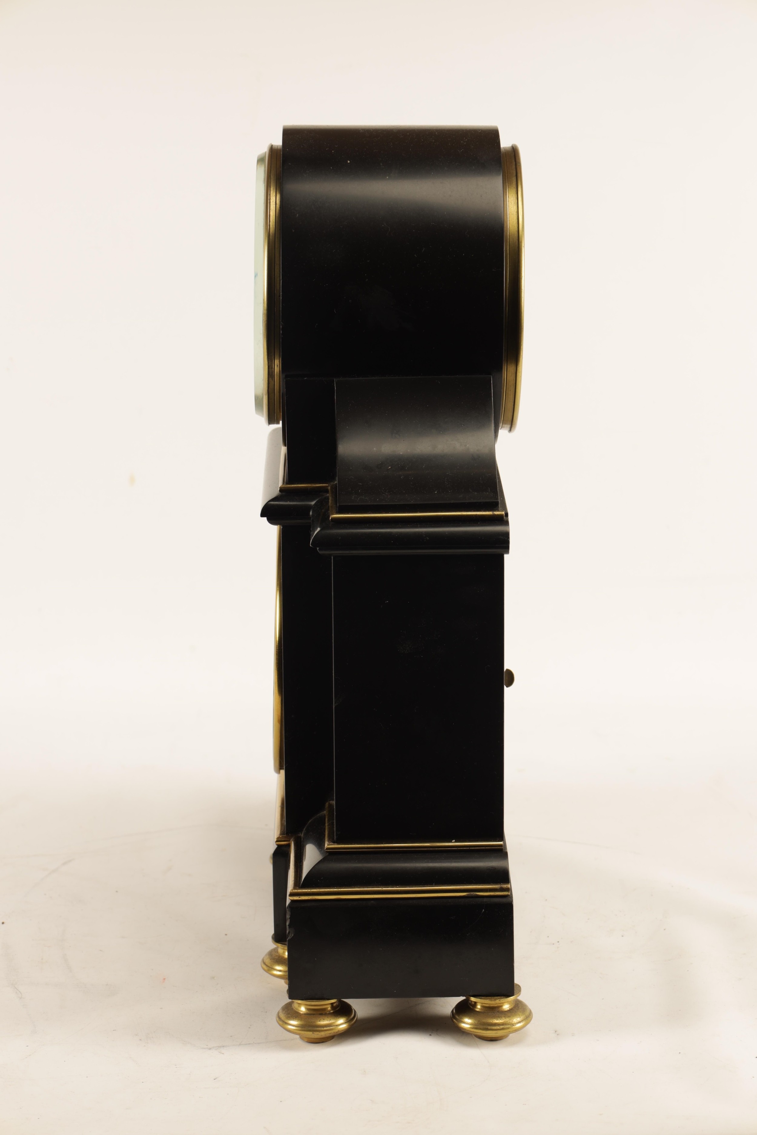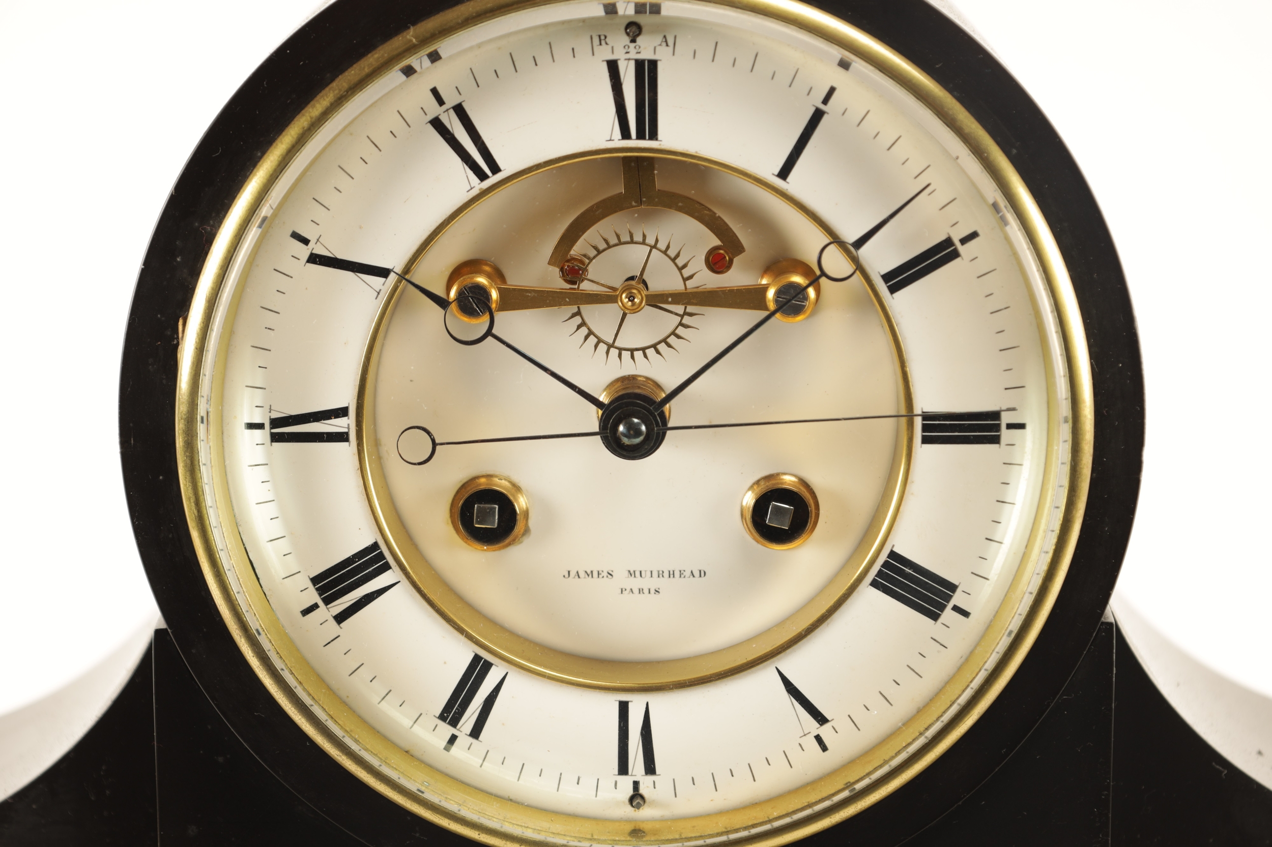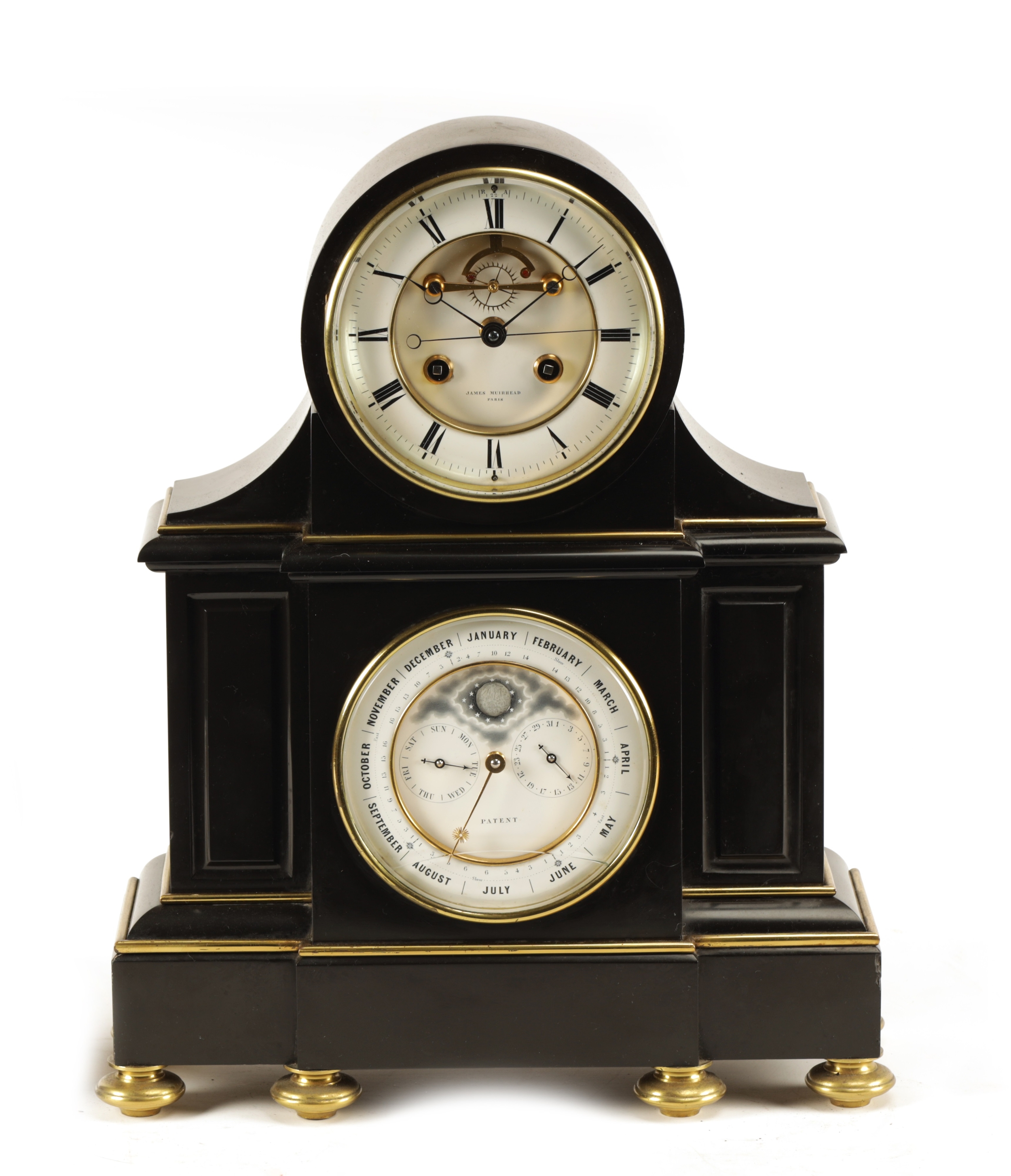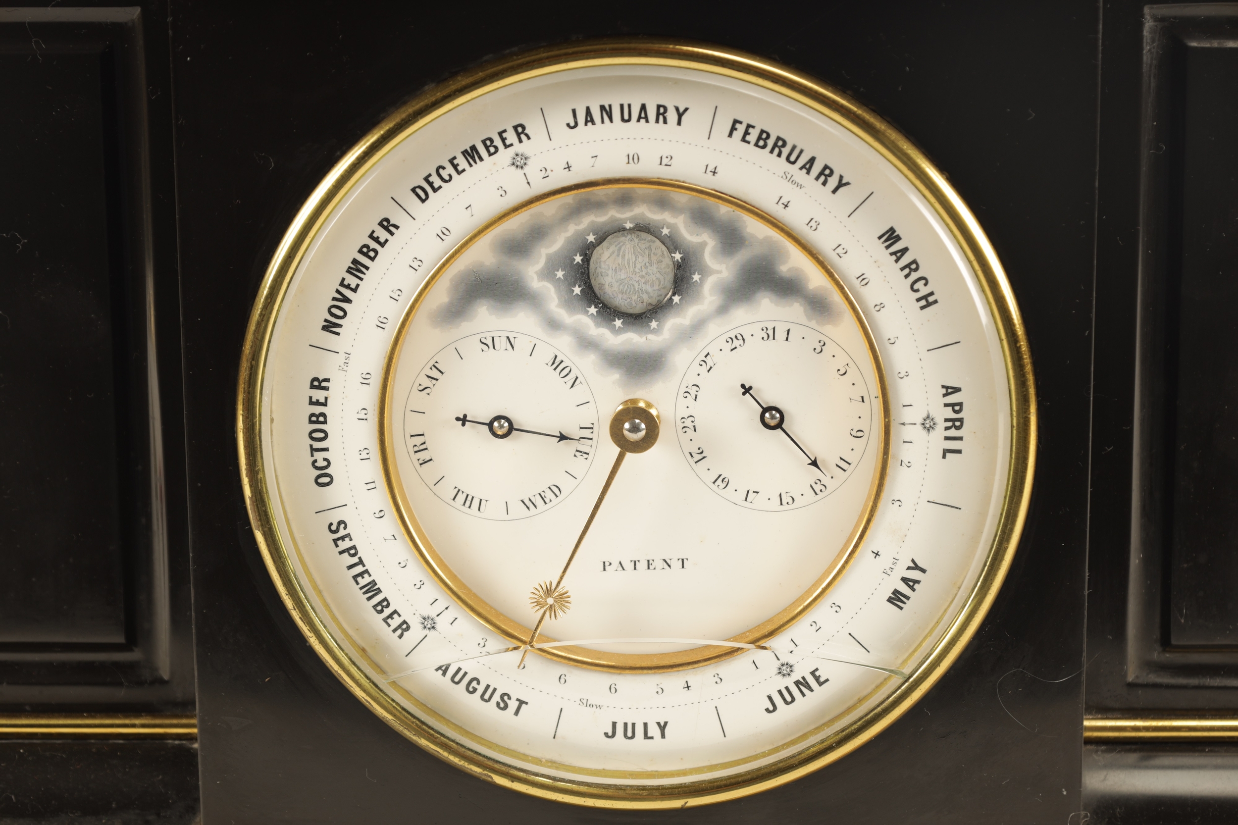A 19TH CENTURY FRENCH BLACK SLATE PANELLED MANTEL CLOCK WITH PERPETUAL CALENDAR WORK the case with arch top and panelled front on a platform base above a white enamel Roman chapter ring and recessed centre with visible Brocot escapement and sweeping seconds hand fronting an eight-day spring-driven movement with anchor escapement striking the hours/half hours on a bell; the lower case with Perpetual Calendar Dial with central revolving moon phase. By James Muirhead, Paris (45cm high 37cm wide )