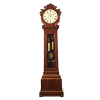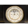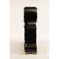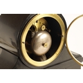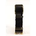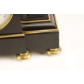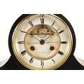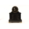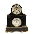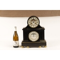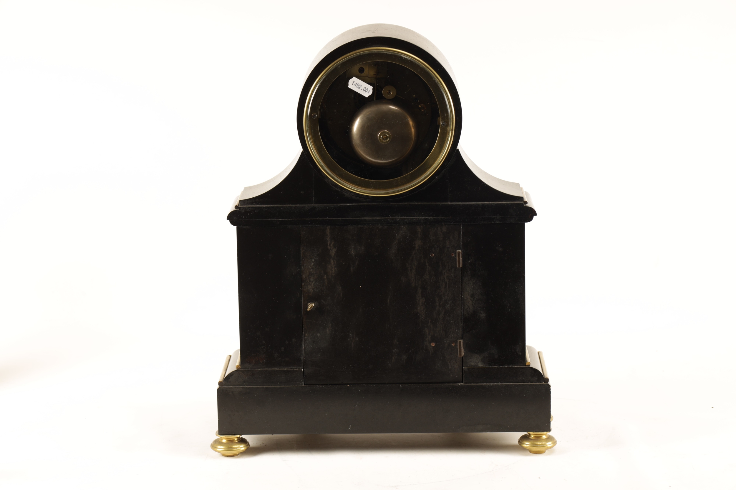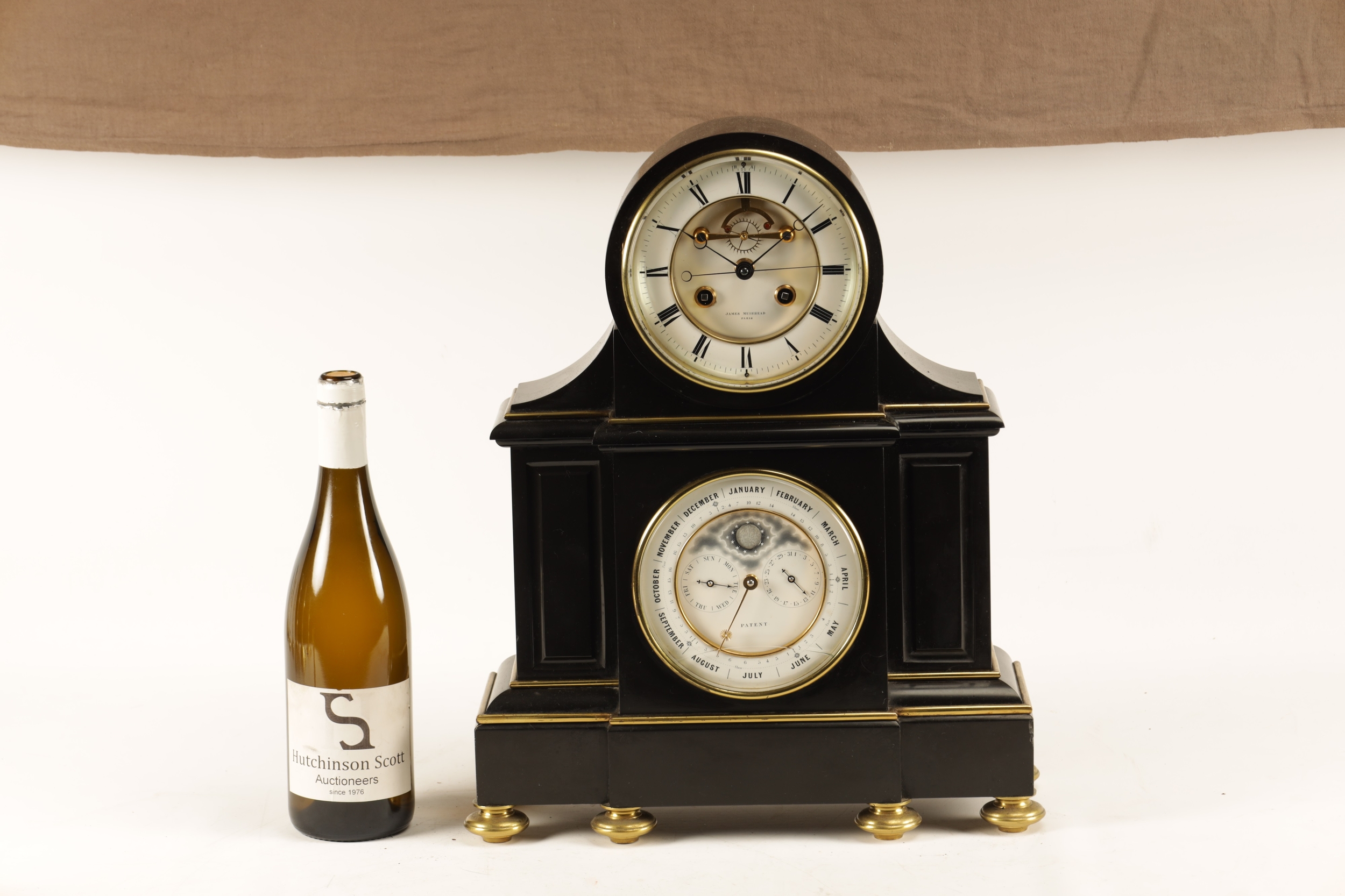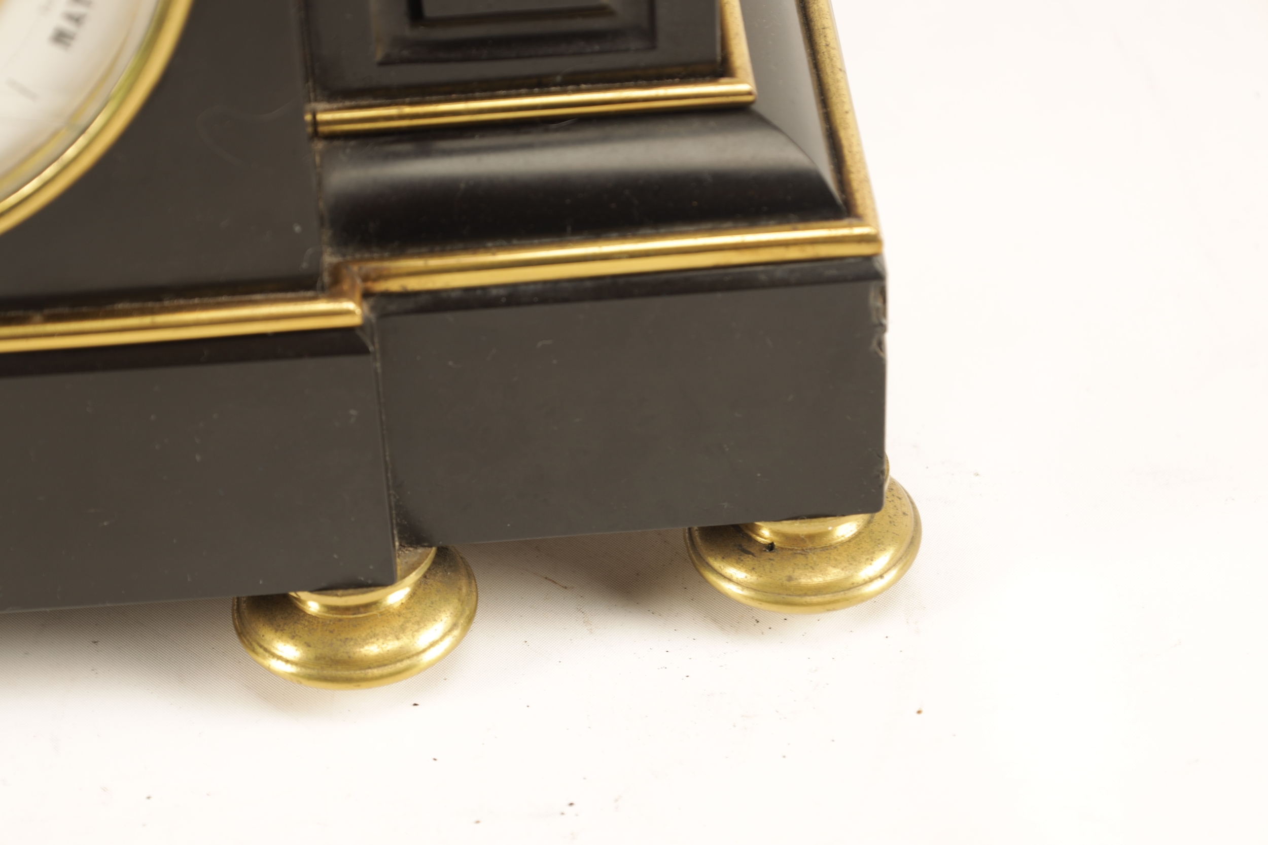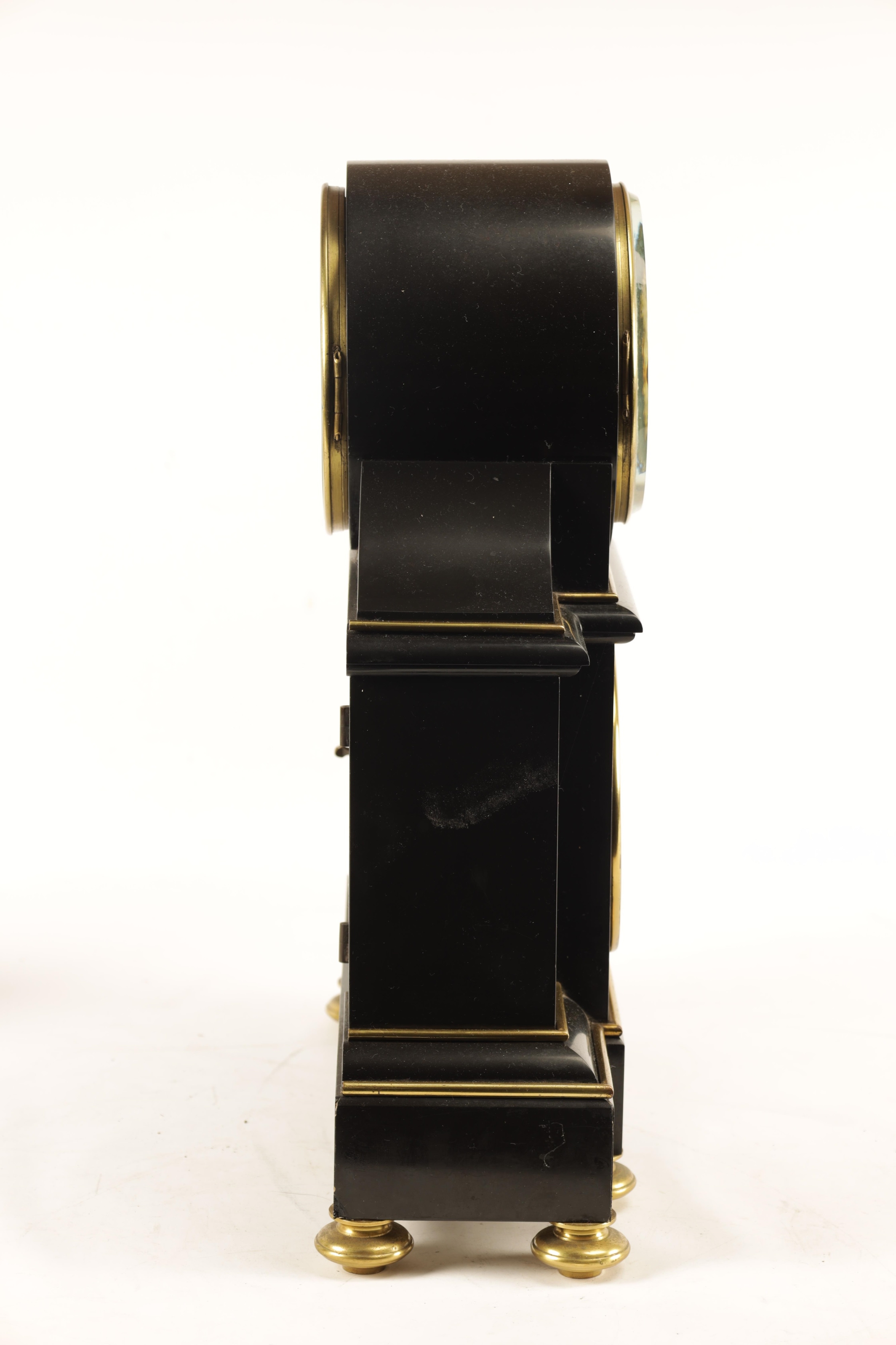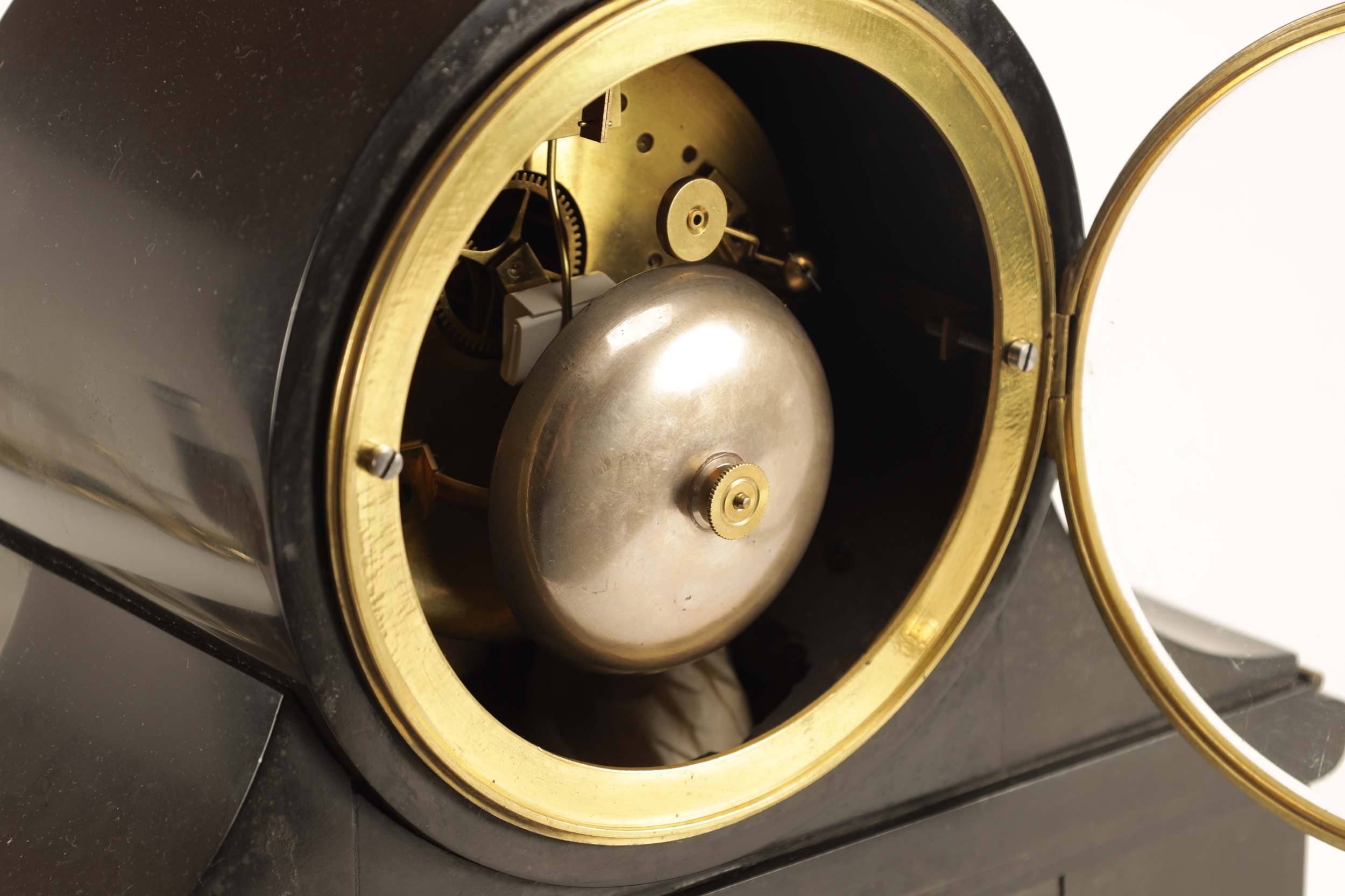 A 19TH CENTURY FRENCH BLACK SLATE PANELLED MANTEL CLOCK WITH PERPETUAL CALENDAR WORK the case with arch top and panelled front on a platform base above a white enamel Roman chapter ring and recessed centre with visible Brocot escapement and sweeping seconds hand fronting an eight-day spring-driven movement with anchor escapement striking the hours/half hours on a bell; the lower case with Perpetual Calendar Dial with central revolving moon phase. By James Muirhead, Paris (45cm high 37cm wide )
