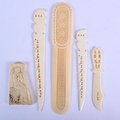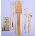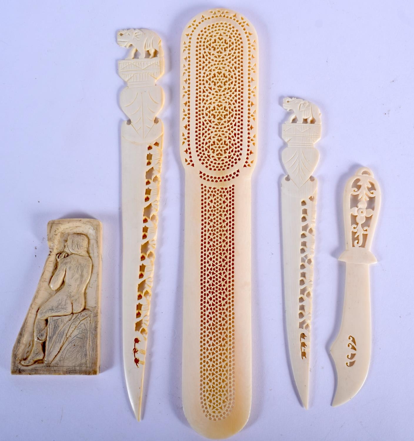 A 19TH CENTURY ANGLO INDIAN CARVED IVORY LETTER OPENER together with similar wares. Largest 24 cm long. (5)