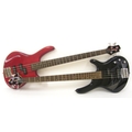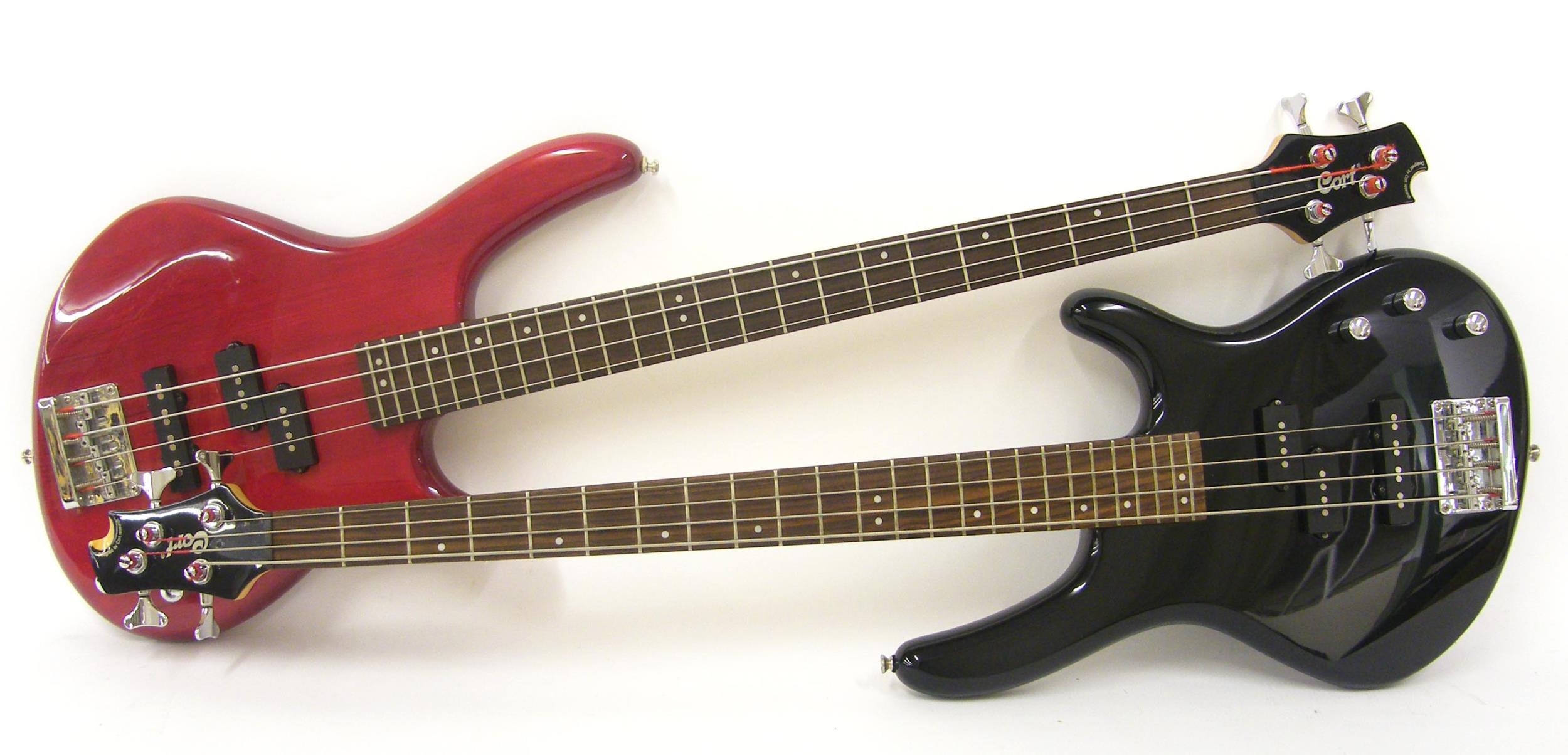 Two Cort Action bass guitars, one in black, the other in red, both in working order, both cased (2)