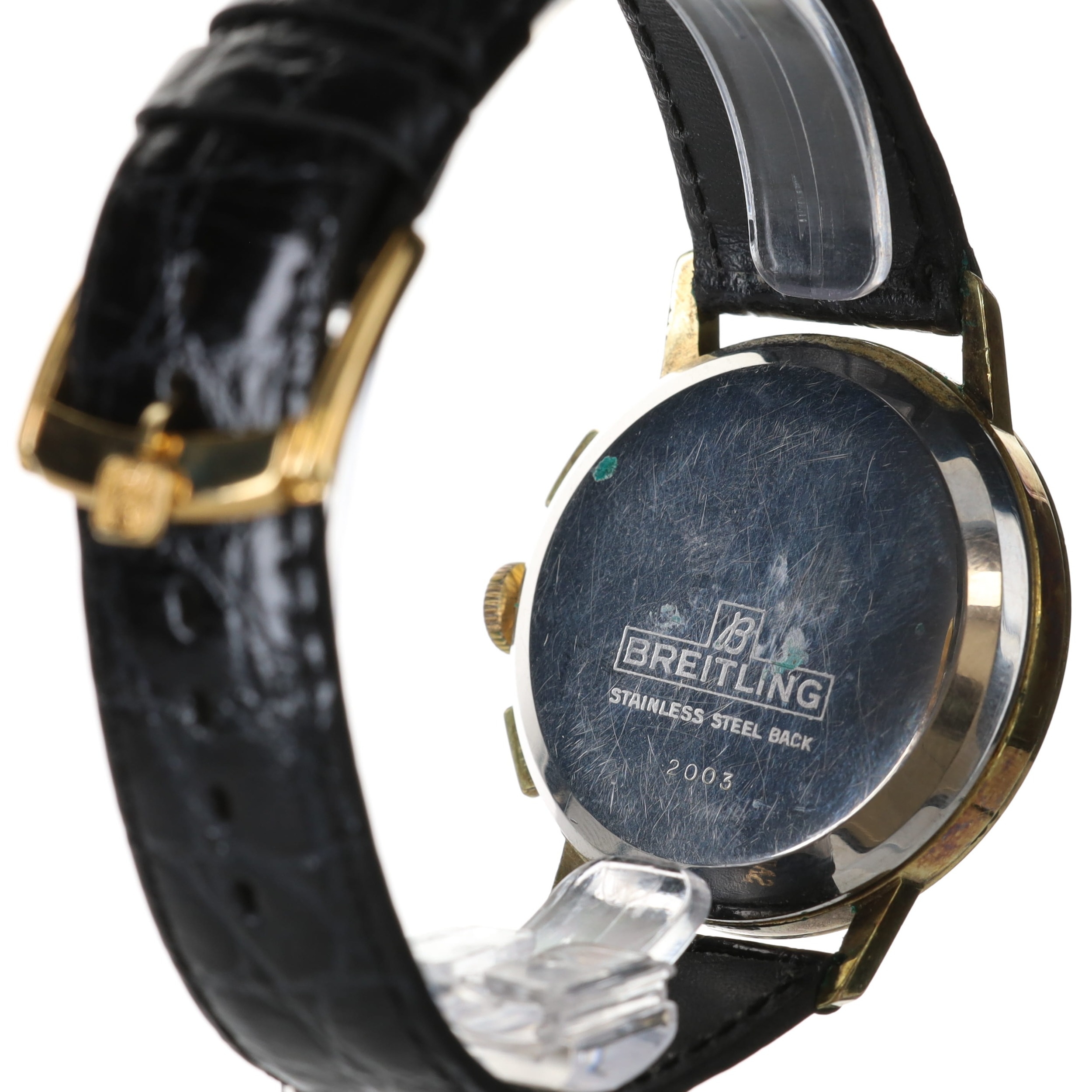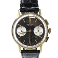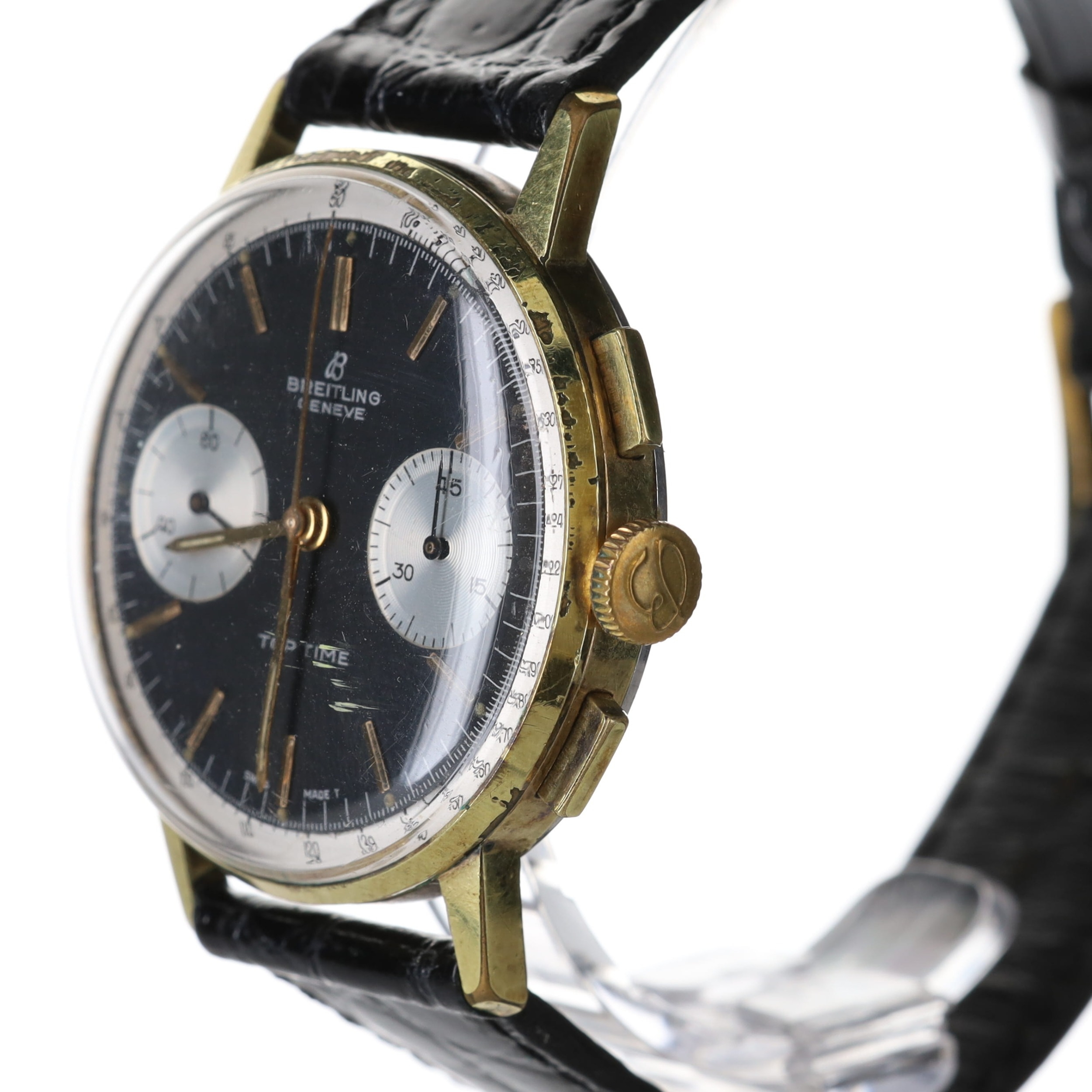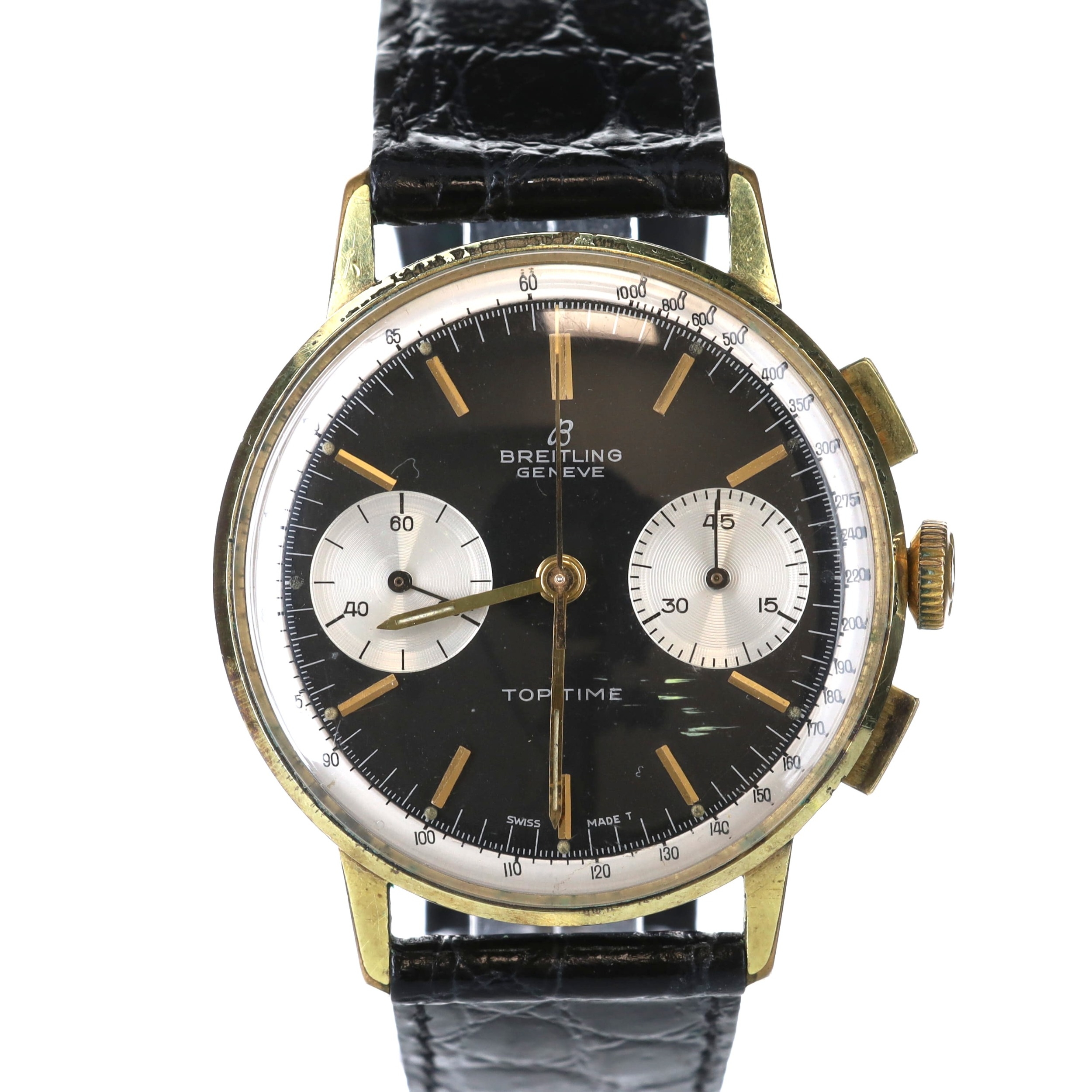 Breitling - Top Time Chronograph Watch, Ref. 2003 , Venus Cal. 188, 17 Jewel Hand-Wind Chronograph movement. Gold Plated Base Metal Case, After Market Black Leather Strap. Reverse Panda Dial, Breitling Top Time applied to dial. No Box & No Papers