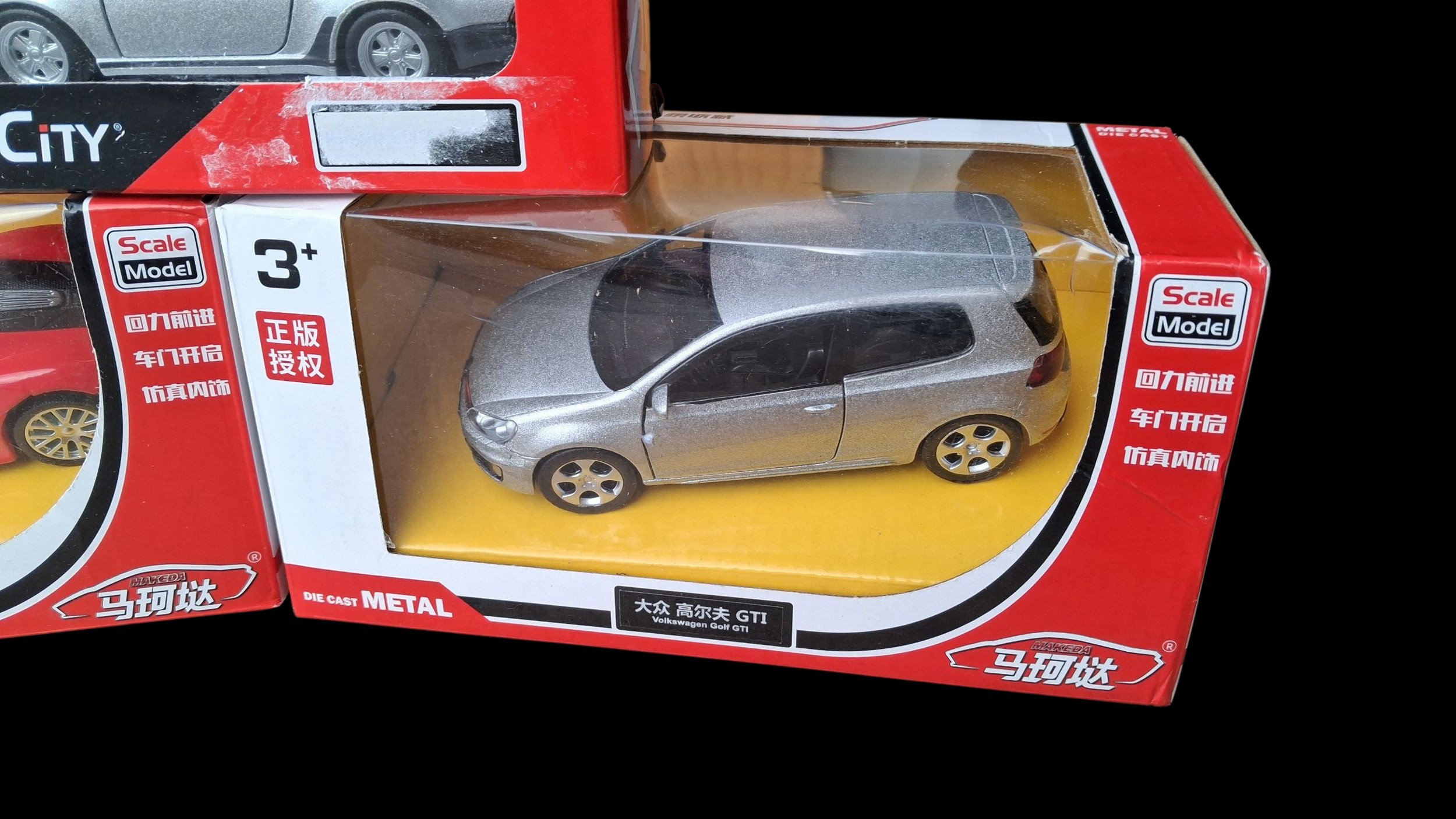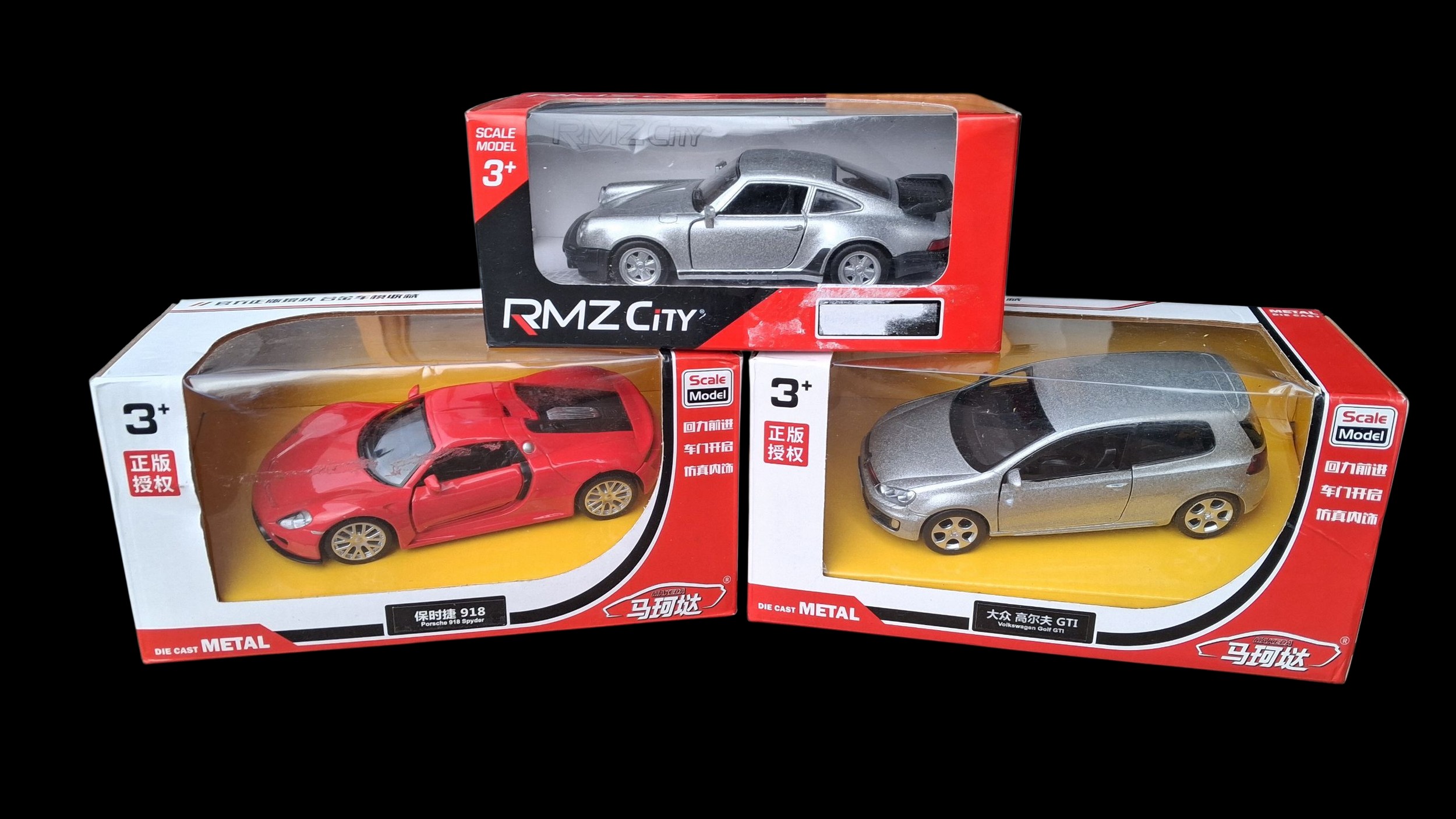3 DIE CAST BOXED CARS PORSHE 918 SPYDER, PORSCHE 911, VOLKSWAGON GOLF GTI