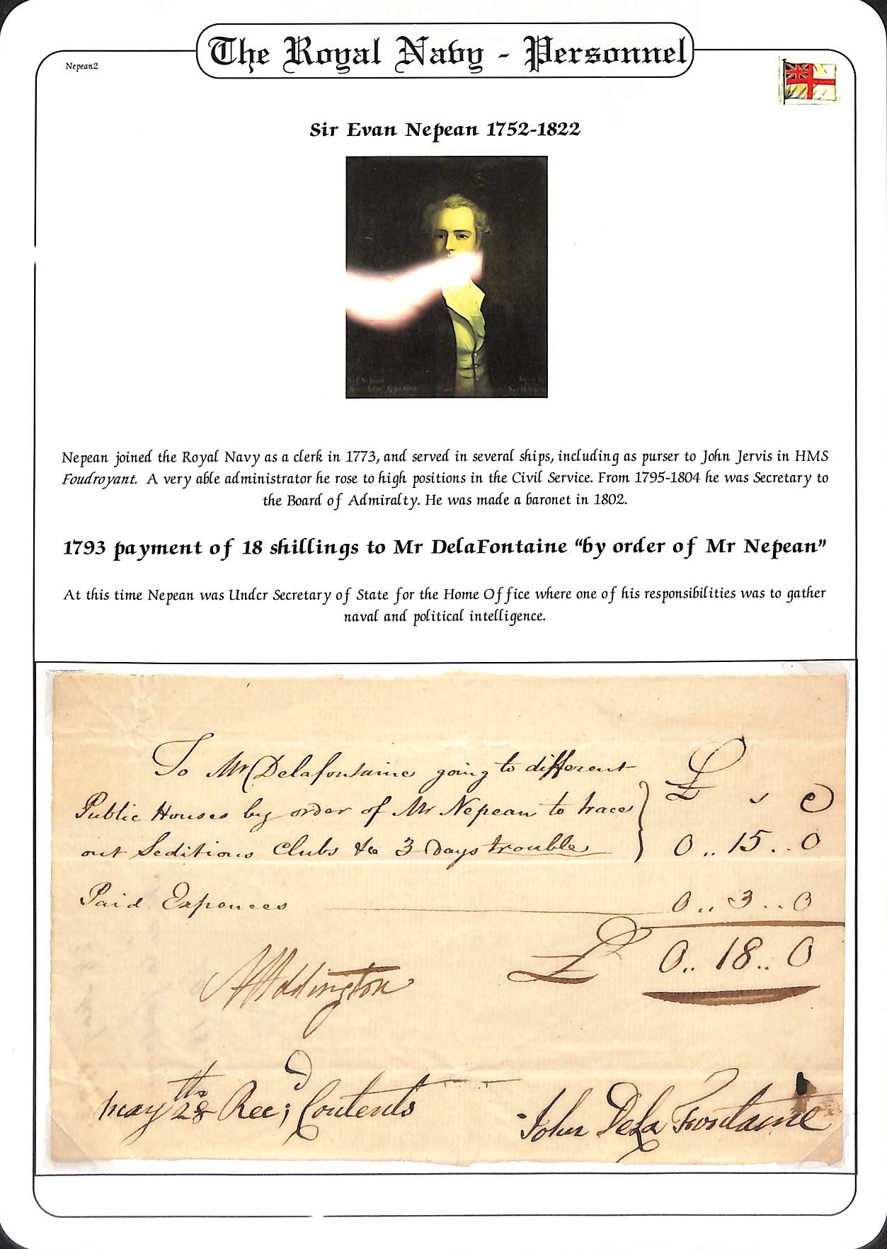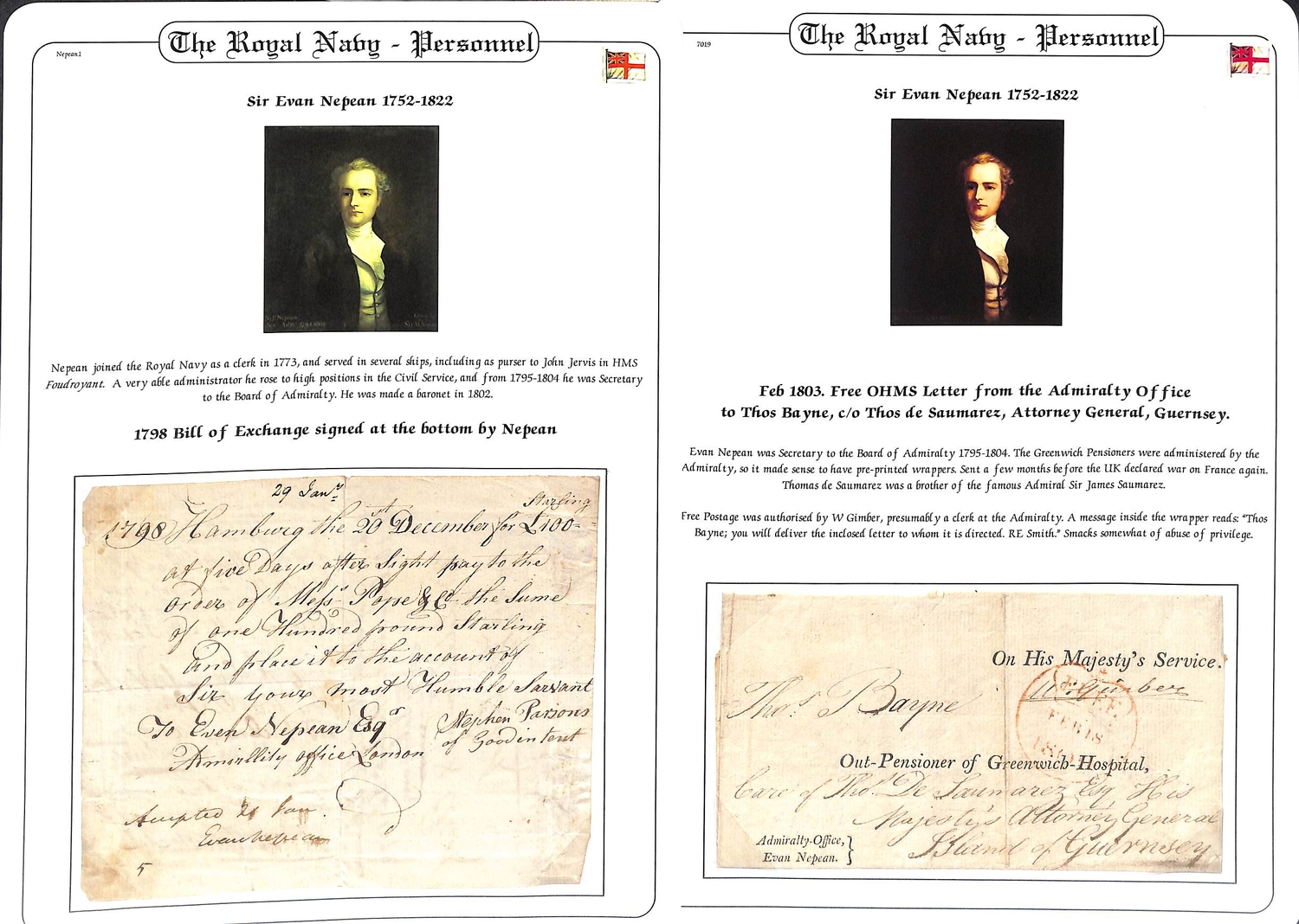 Frees/Sir Evan Nepean. 1803 (Feb 18) Entire with partly printed heading and address "On His Majesty s Service" and "Out-Pensioner of Greenwich Hospital" with "Admiralty Office, Evan Nepean" in the lower corner, addressed to "Thos Bayne, care of Thos De Saumarez, His Majestys Attorney General, Island of Guernsey" and signed "W. Gimber", red Free datestamp. Also a 1793 Bill of Exchange signed by Nepean, and 1793 receipt for 18/- paid "to Mr Delafontaine going to different Public Houses by order of Mr Nepean to trace out seditious clubs &c 3 days trouble". In 1793 Nepean was Under Secretary of State for the Home Office where one of his responsibilities was to gather intelligence; he was Secretary to the Admiralty 1785-1804 and later Governor of Bombay. (3).