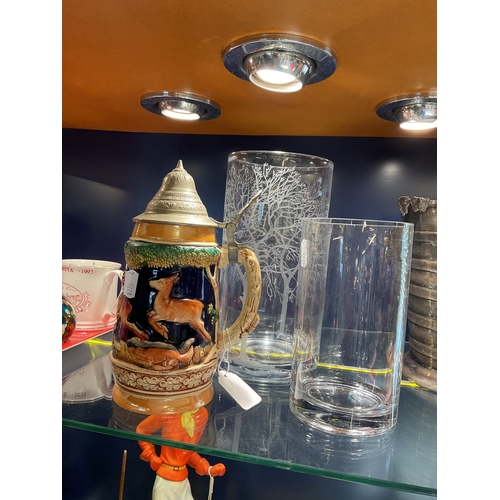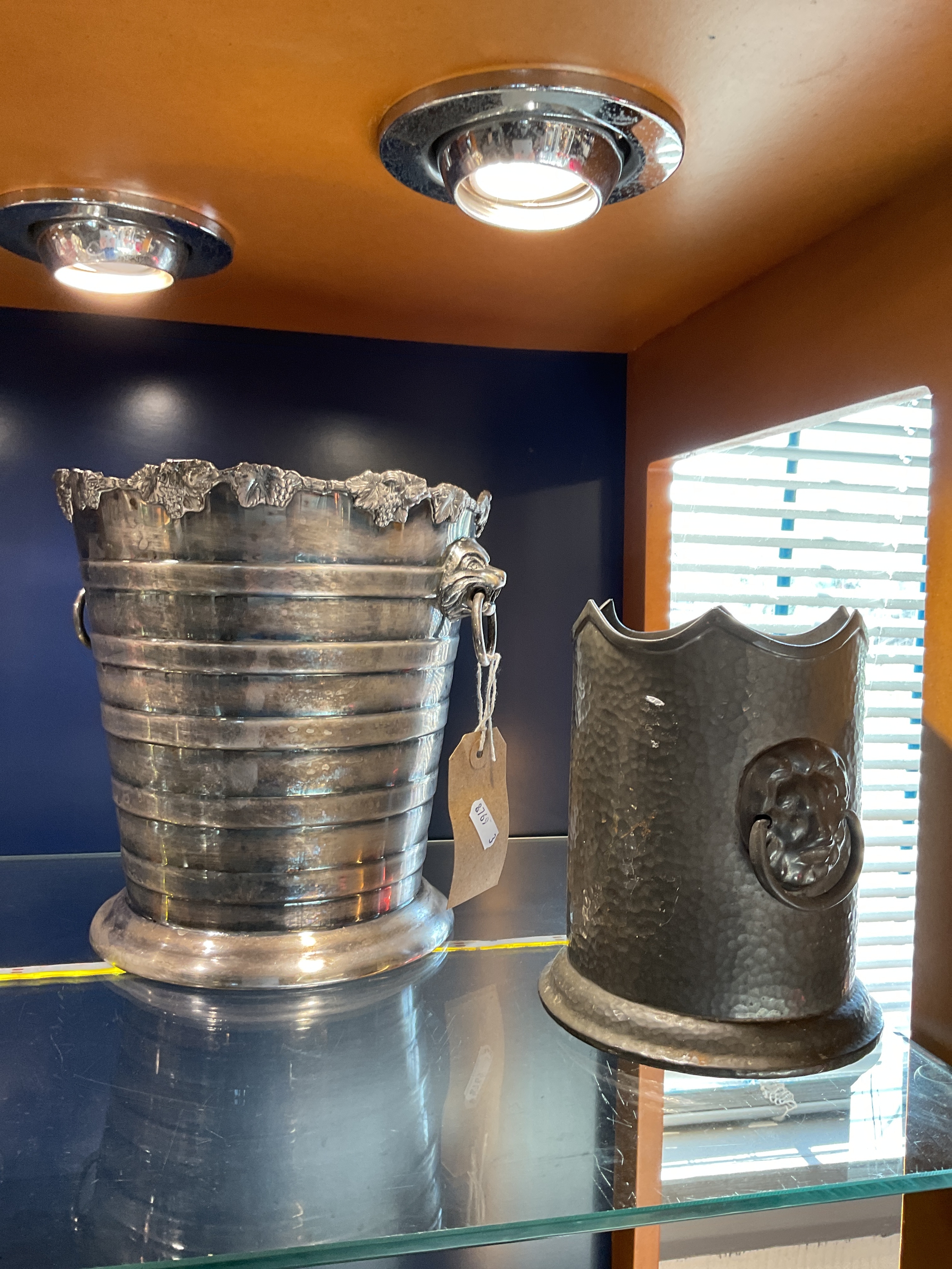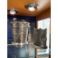 A white metal ice bucket having grapes and vine decoration with lion mask handles together with a pewter wine cooler with lion mask handles