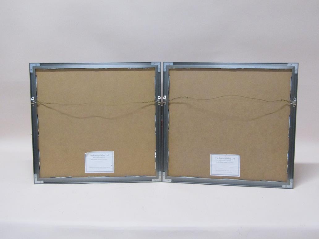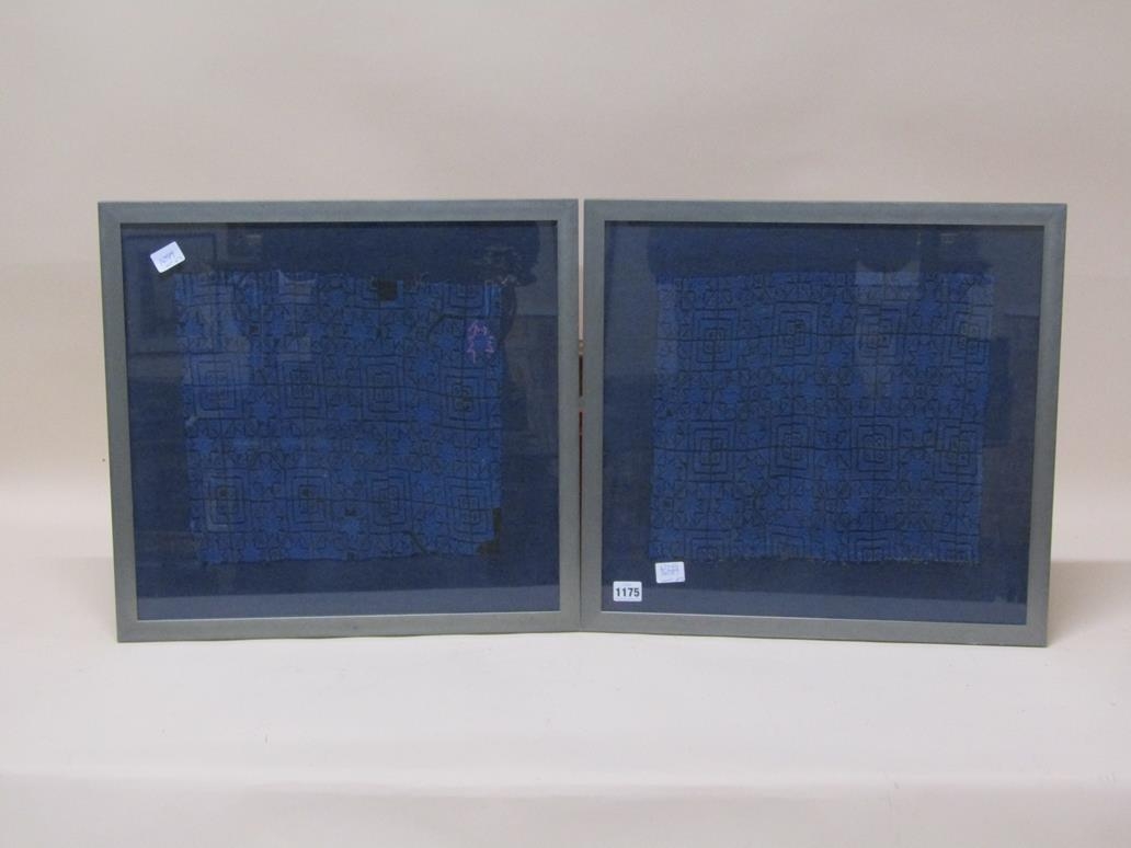 PAIR OF FRAMED MATERIAL NEEDLEWORK PANELS, EACH 43CM X 46CM