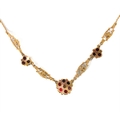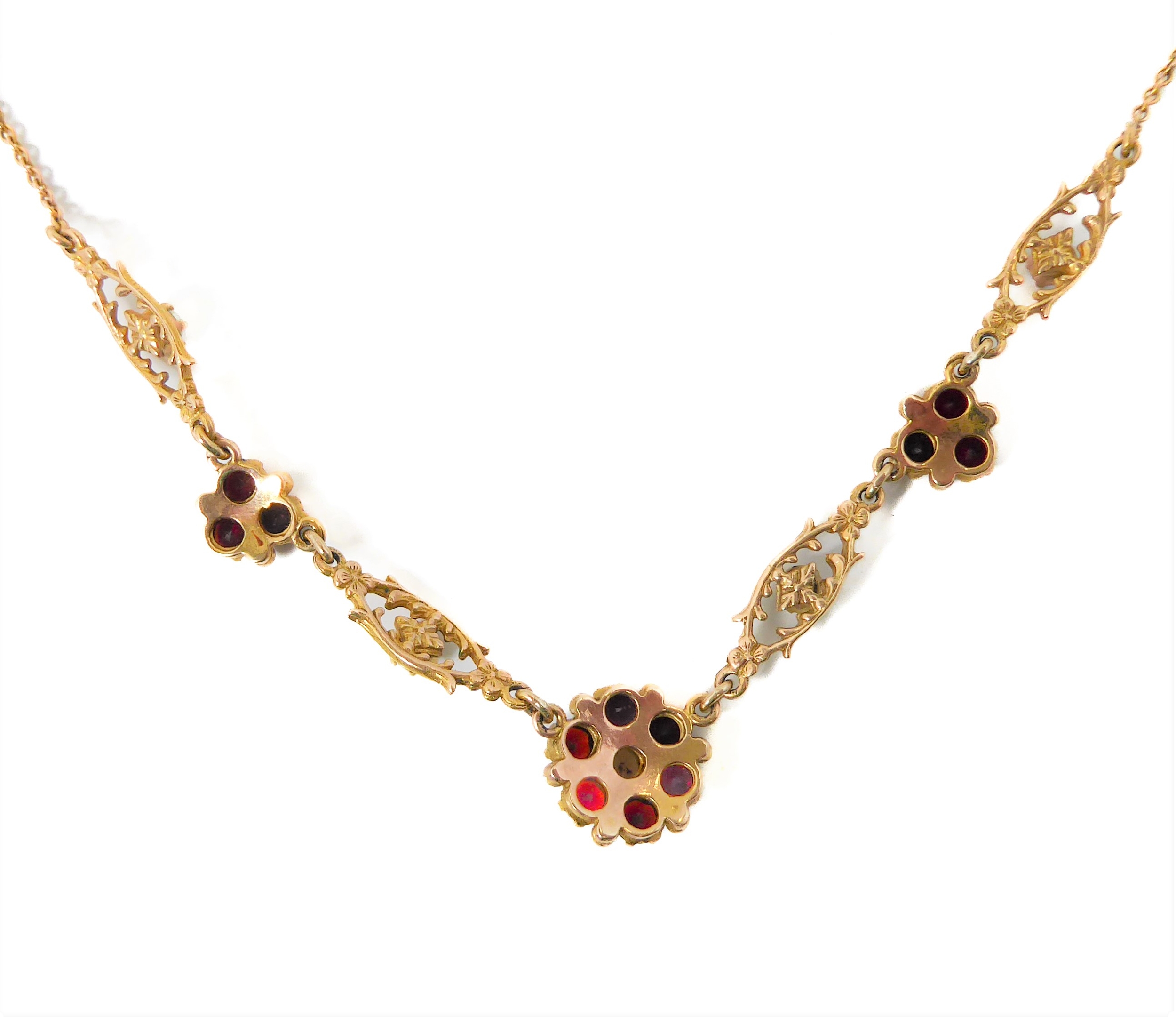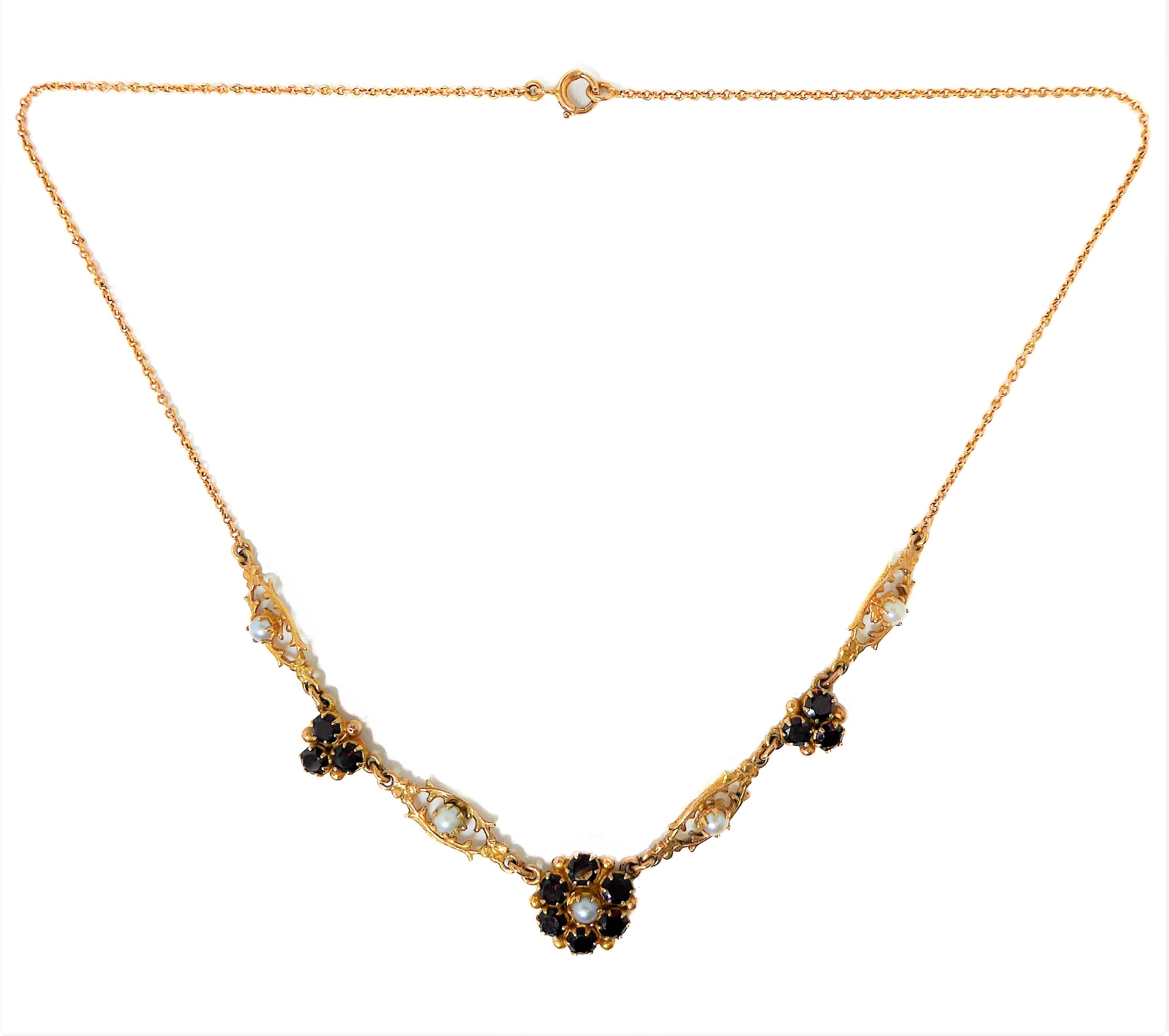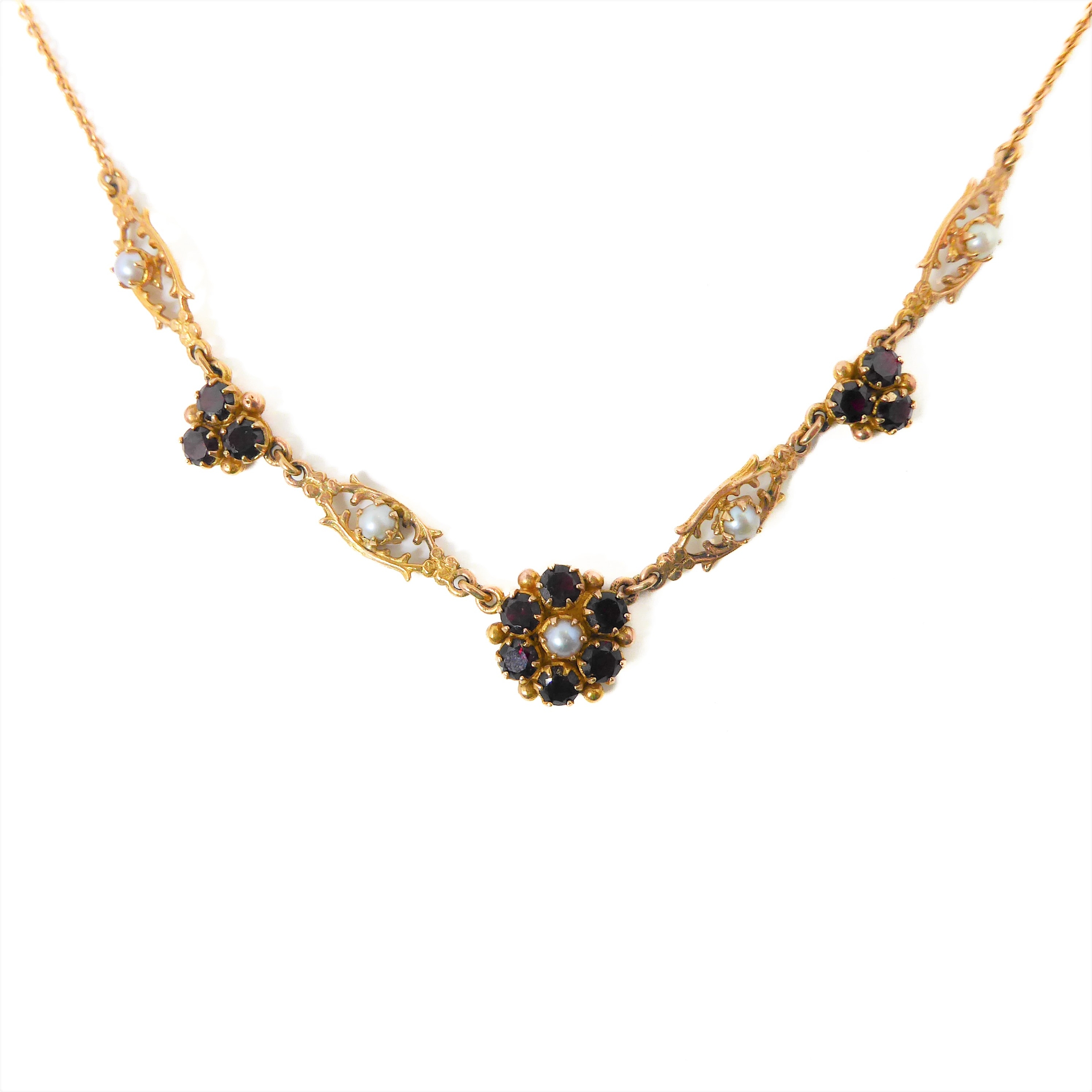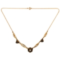 A 9 carat yellow gold (marked 9CT to the clasp) necklace, centrally set with a half pearl and six garnet floral cluster, flanked by two half pearls and a trefoil-shaped garnet cluster to each side (41.25cm long overall; total weight approx. 8.17 g)