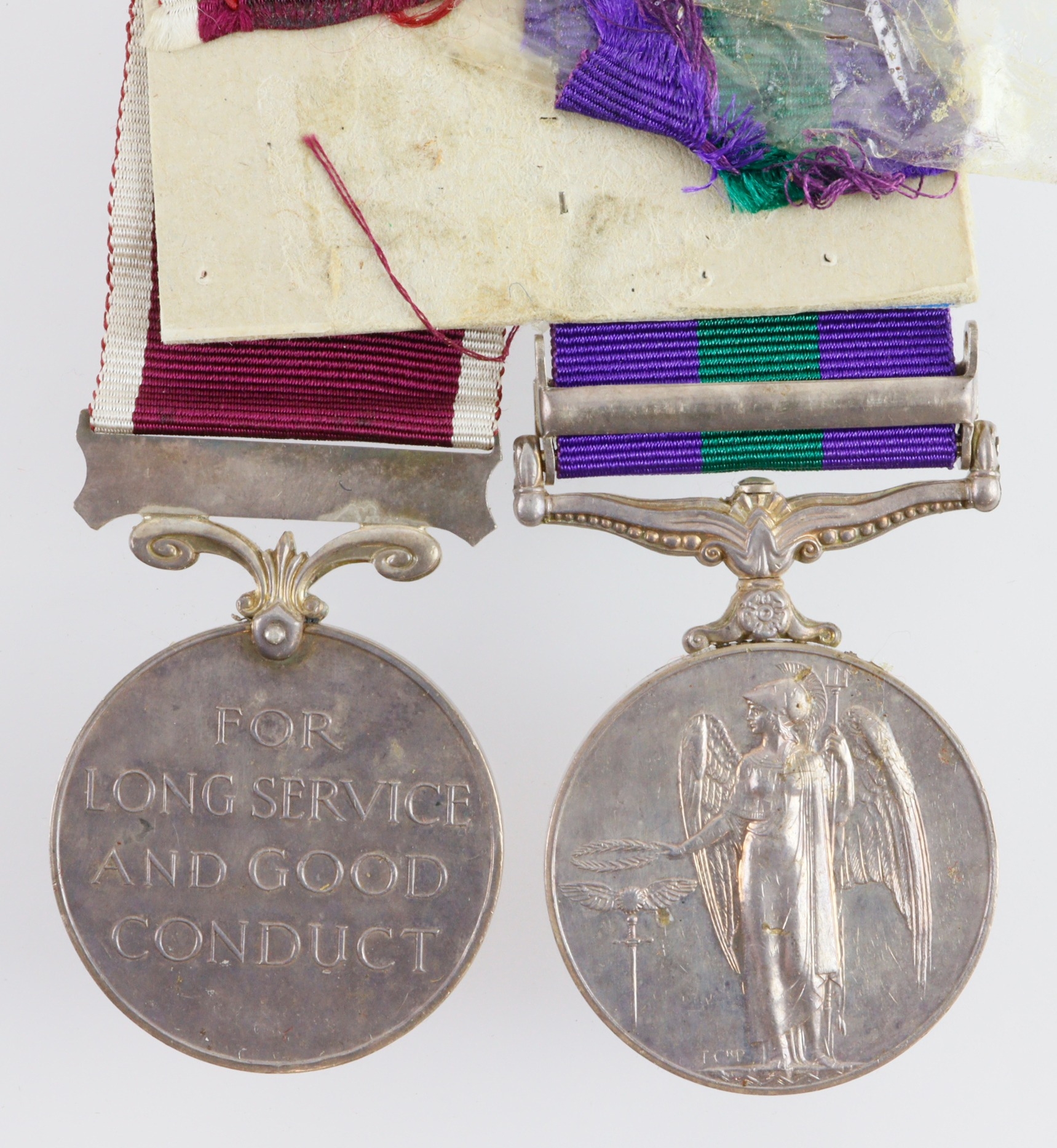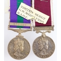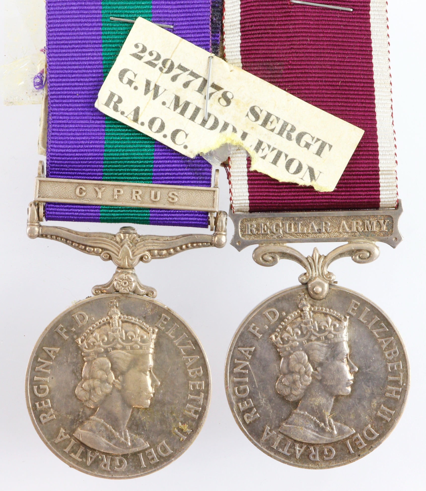 GSM QE2 with Cyprus clasp (22977178 Sgt G W Middleton RAOC) with Regular Army LSGCM QE2 (22977178 Sgt G W Middleton RAOC) small correction to service number. Glue marks noted (2)