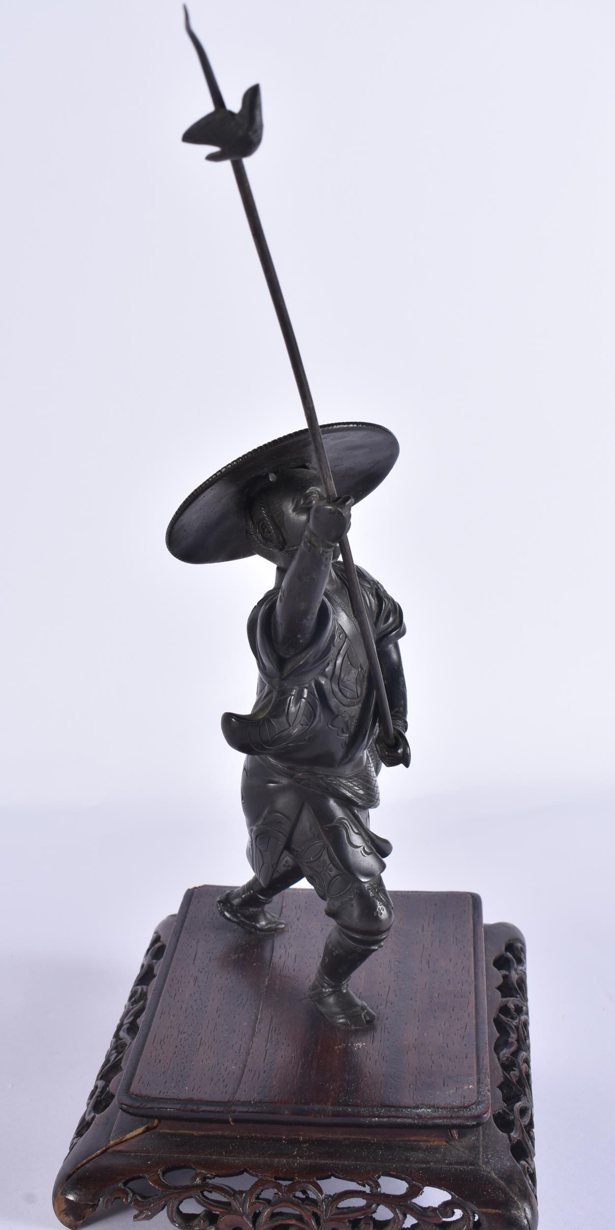 A 19TH CENTURY JAPANESE MEIJI PERIOD BRONZE OKIMONO modelled as a male with a speared bird. Bronze 22 cm high.