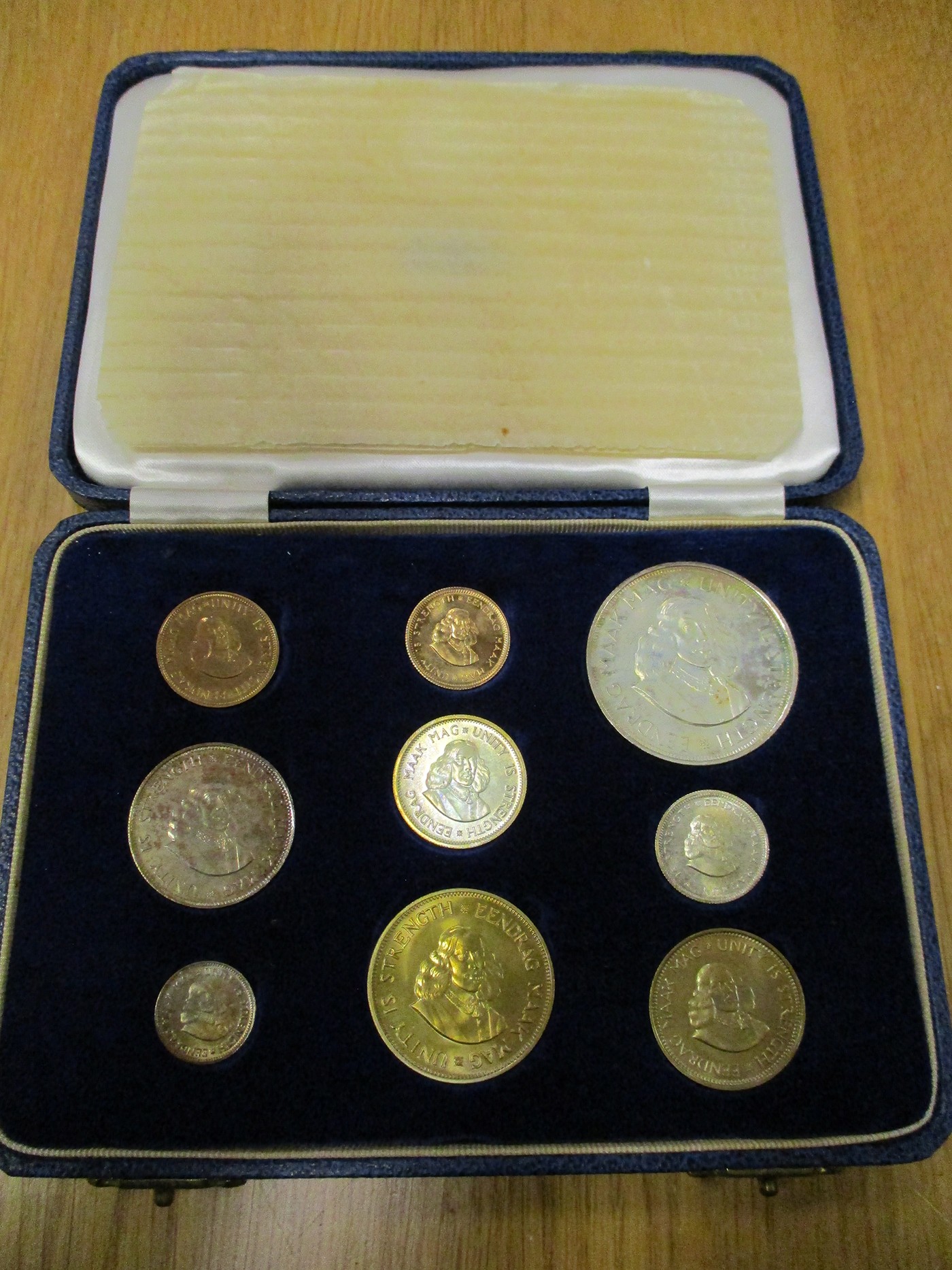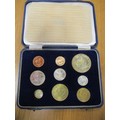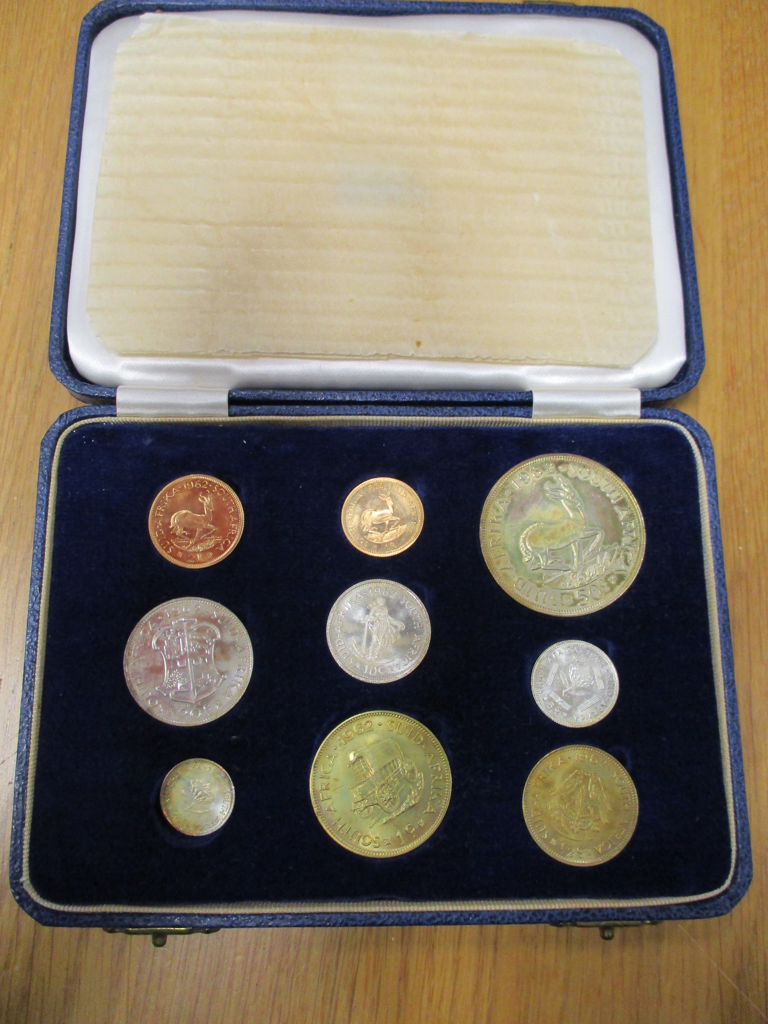 Investment Gold Lot – documents required. South Africa. 1962 proof cased set of 9 with gold 2r, 1r, silver 50c, 20c, 10c, 5c and brass 2½c, 1c and ½c . (Y)