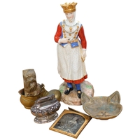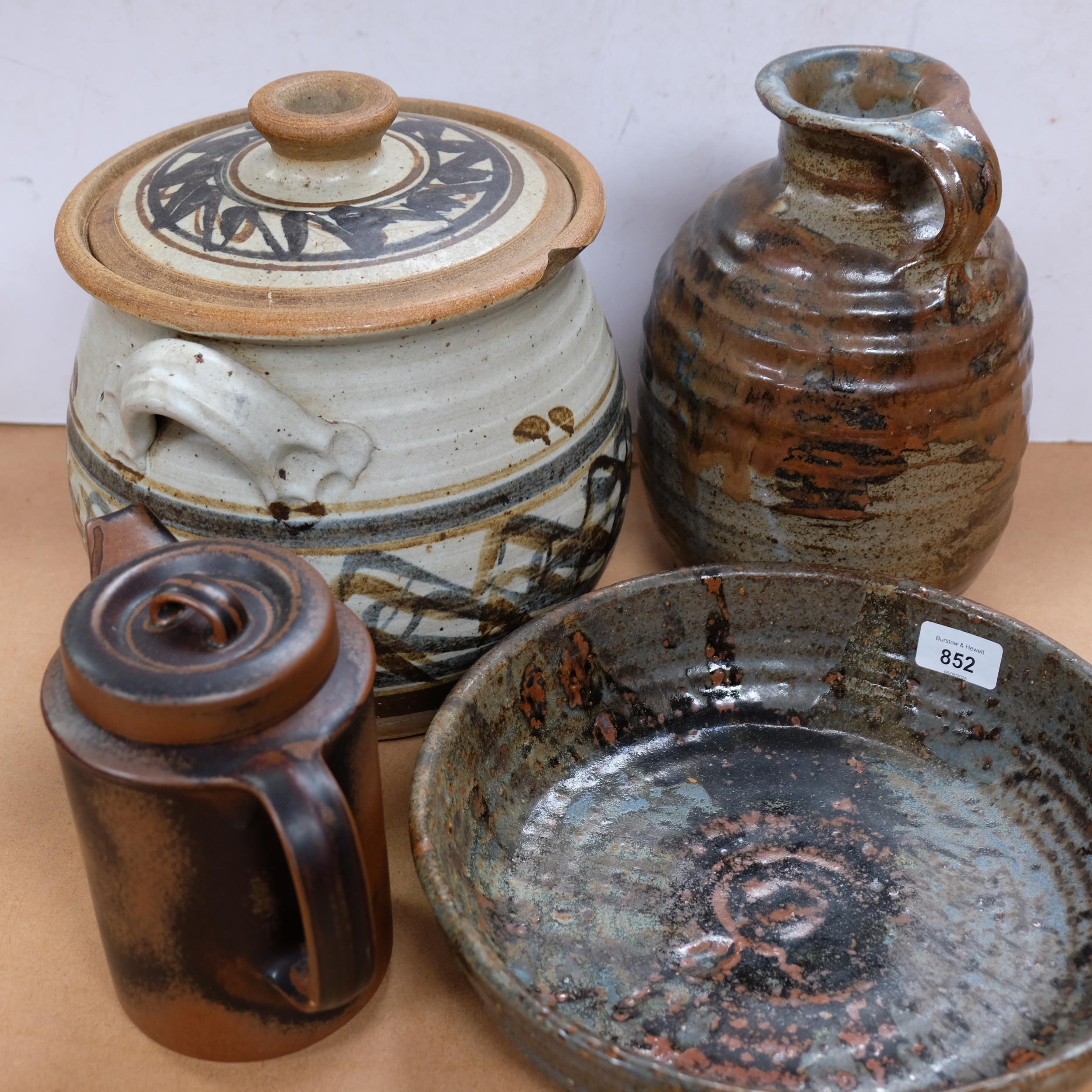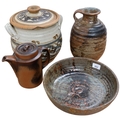 A group of art pottery items, including 2-handled pot and cover, flagon, teapot and fruit bowl