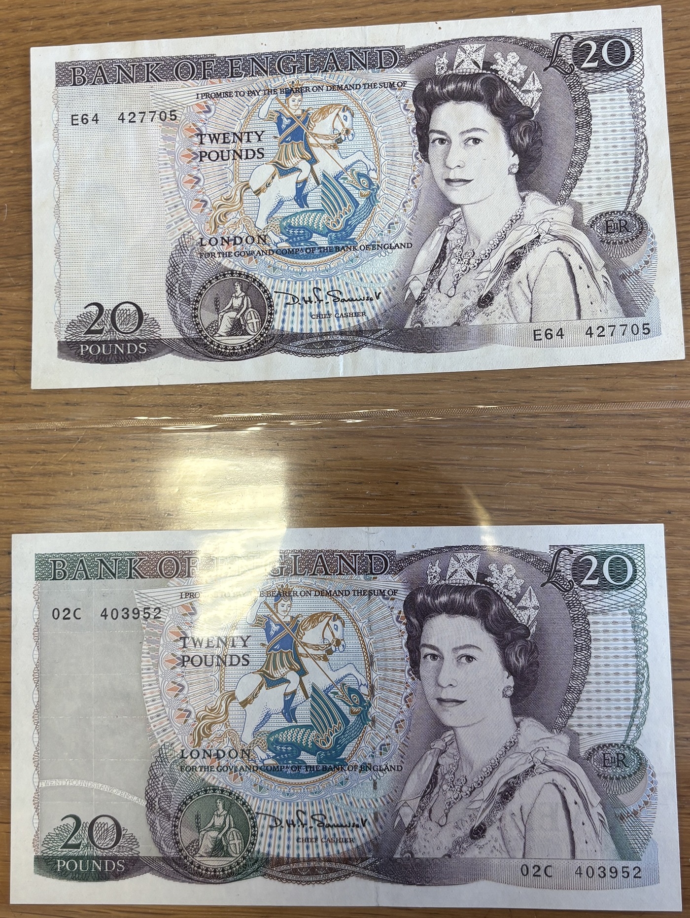 D.H.F. Somerset. Pair of £20 banknotes in plastic wallets, uncirculated, including 1981 E64 and 1984 02C. Qty 2 (N)