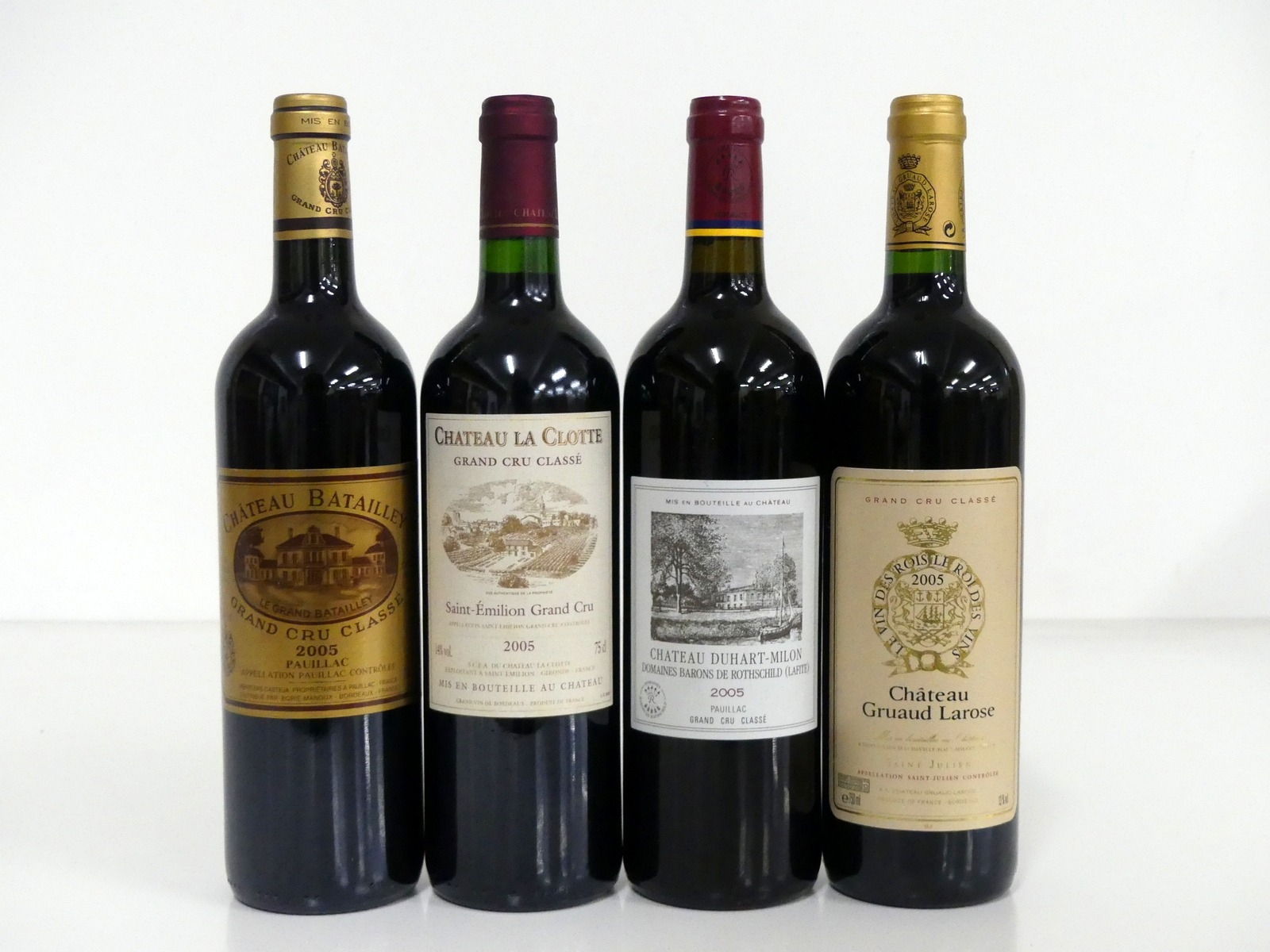 1 bt Ch. Batailley 2005 Pauillac Grand Cru Classé i.n 1 bt Ch. La Clotte 2005 St-Émilion Grand Cru Classé hf/i.n 1 bt Ch. Duhart-Milon 2005 Pauillac Grand Cru Classé hf/i.n 1 bt Ch. Gruaud Larose 2005 St-Julien Grand Cru Classé i.n Above 4 bottles