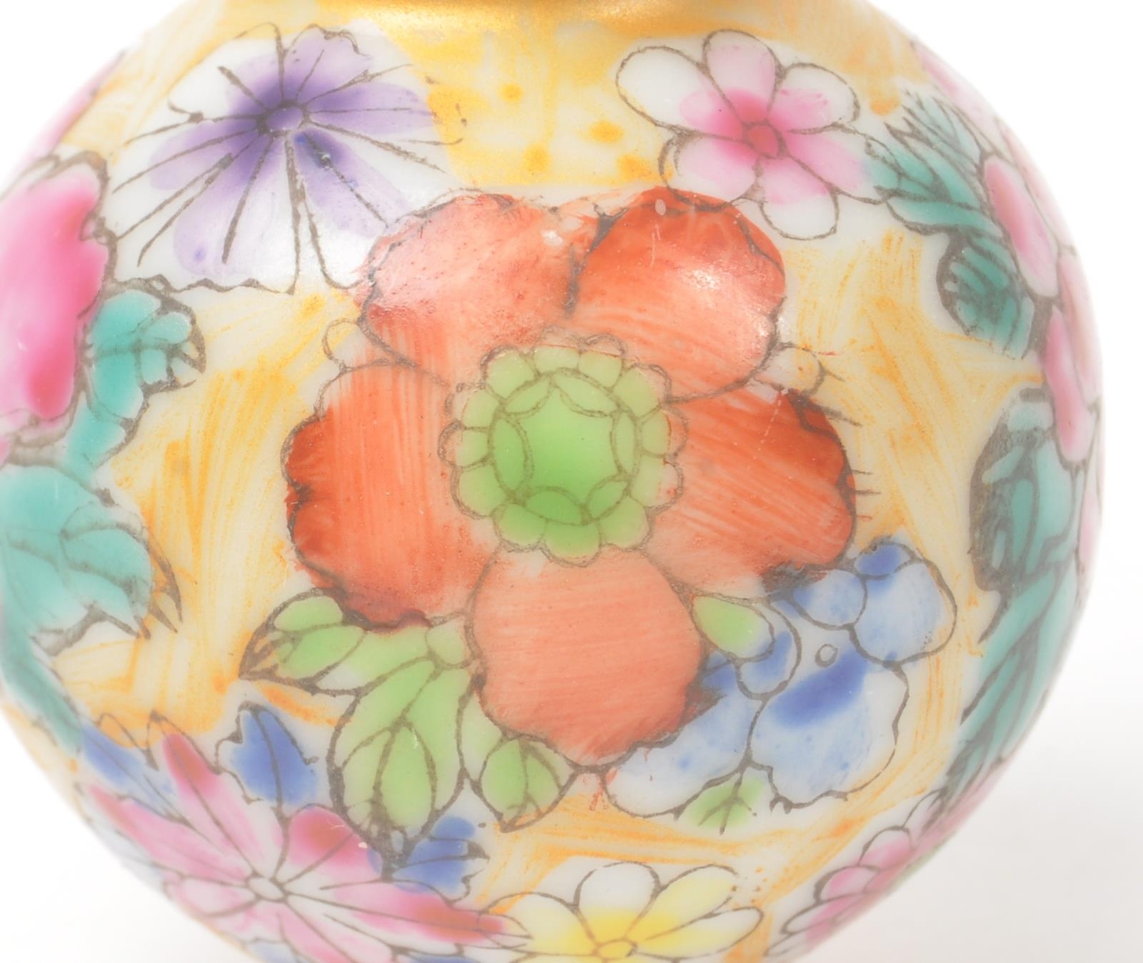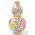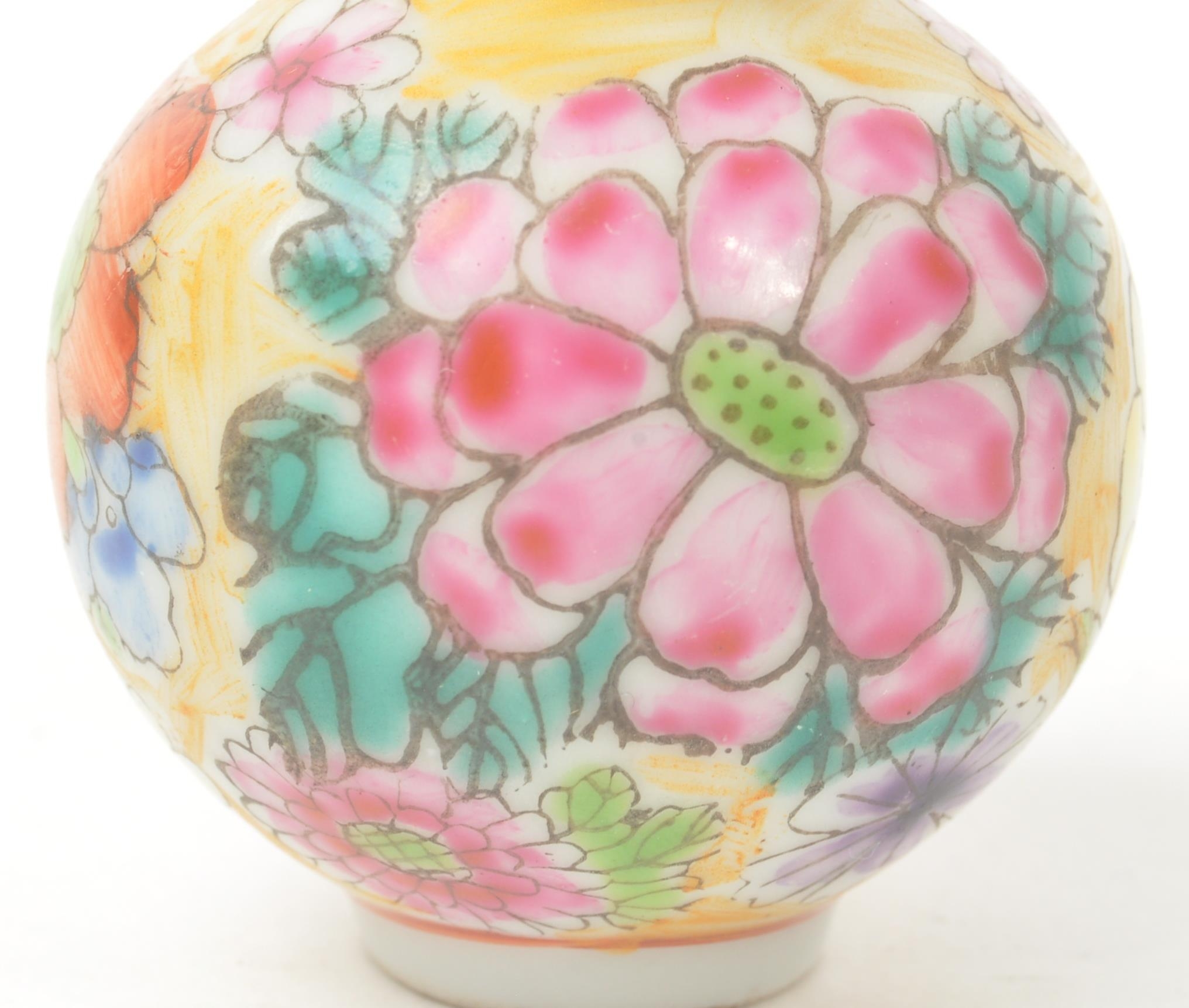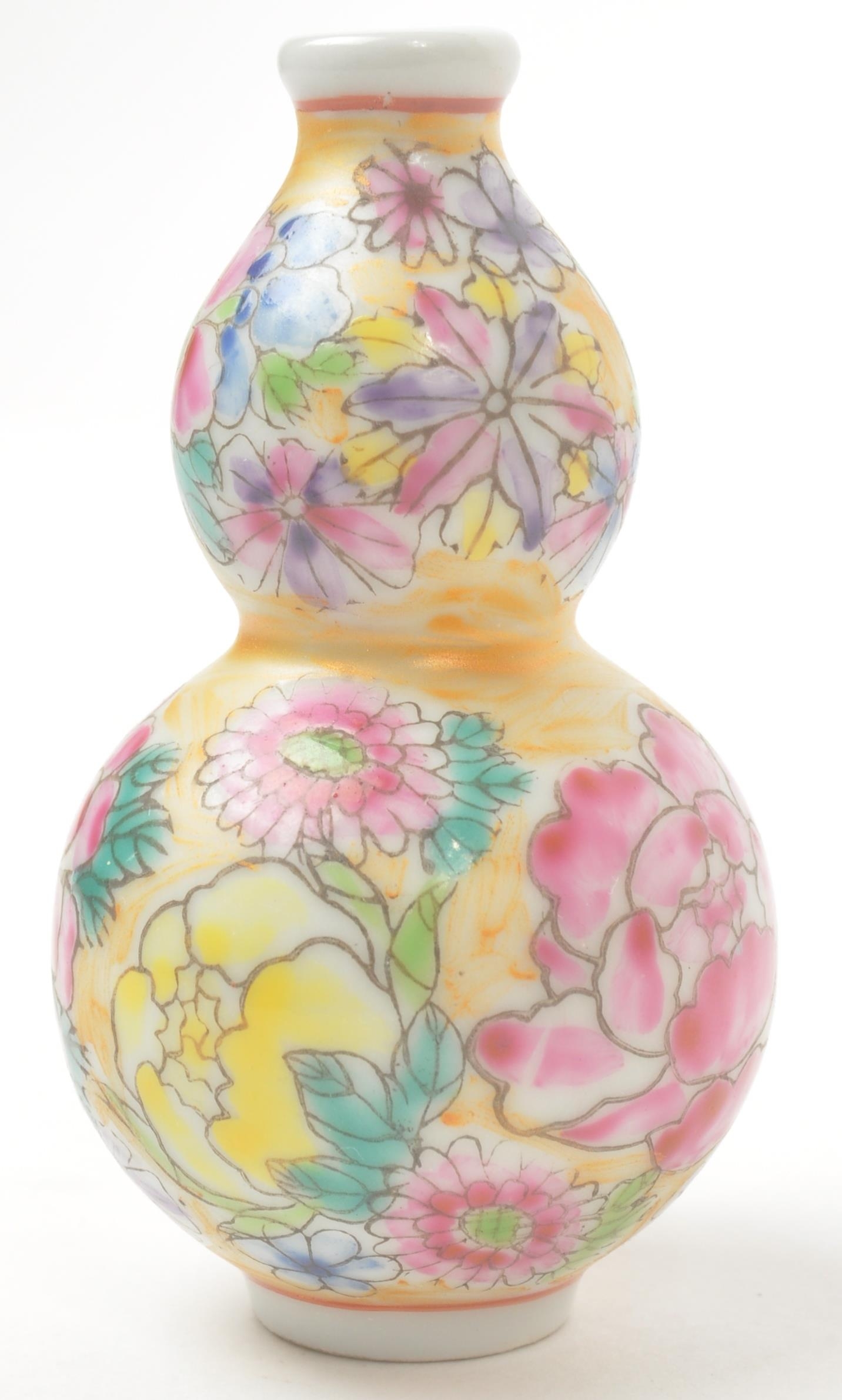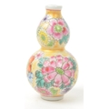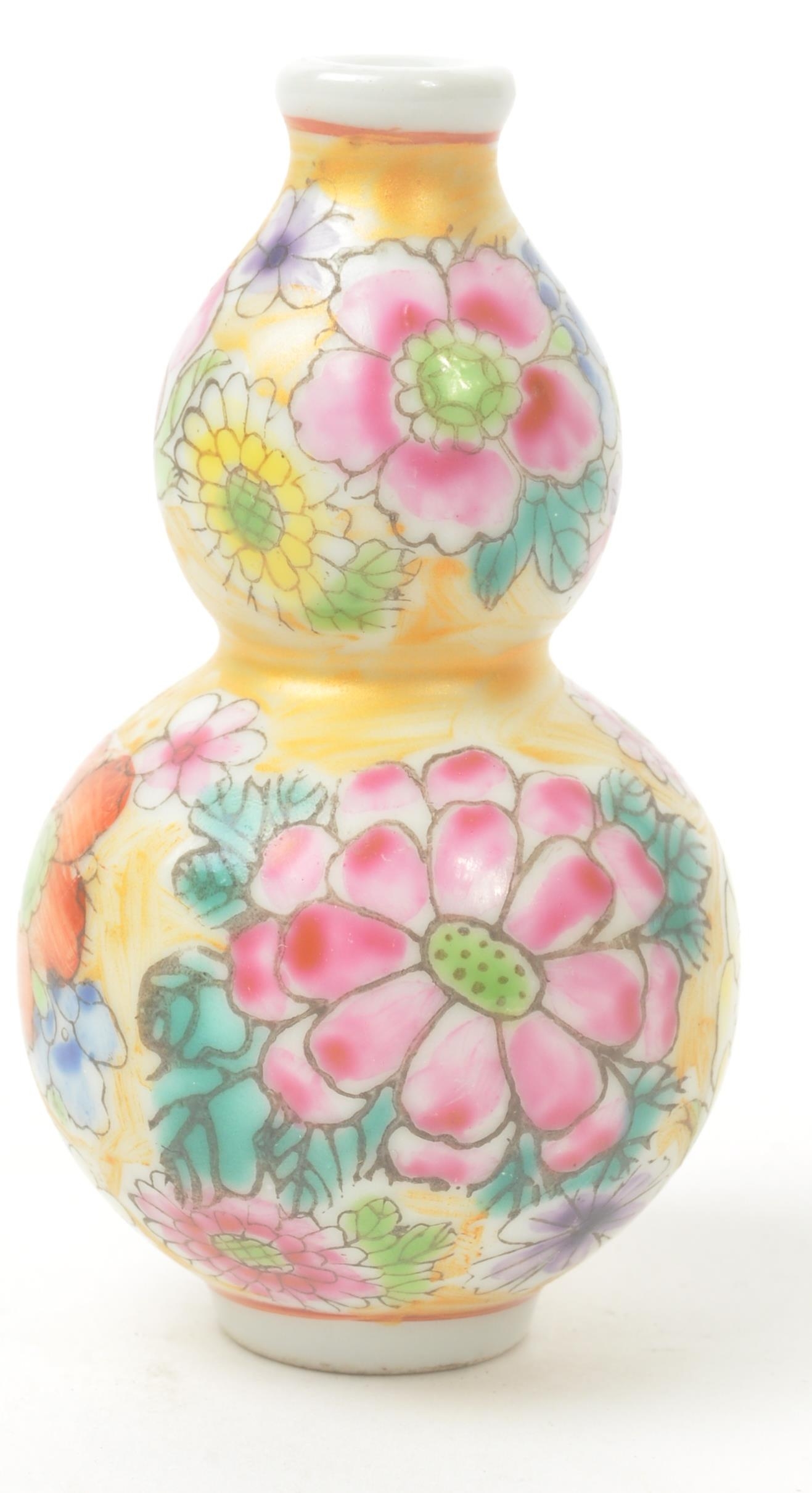 A 19th century circa 1840s Chinese porcelain stem vase / double gourd snuff bottle. Hand painted floral decoration in polychrome. With Chinese characters to base. Measures approx. 8cm tall.