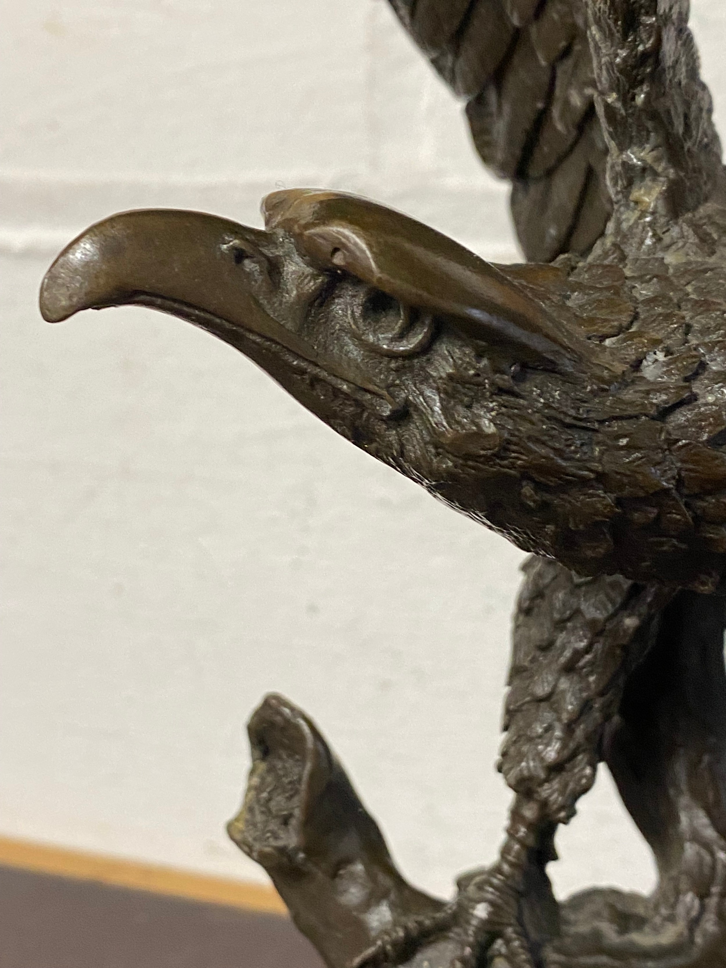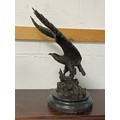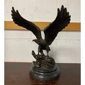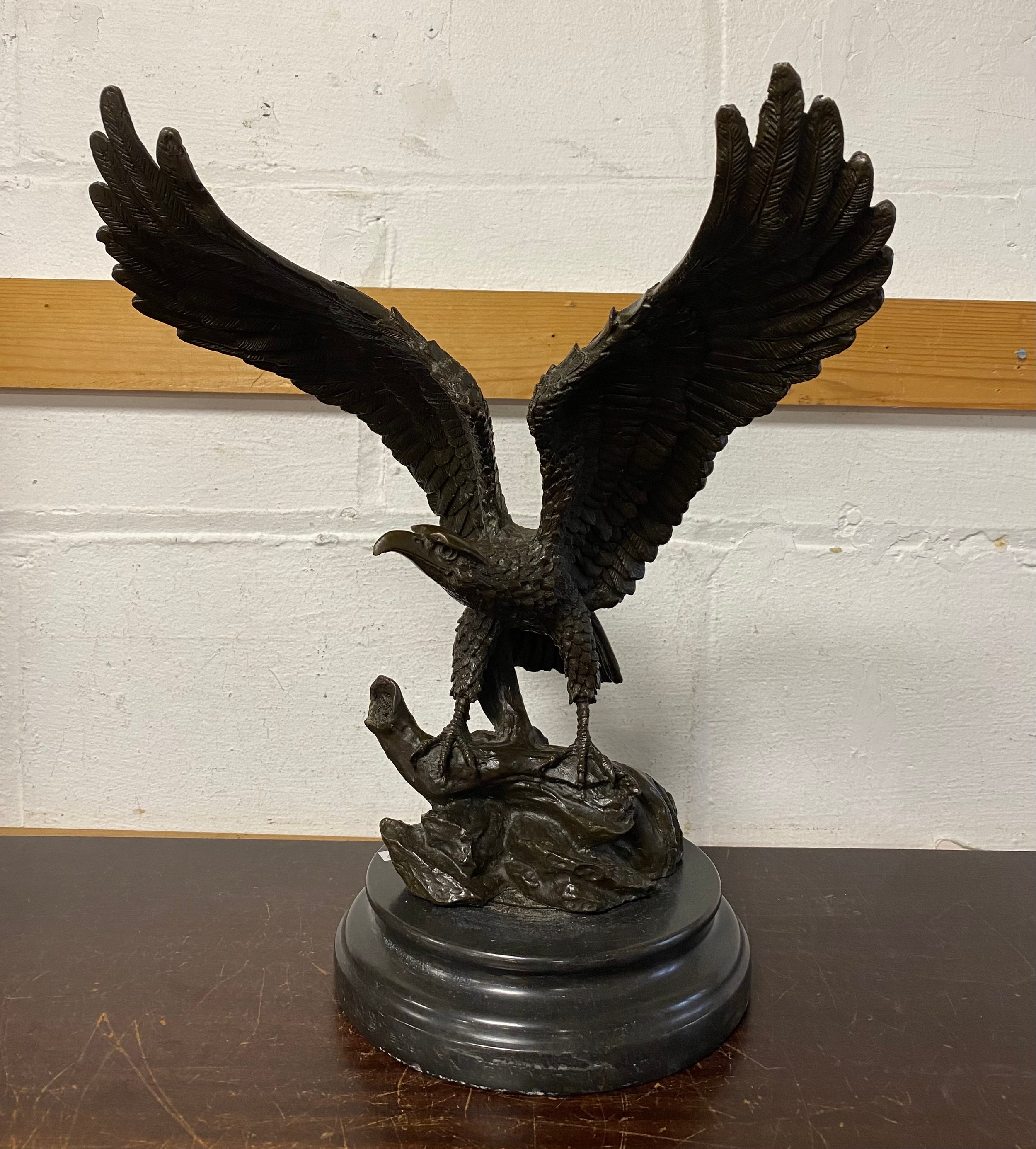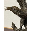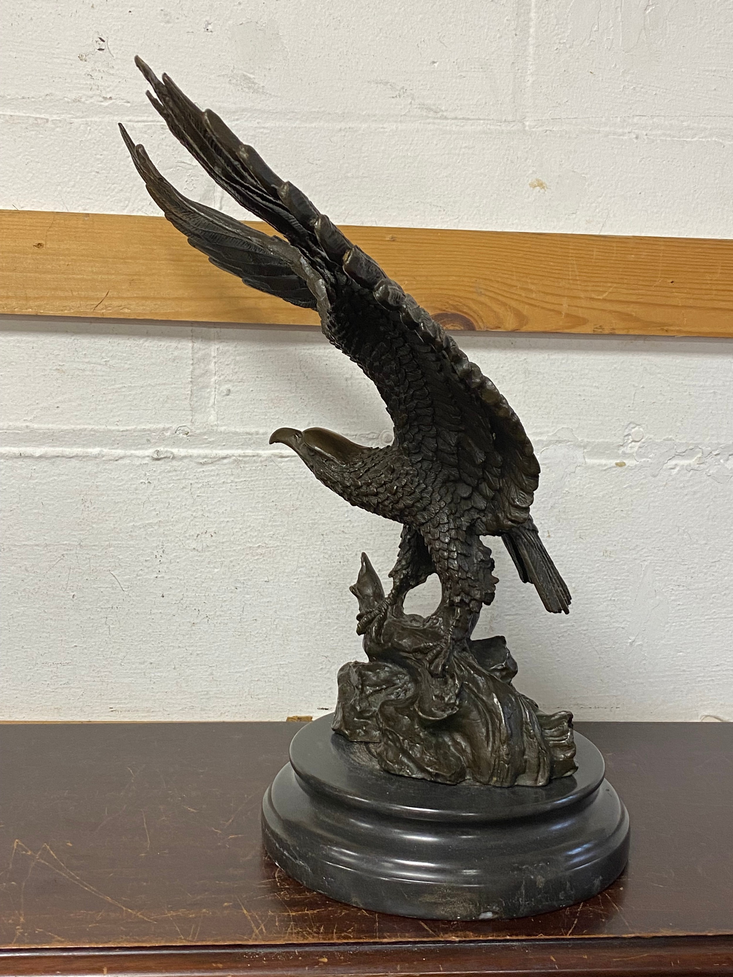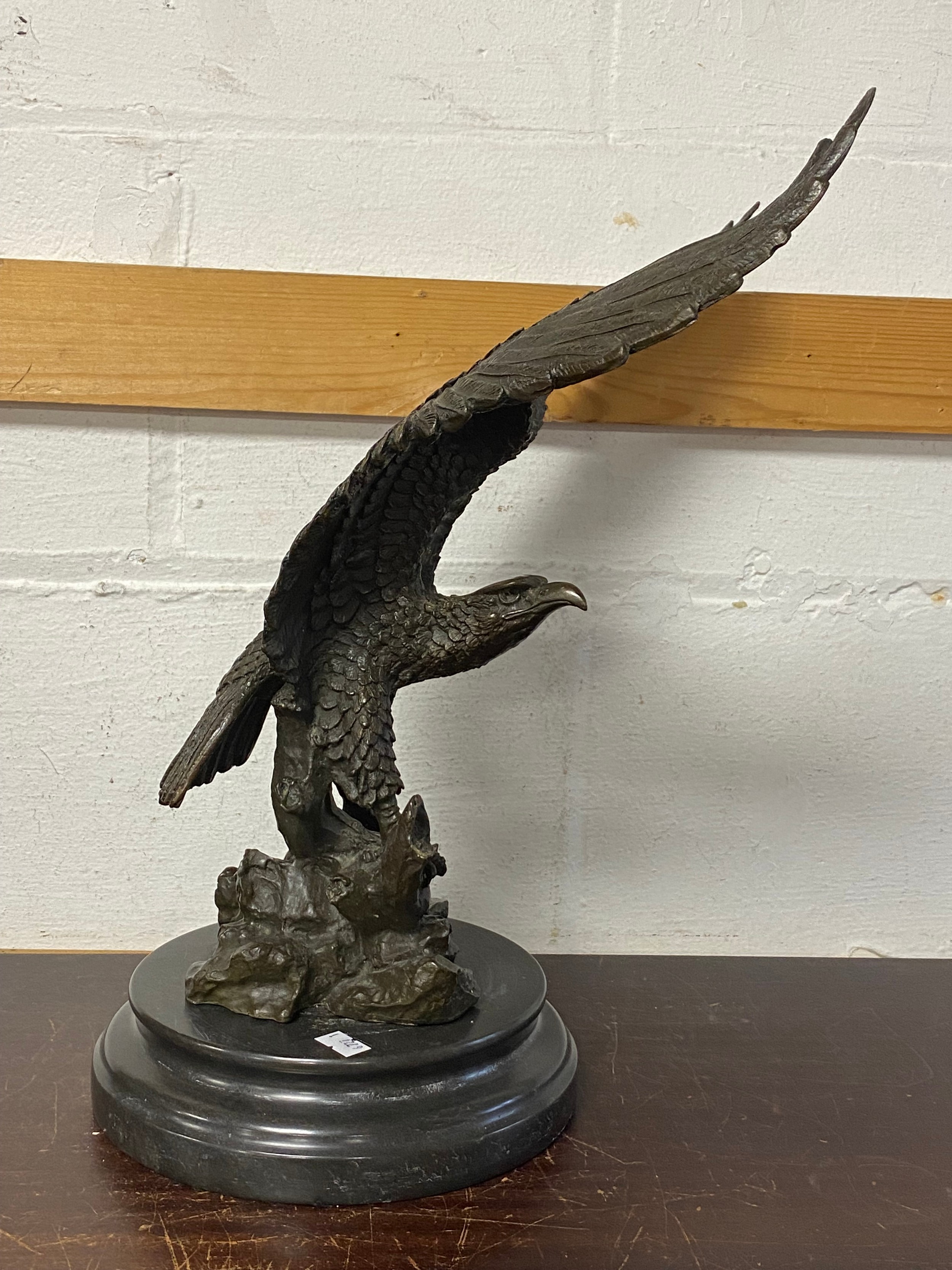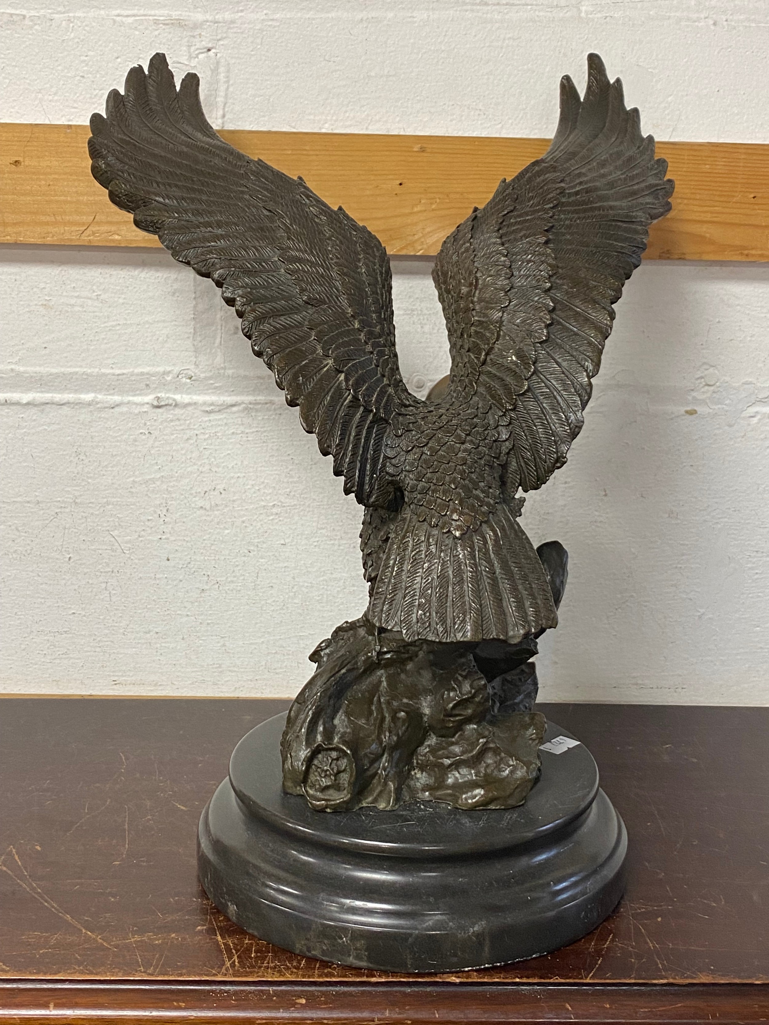 A bronze model of an eagle, with wings outstretched, on circular base -