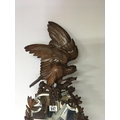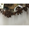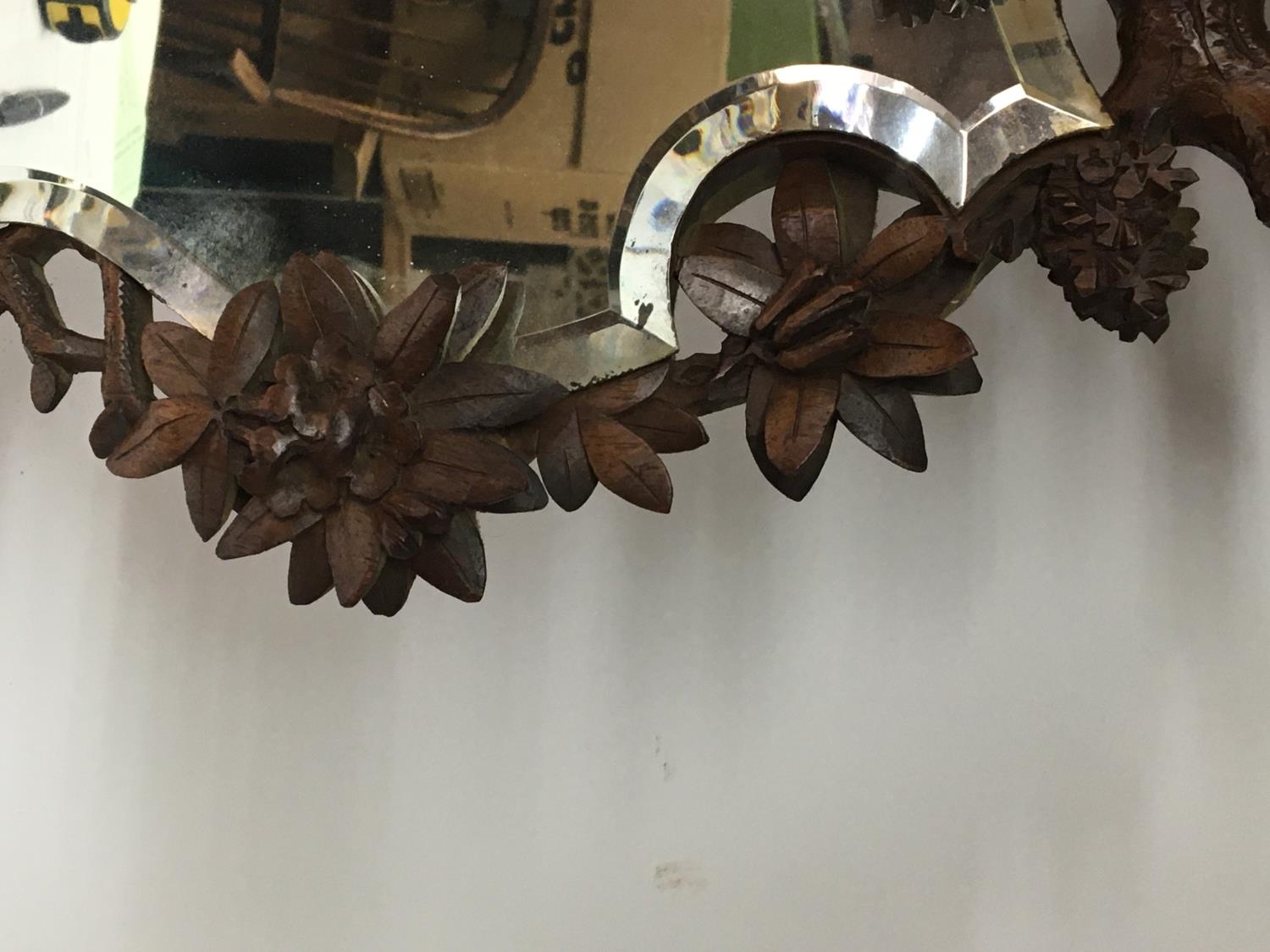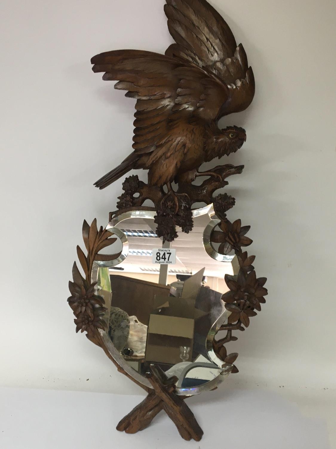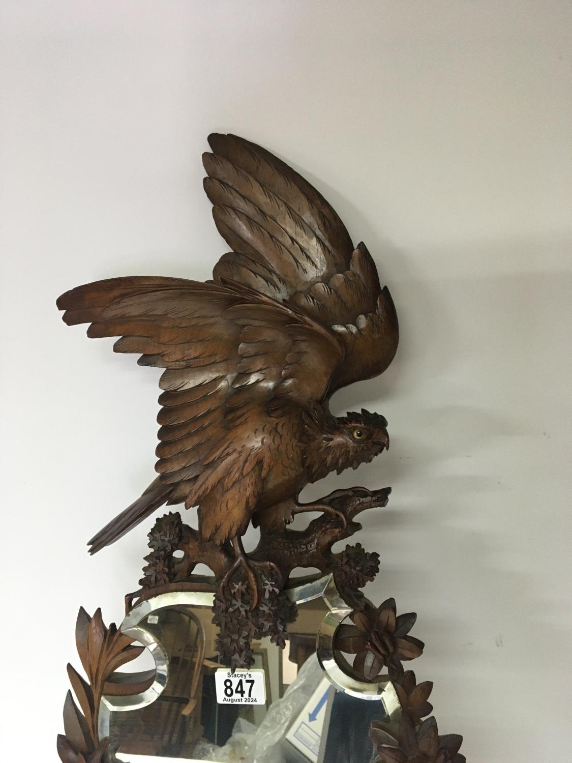 A Quality Black Forest carved wood mirror the top with a bird of prey with glass eyes with a shaped mirror with raised carved flowers and foliage height 73cm