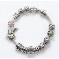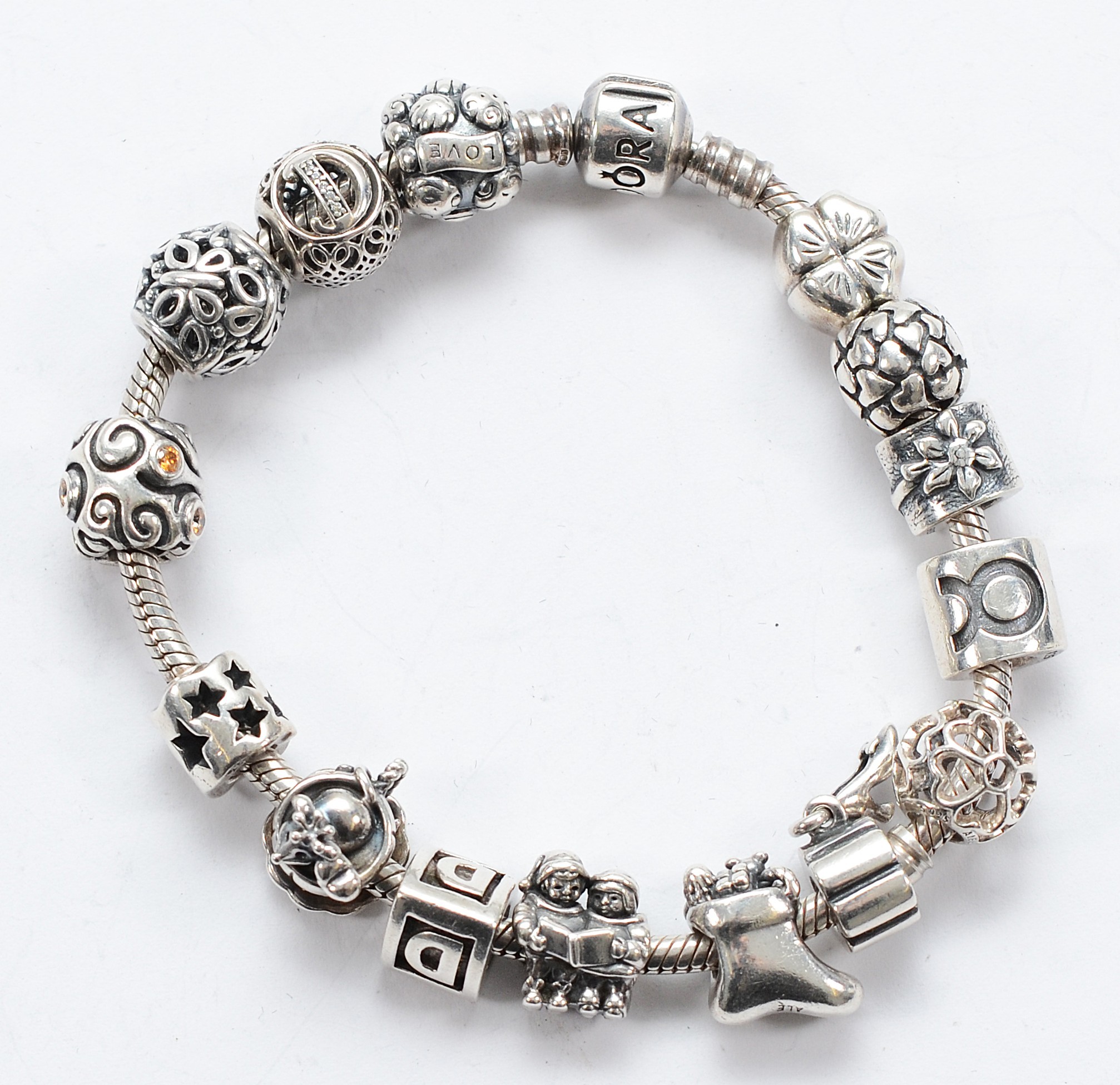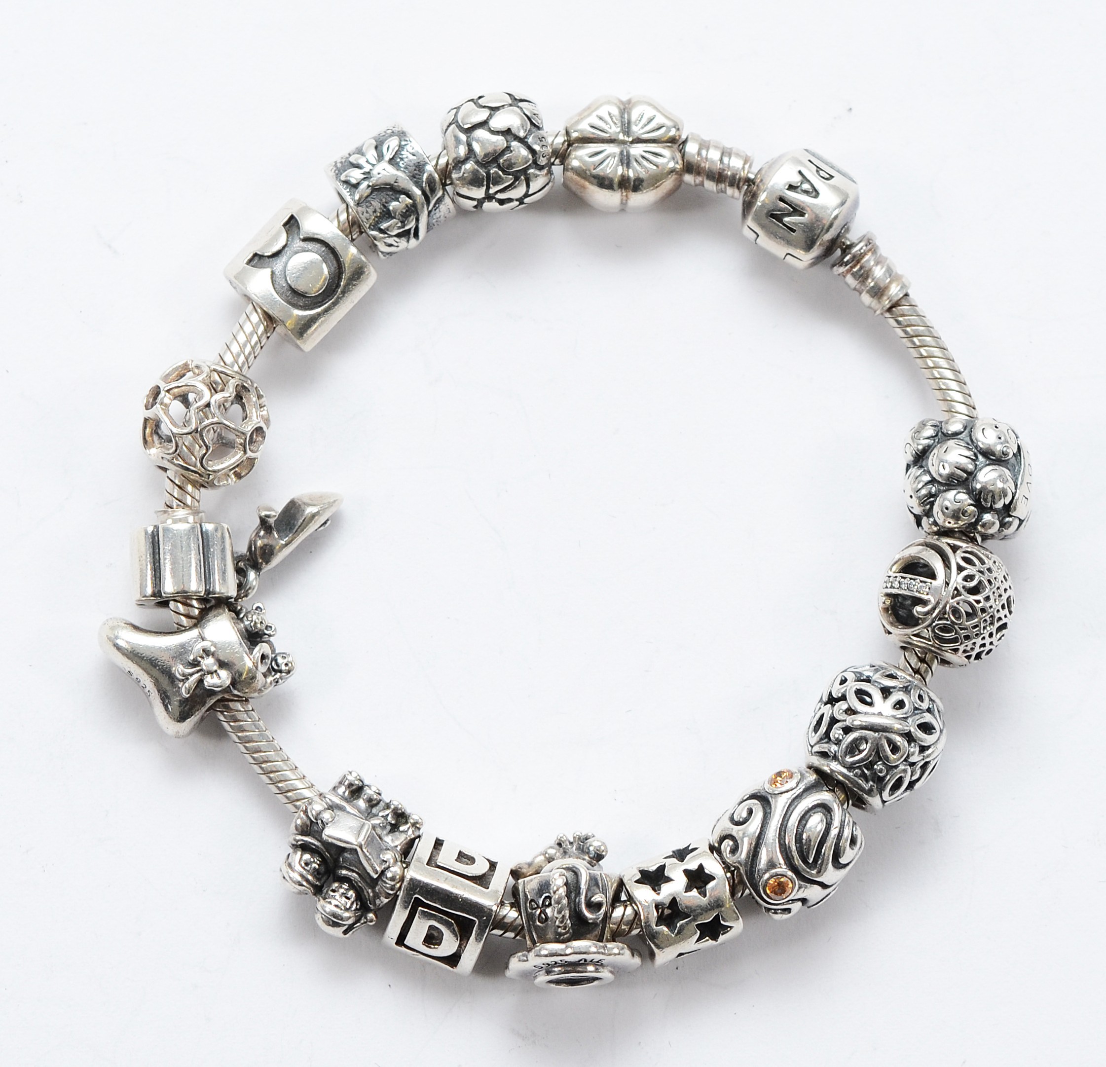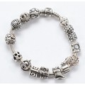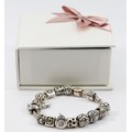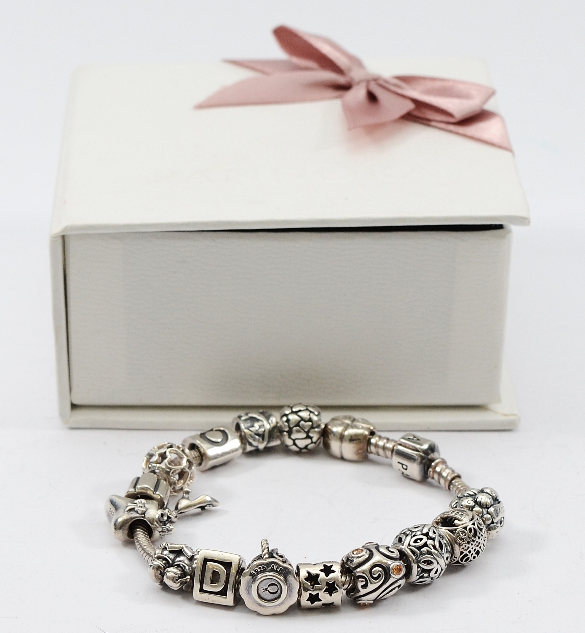 Pandora, a silver charm bracelet with fifteen charms, 64g
