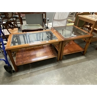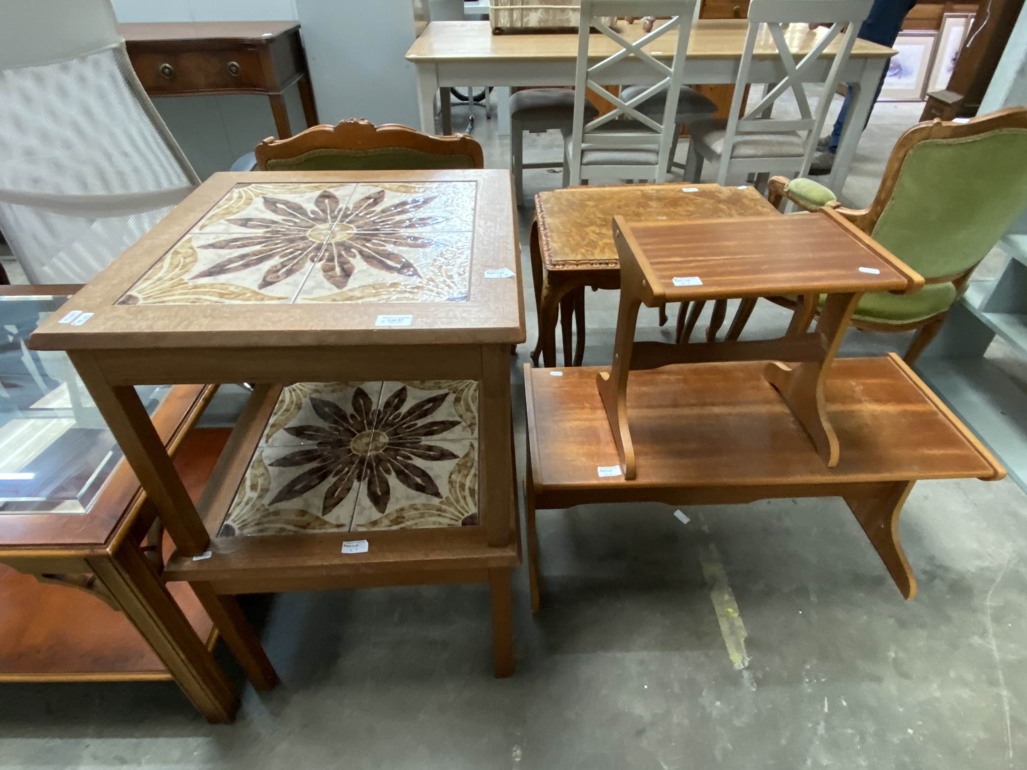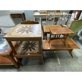 2 mid century teak & tiled top occasional tables 41H 53W 53D, mid century teak coffee table etc