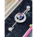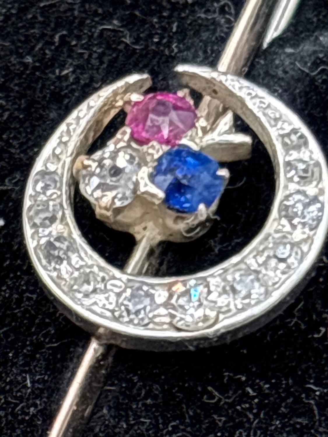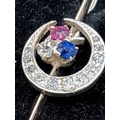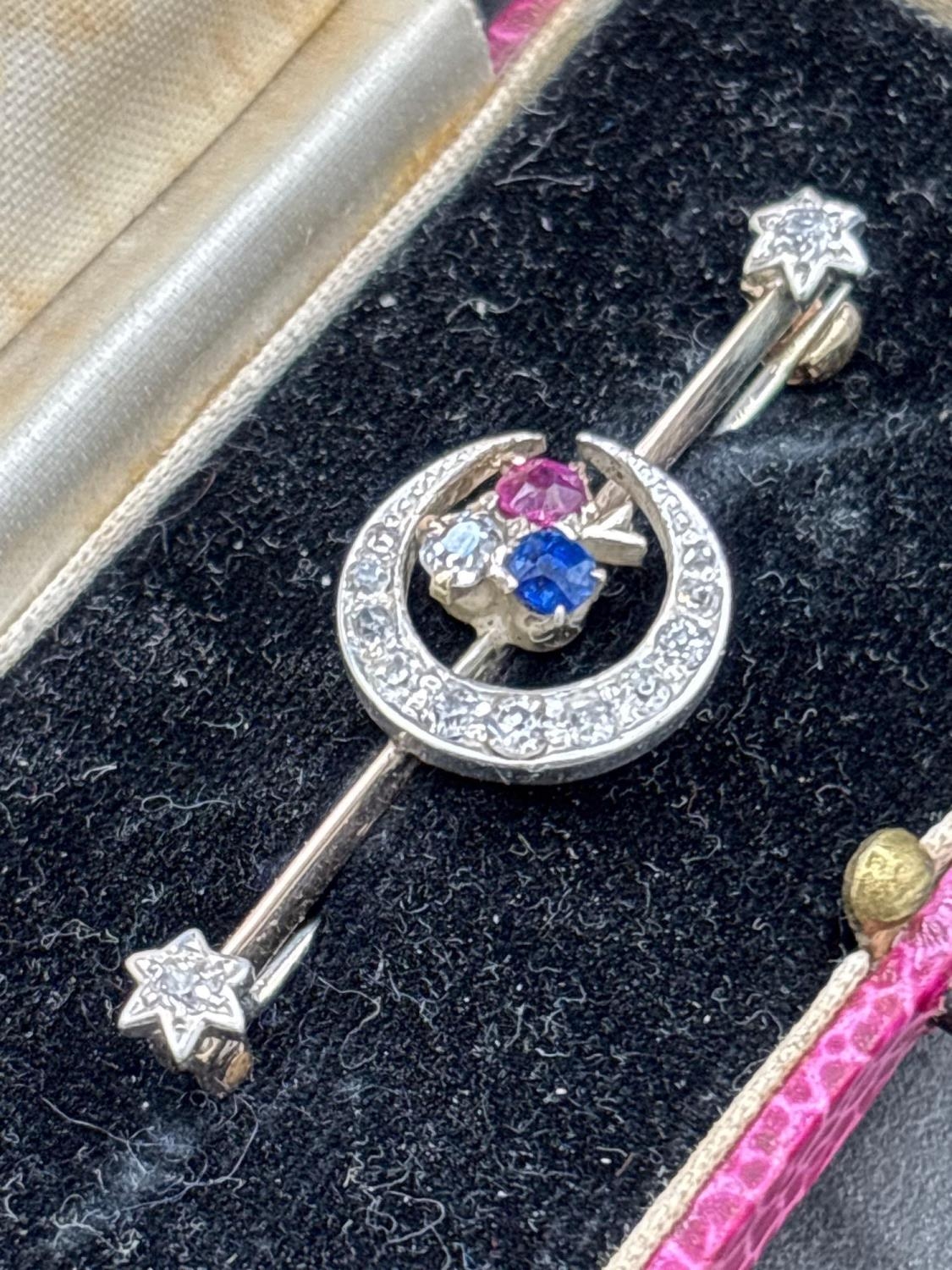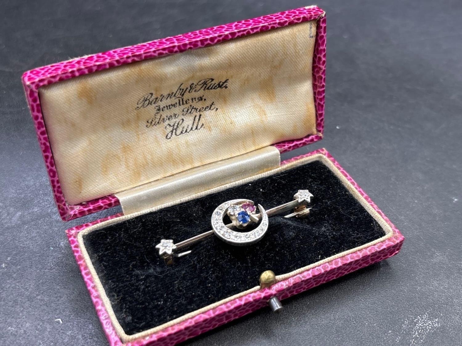 Antique Edwardian diamond set crescent brooch with sapphire and ruby highlights in original box by Barnby and Rust, Hull
