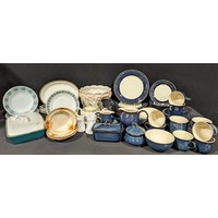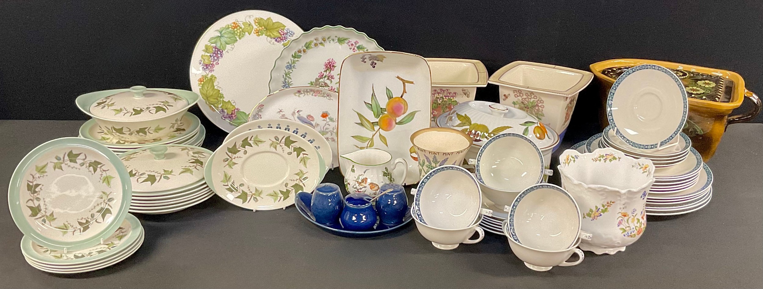 A Royal Doulton Moonstone pattern dinner service for six, comprising dinner plates, dessert plates, side plates, soup dishes and stands; a Wedgwood Hereford pattern part dinner service; a Royal Worcester Vine Harvest cake stand; Evesham; Aynsley; etc, qty