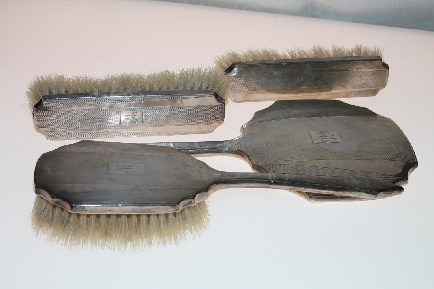 Silver backed four-piece vanity set.