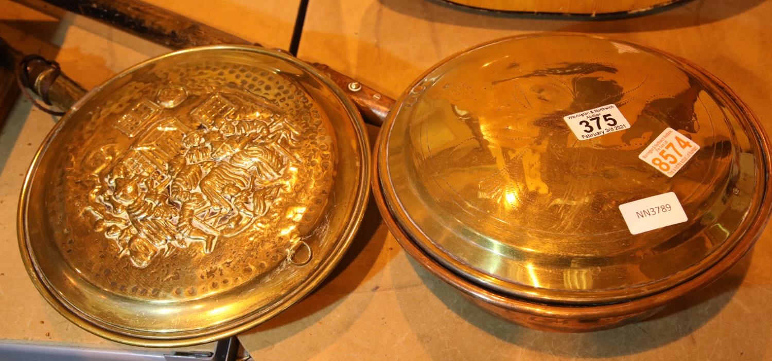 Two copper and brass bedpans. Not available for in-house P&P, contact Paul O'Hea at Mailboxes on 01925 659133