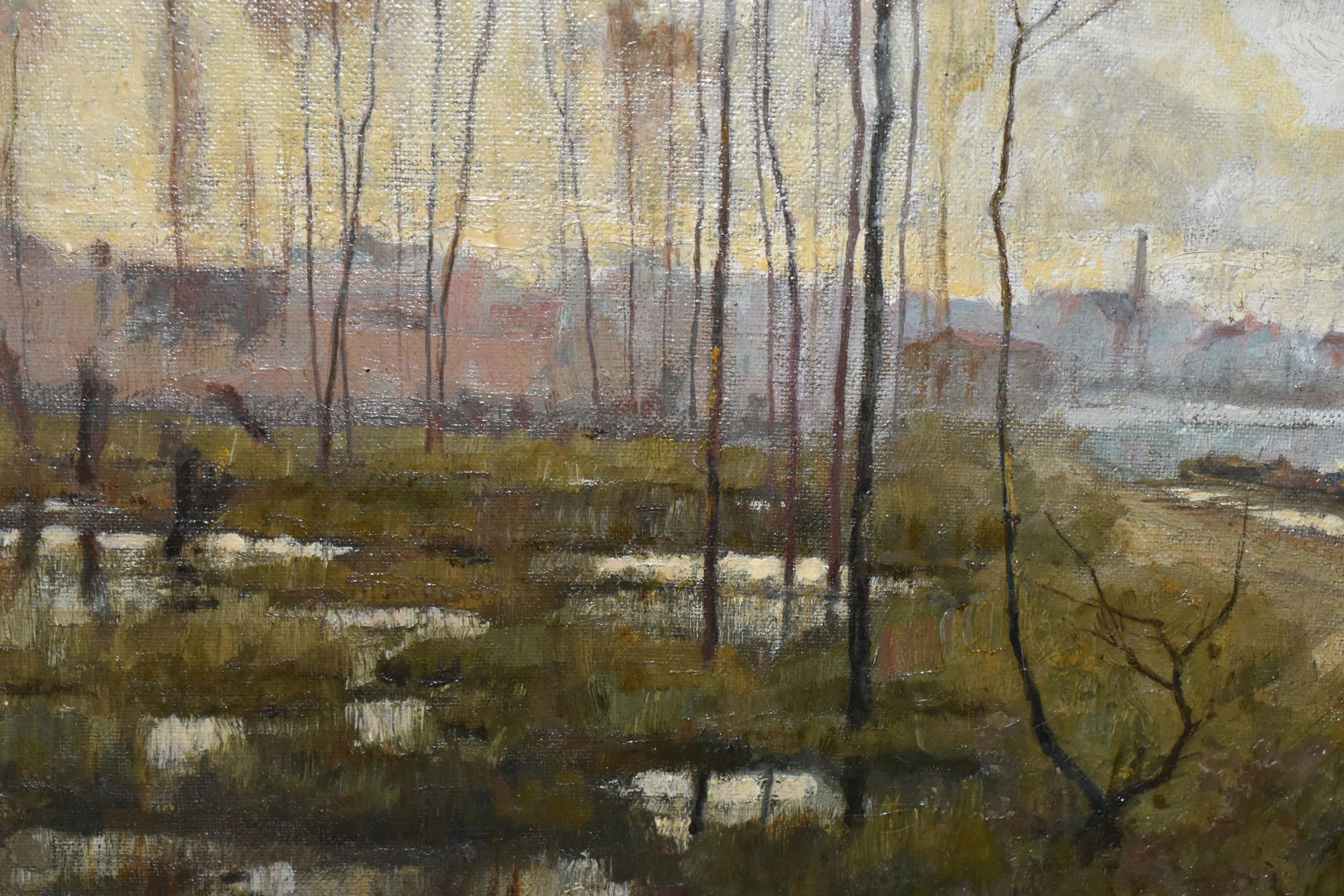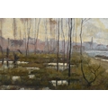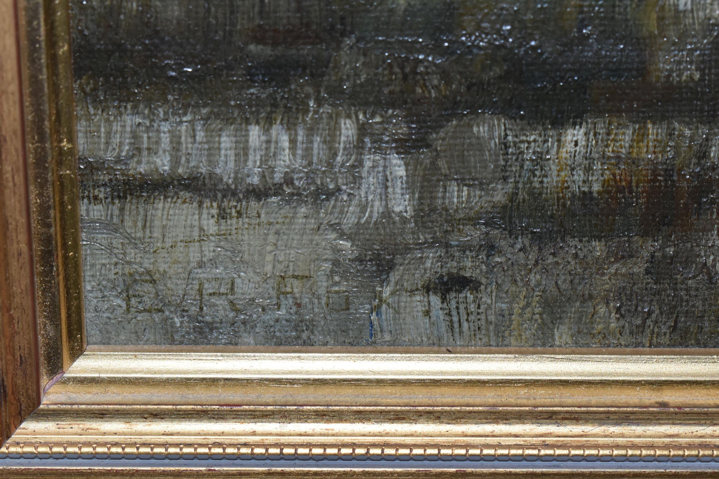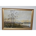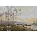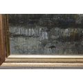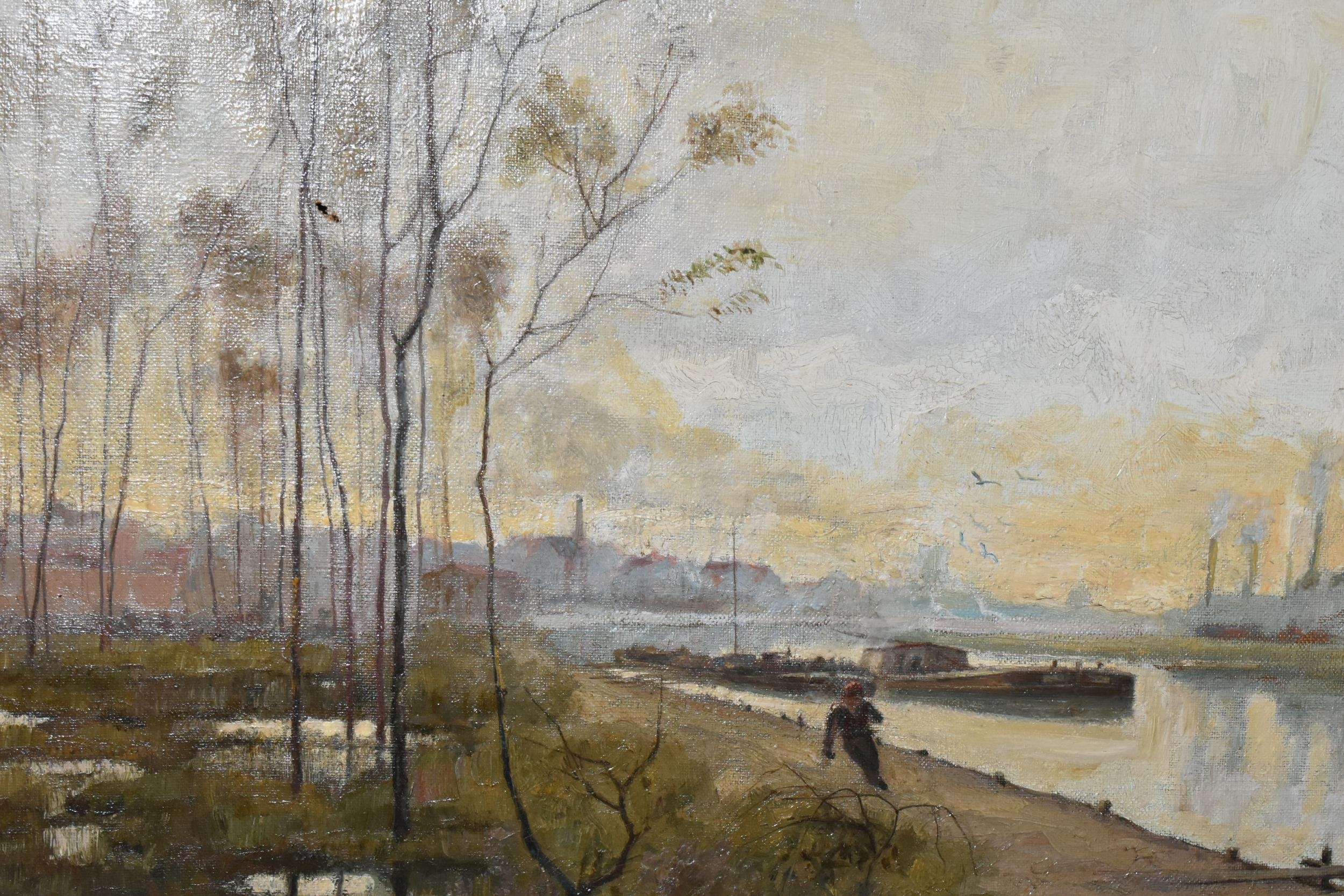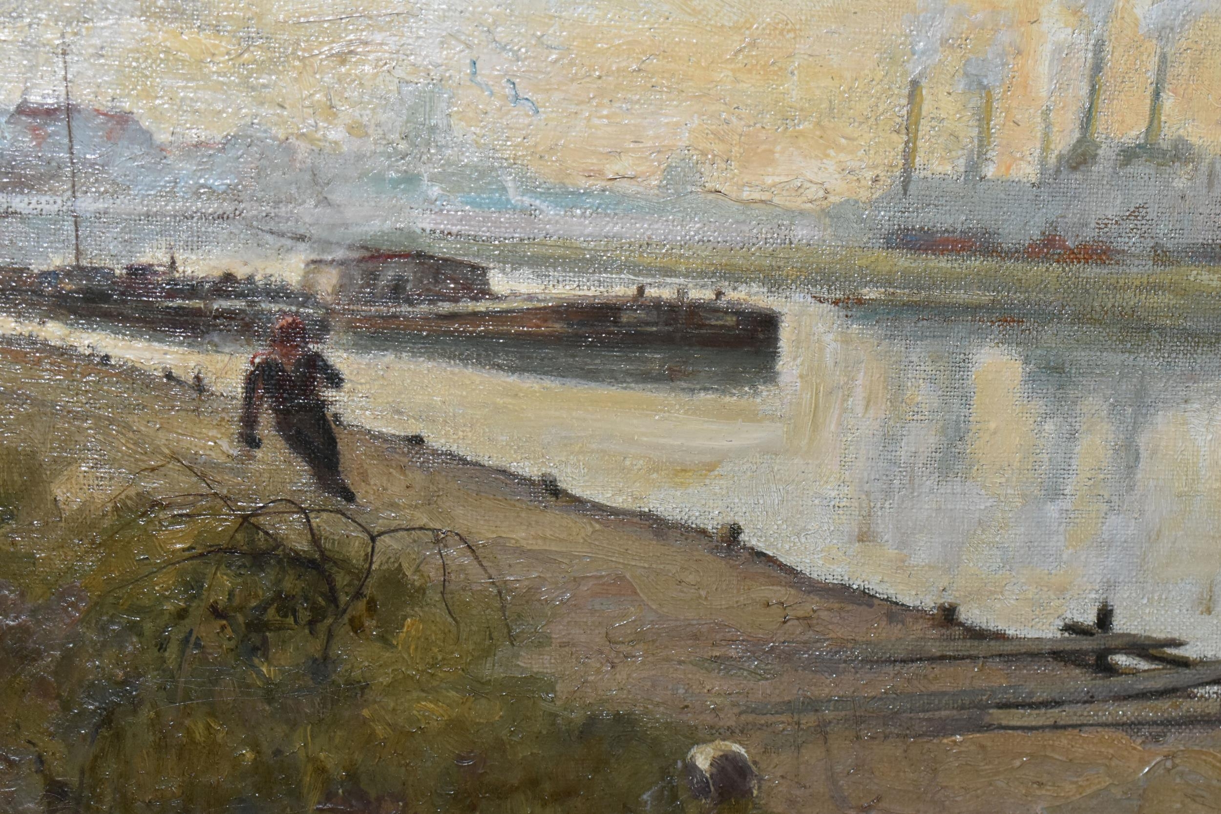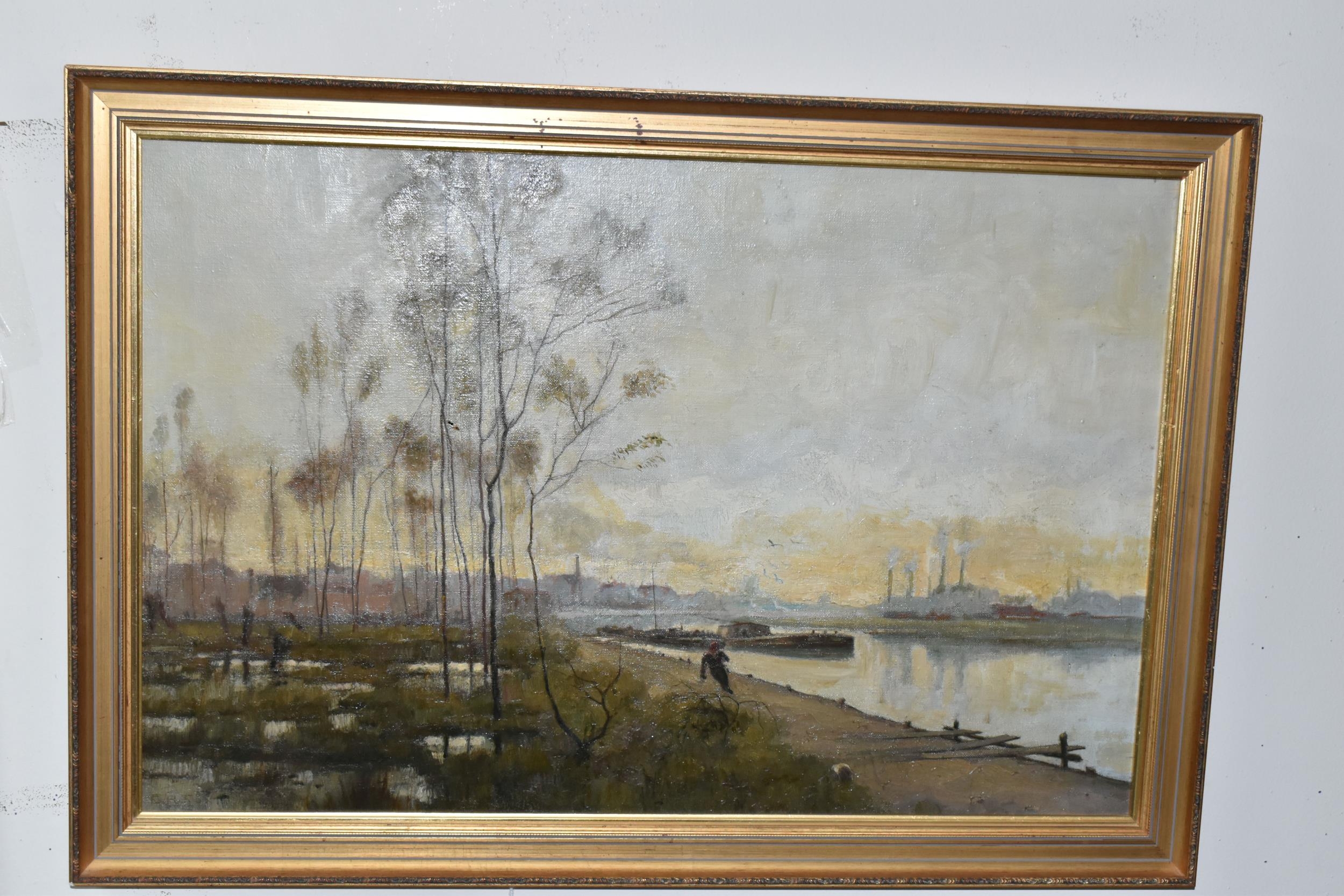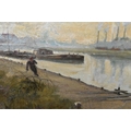 ERNEST R FOX (1862-1917) AN INDUSTRIAL WATERWAY SCENE, depicting working barges on a river with industrial building beyond, signed bottom left, oil on canvas, approximate size 48cm x 74cm, Condition Report: patched repairs verso with a 1cm hole towards the middle