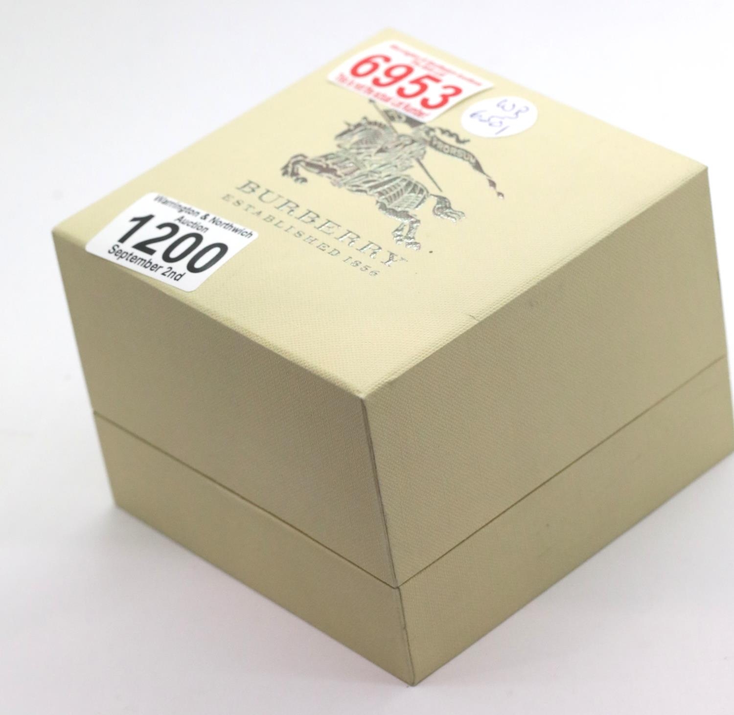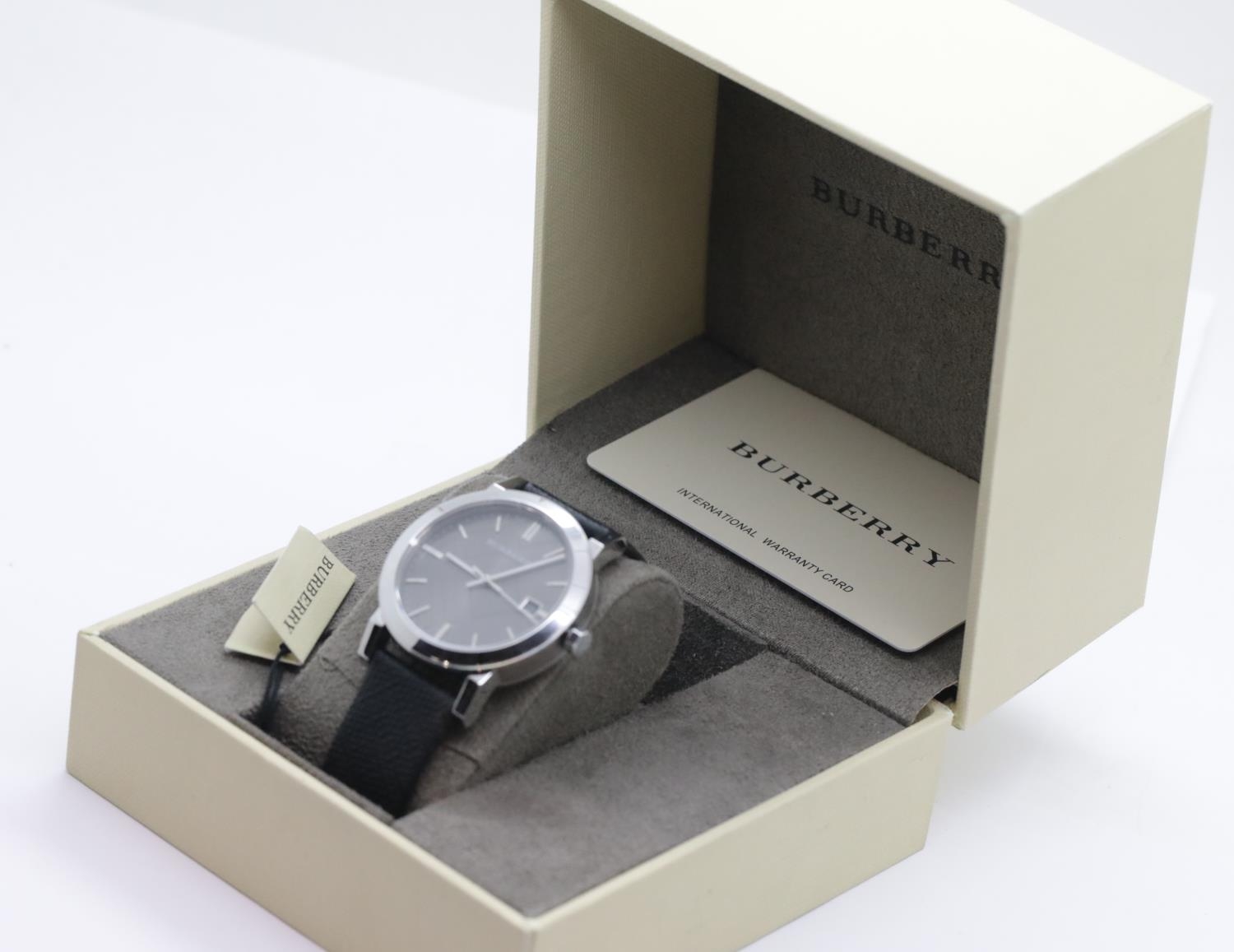 Boxed gents Burberry calendar wristwatch. P&P Group 1 (£14+VAT for the first lot and £1+VAT for subsequent lots)