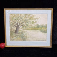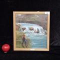 An original oil on board painting. Features a waterfall landscape. Rendered in smooth brushstrokes with delicate stippling detailing. Portrays earthy shades with soft white and deep orange highlights. Signed 'Albert' lower right. Housed in a wooden frame behind glass. behind glass.