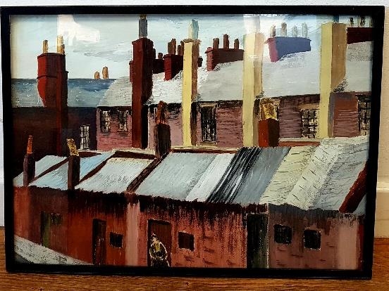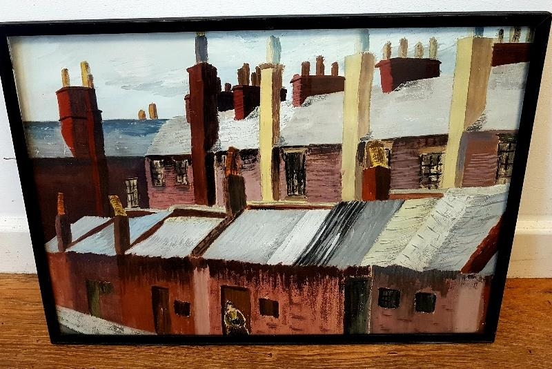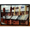 Framed and Glazed watercolour of mining town terraced rooftops, unsigned. Size is 21 inches x 15 inches