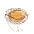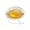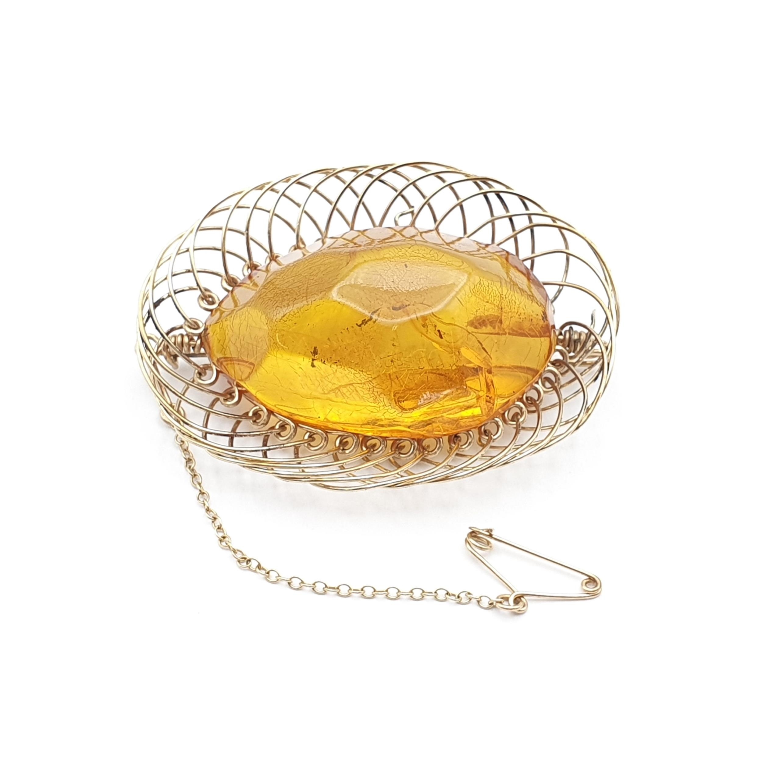 An Amber Brooch in twisted gold metal frame with safety chain, approx 58mm x 44mm, total weight approx 14gms